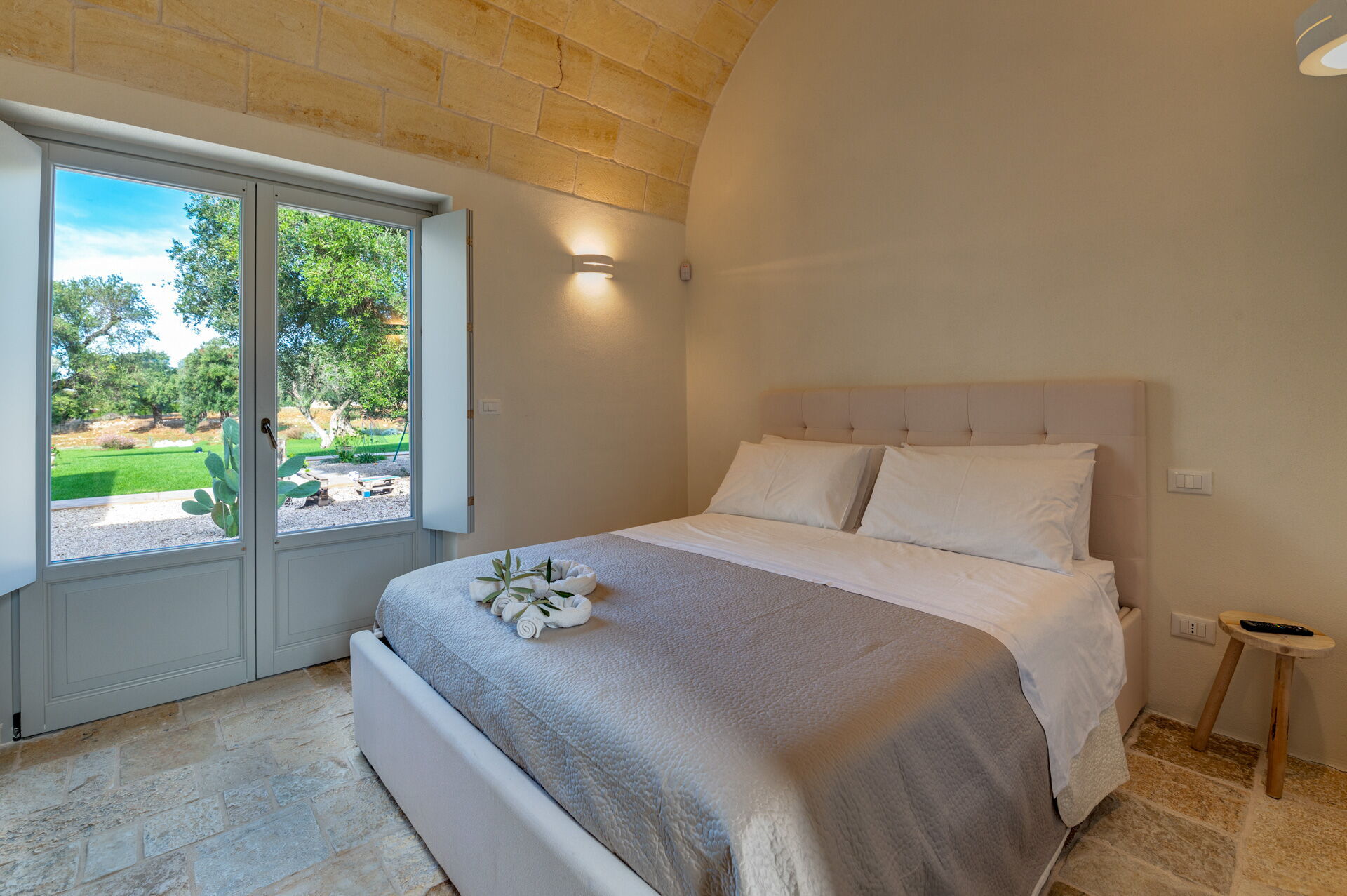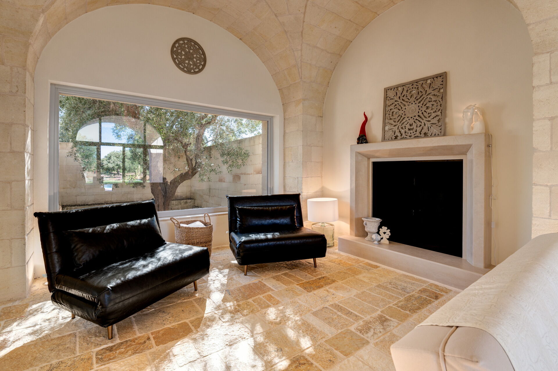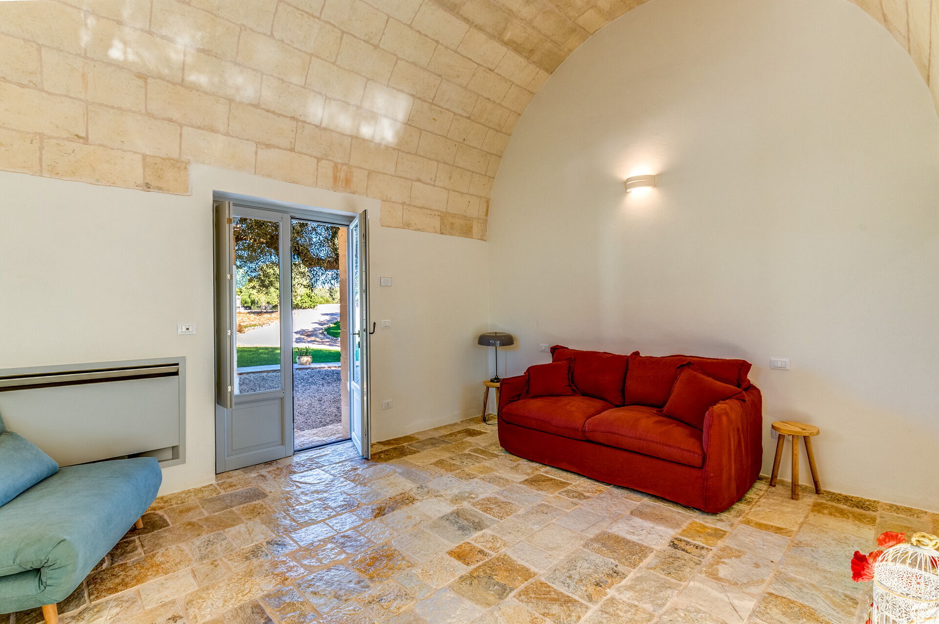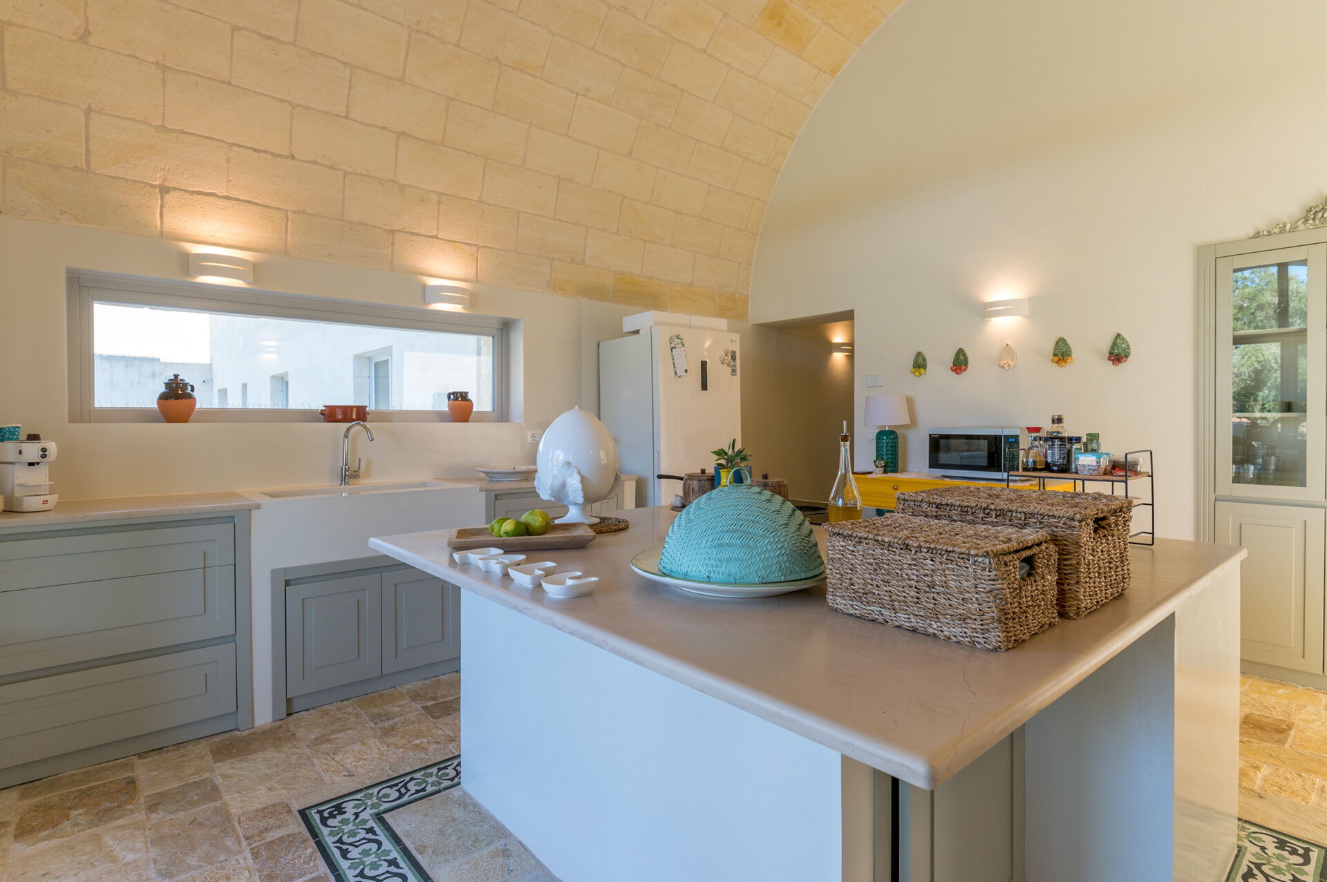 Der Innenbereich der Villa zeichnet sich durch edle Einrichtung und Helligkeit aus, aufgrund der großen Fenster aus, die perfekt mit der traditionellen architektonischen Struktur des Salento (gewölbte Decken, Steinmauern und weiße Wände) harmonieren.