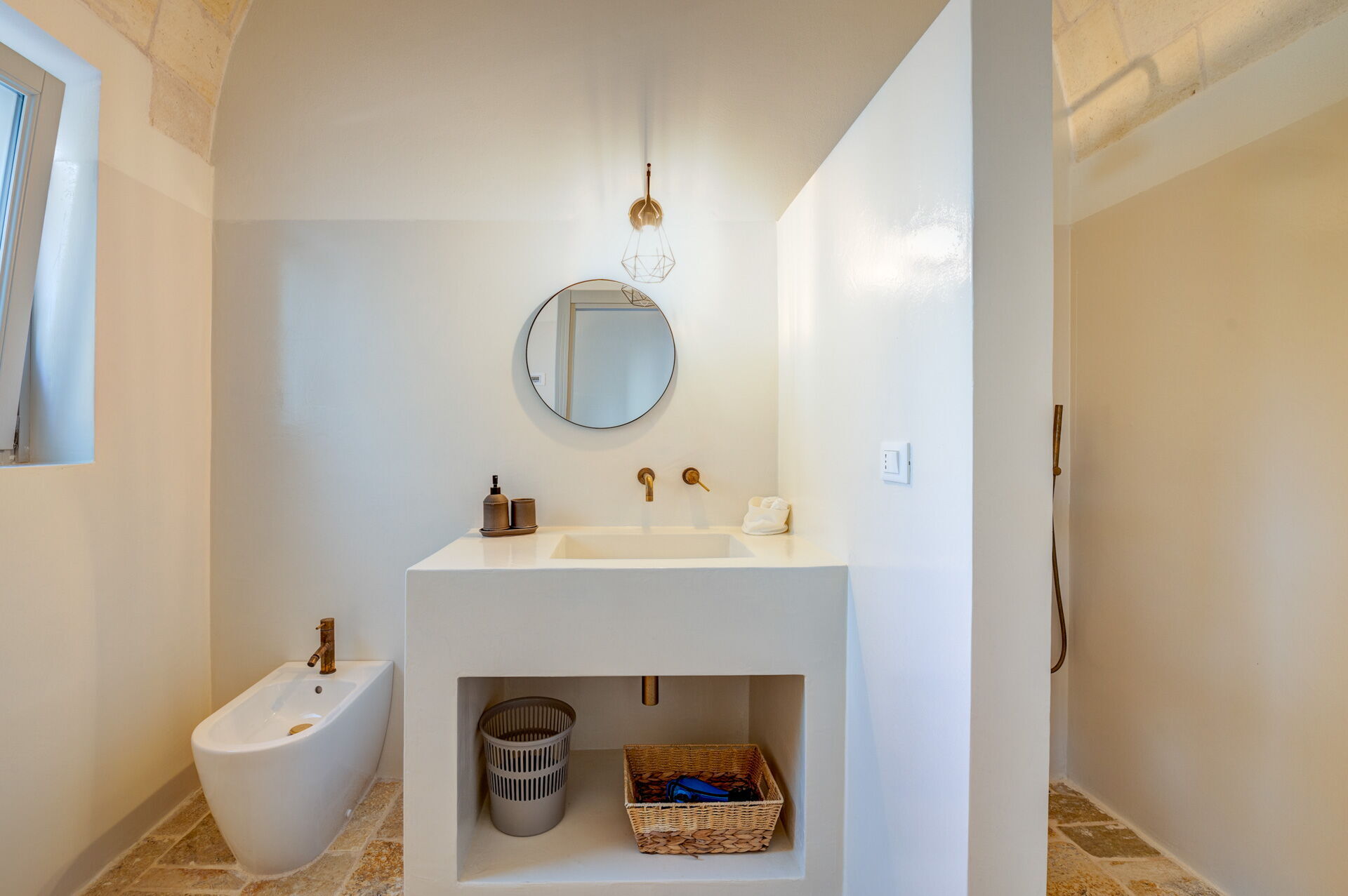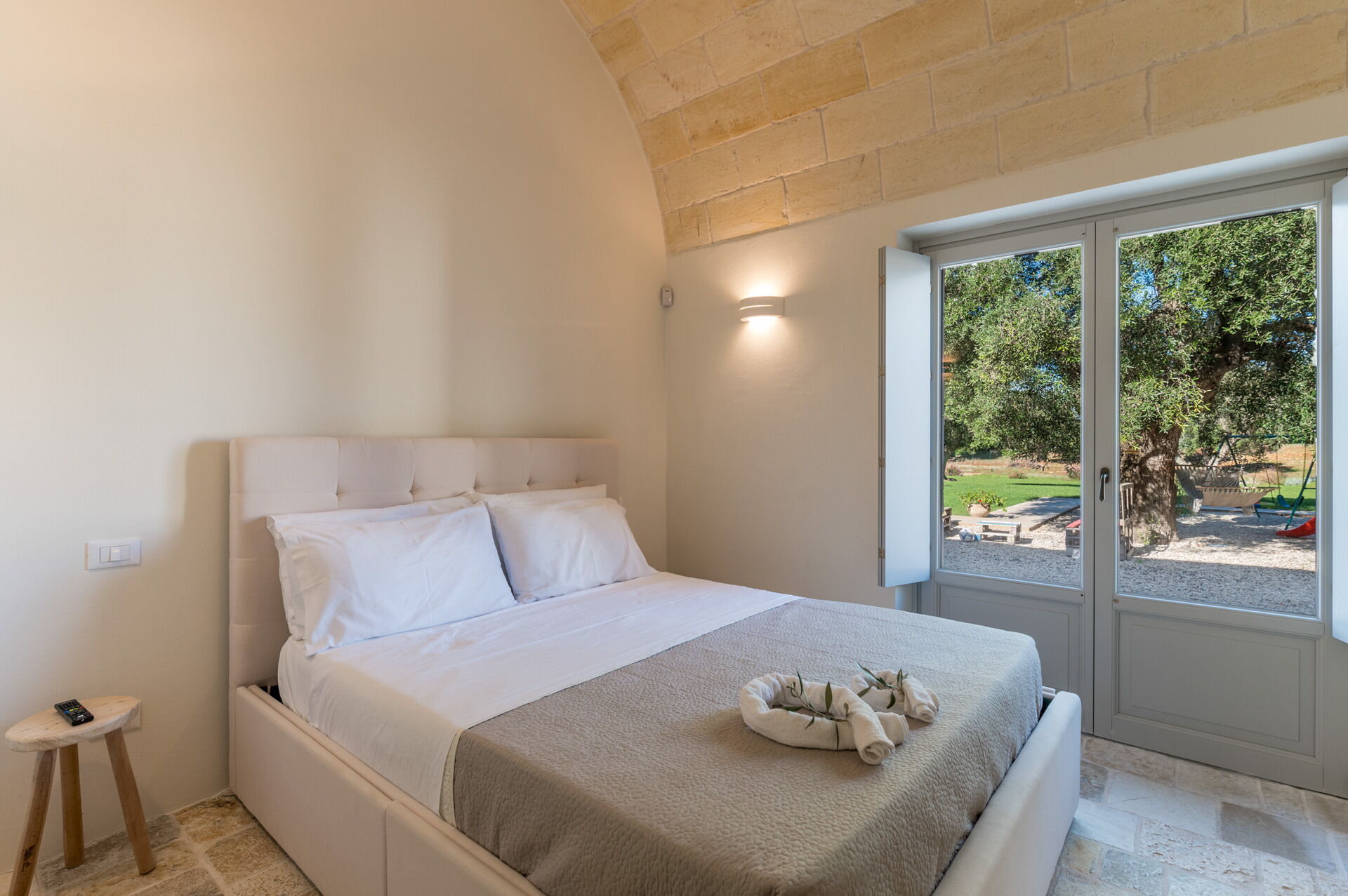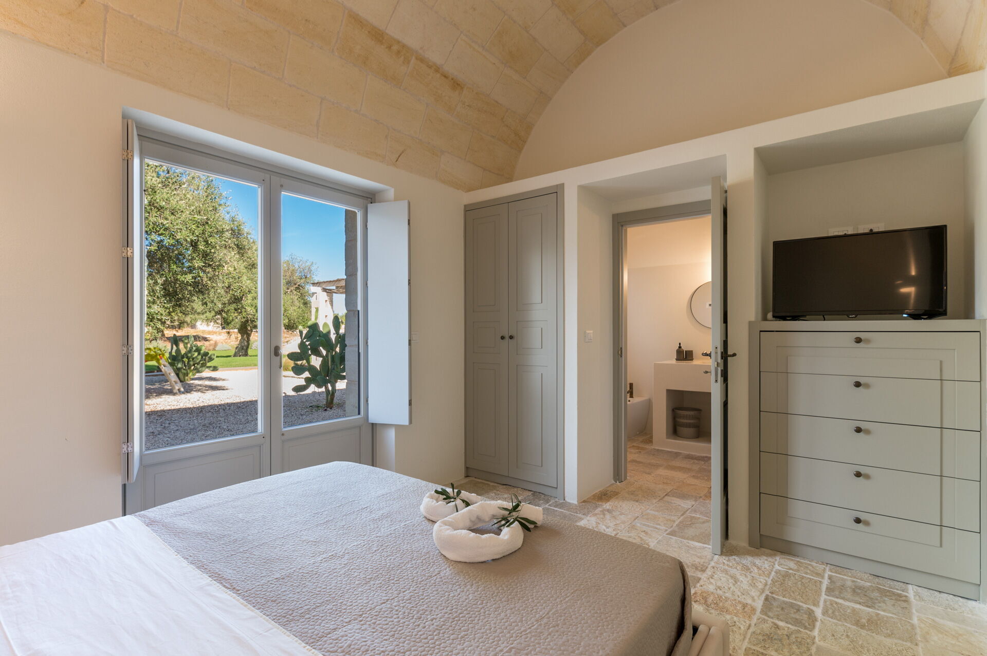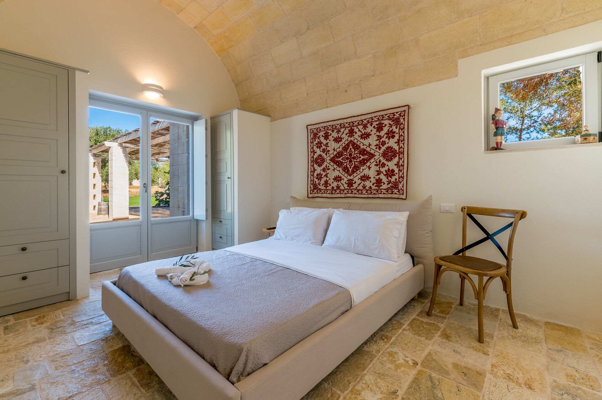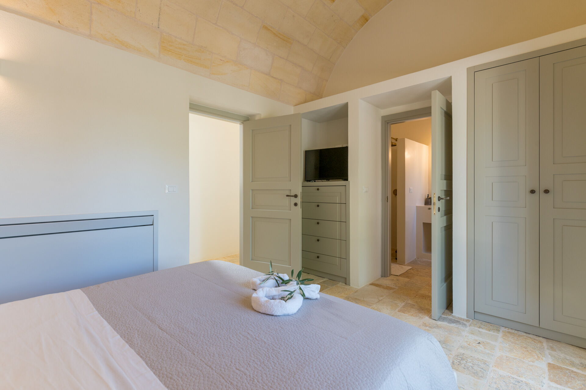Der Innenbereich der Villa zeichnet sich durch edle Einrichtung und Helligkeit aus, aufgrund der großen Fenster aus, die perfekt mit der traditionellen architektonischen Struktur des Salento (gewölbte Decken, Steinmauern und weiße Wände) harmonieren.