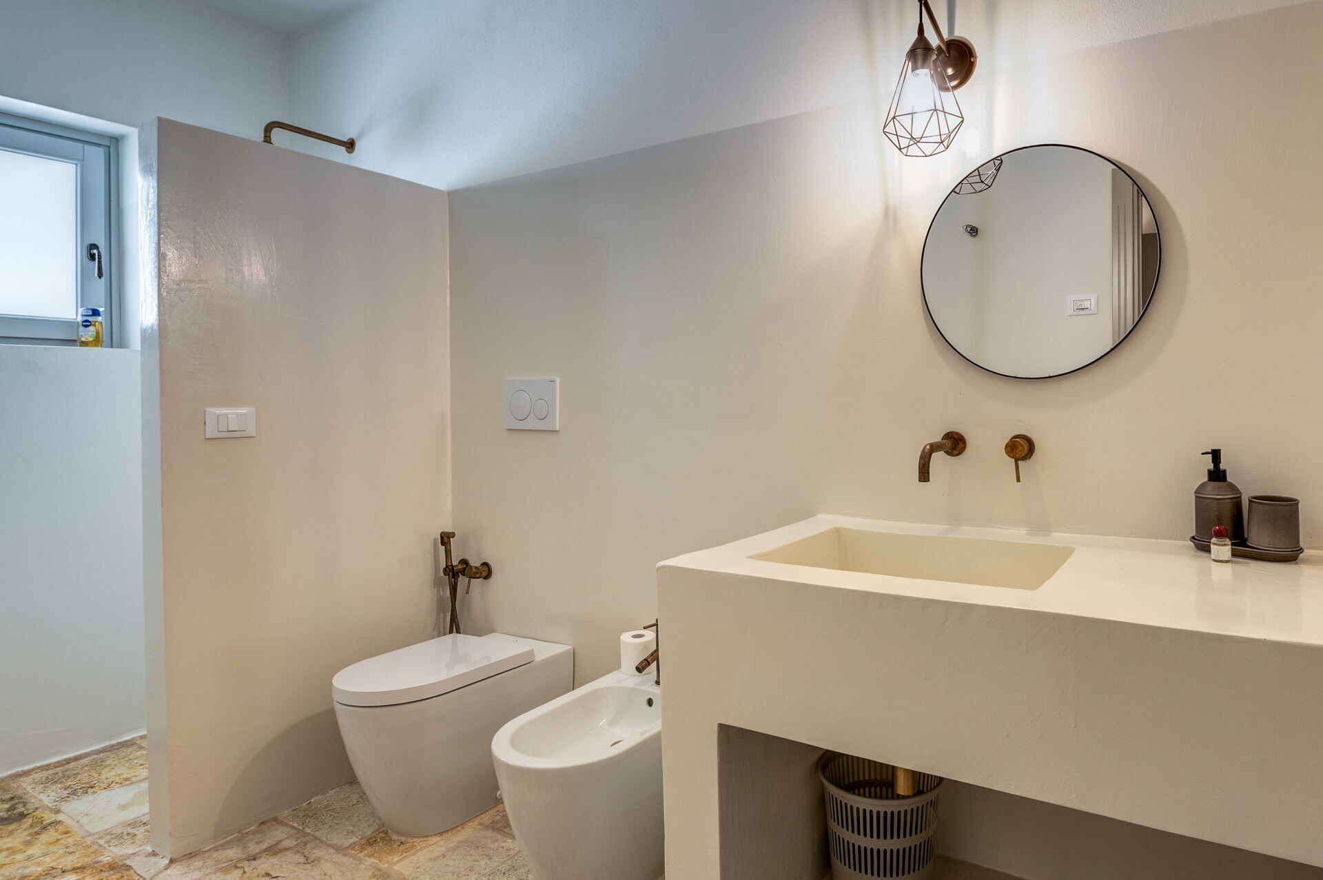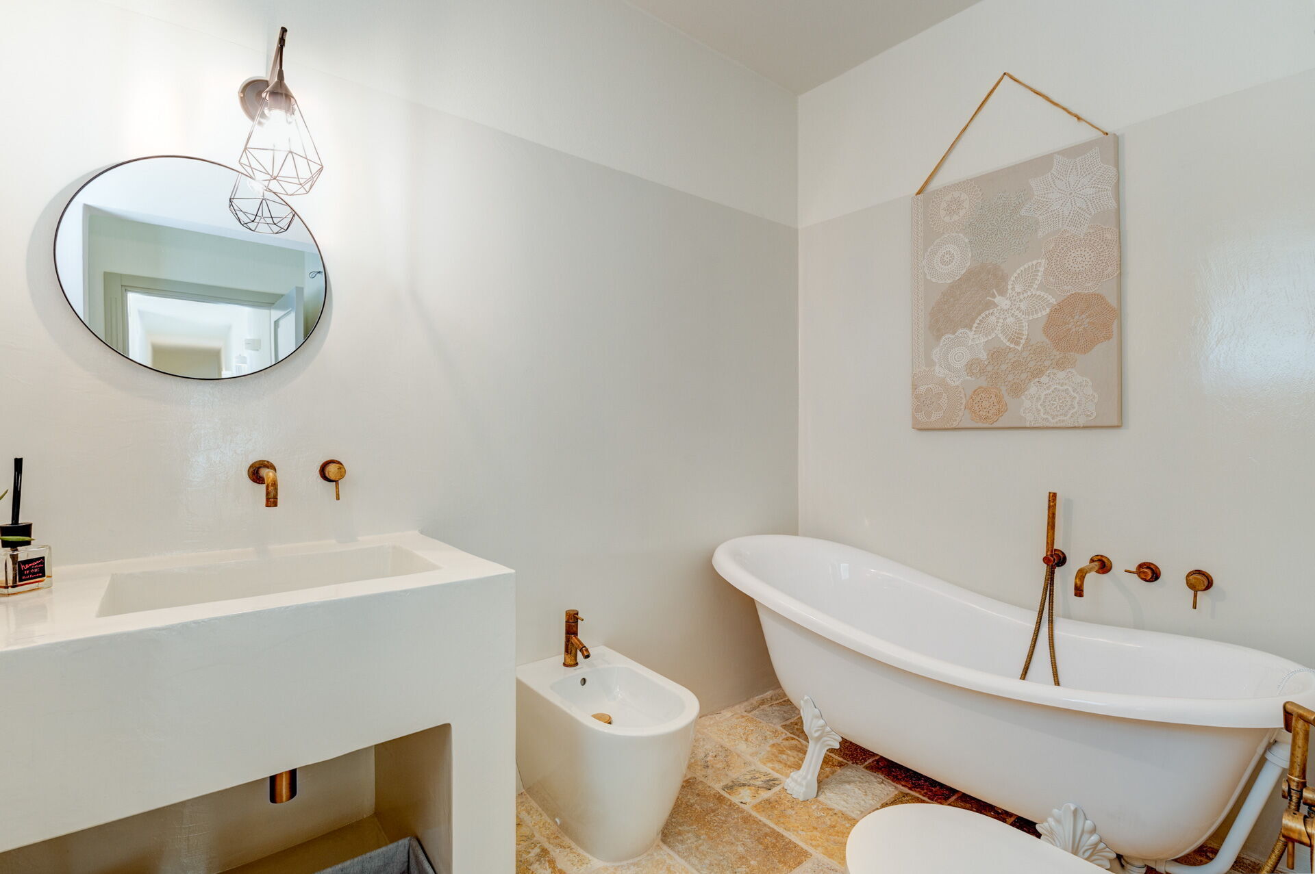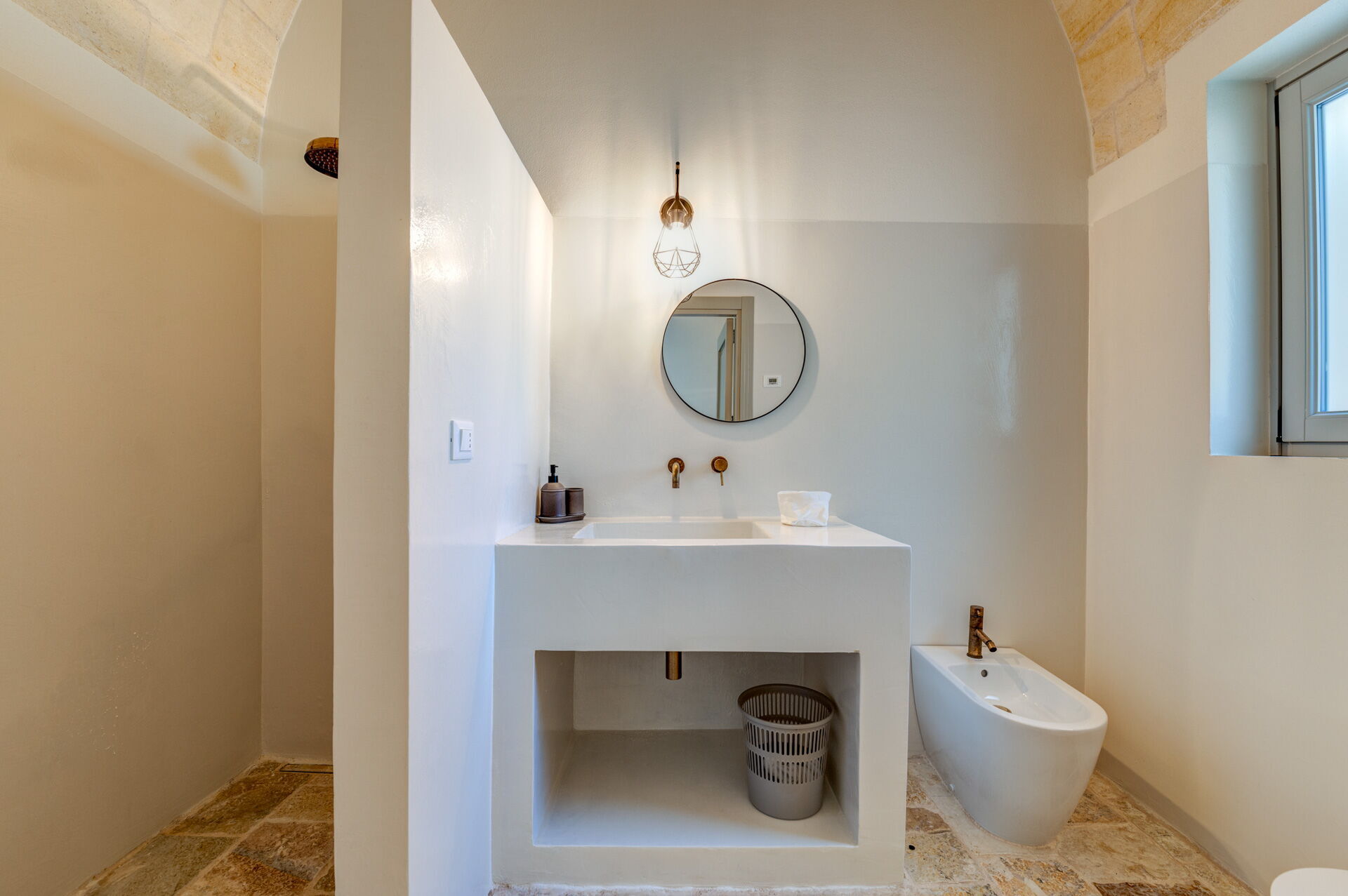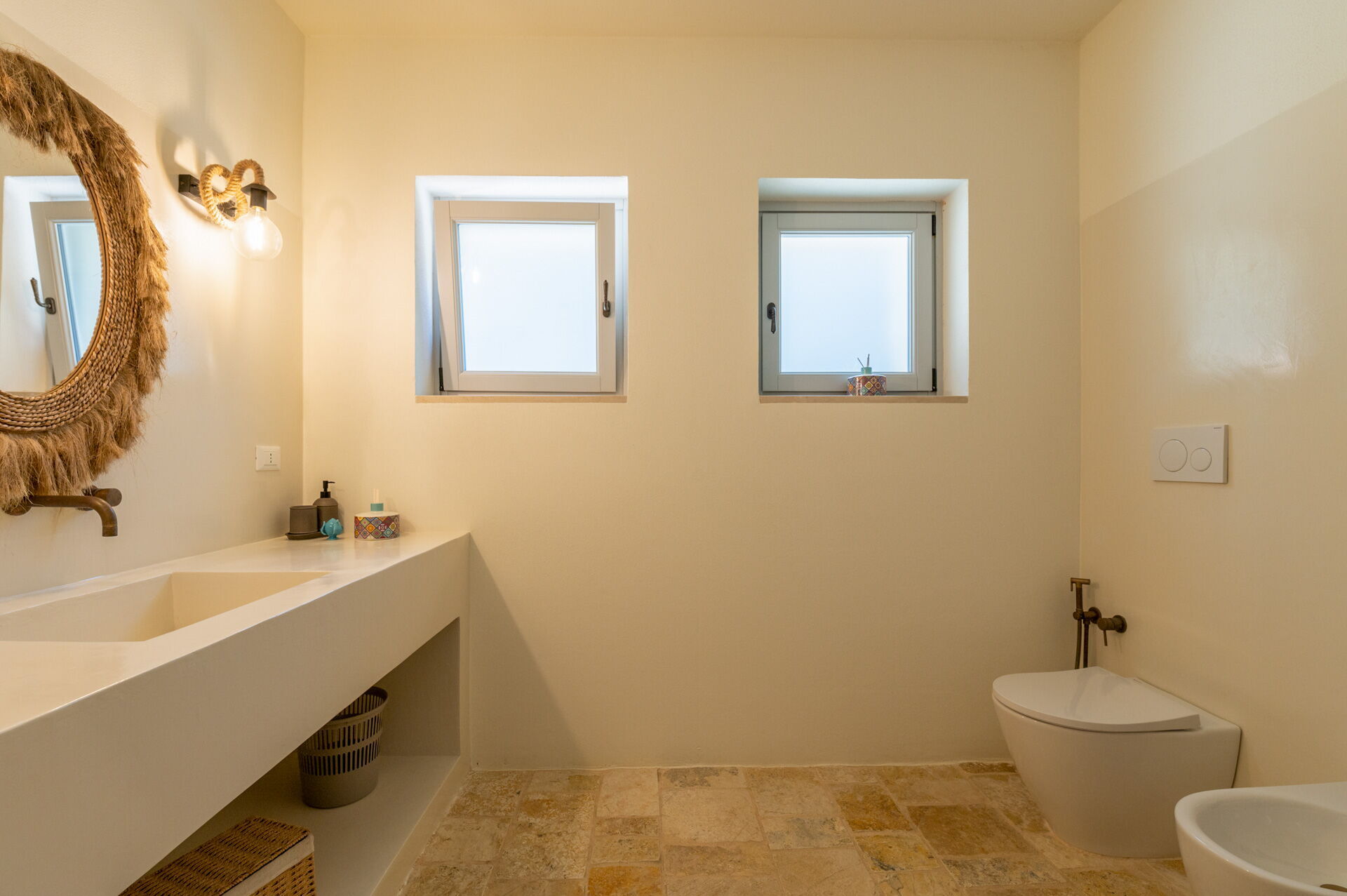 Der Innenbereich der Villa zeichnet sich durch edle Einrichtung und Helligkeit aus, aufgrund der großen Fenster aus, die perfekt mit der traditionellen architektonischen Struktur des Salento (gewölbte Decken, Steinmauern und weiße Wände) harmonieren.