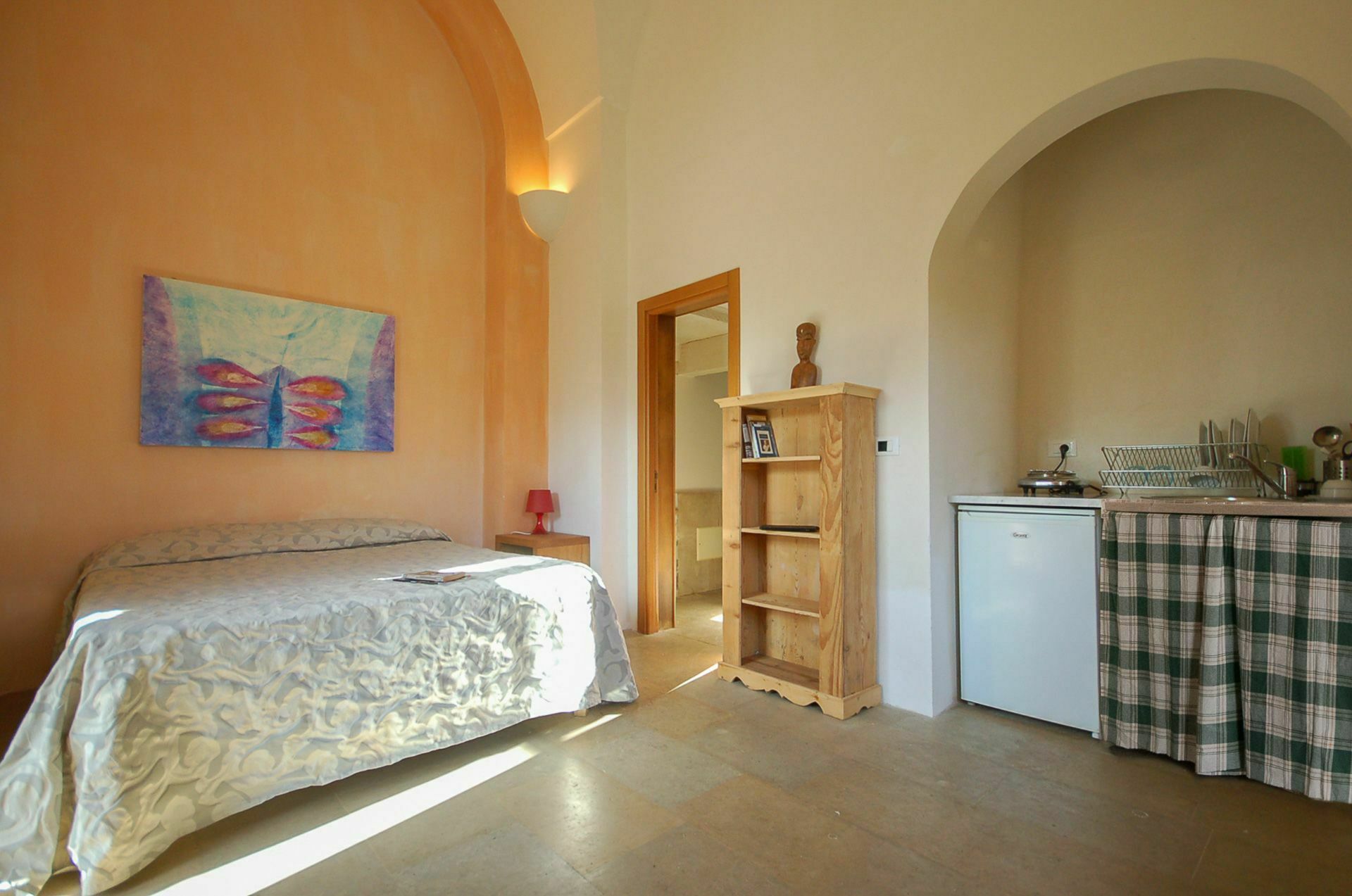 APPARTEMENT E: Doppelzimmer mit Ehebett, Bad mit Dusche, Kühlschrank, Außenküche.