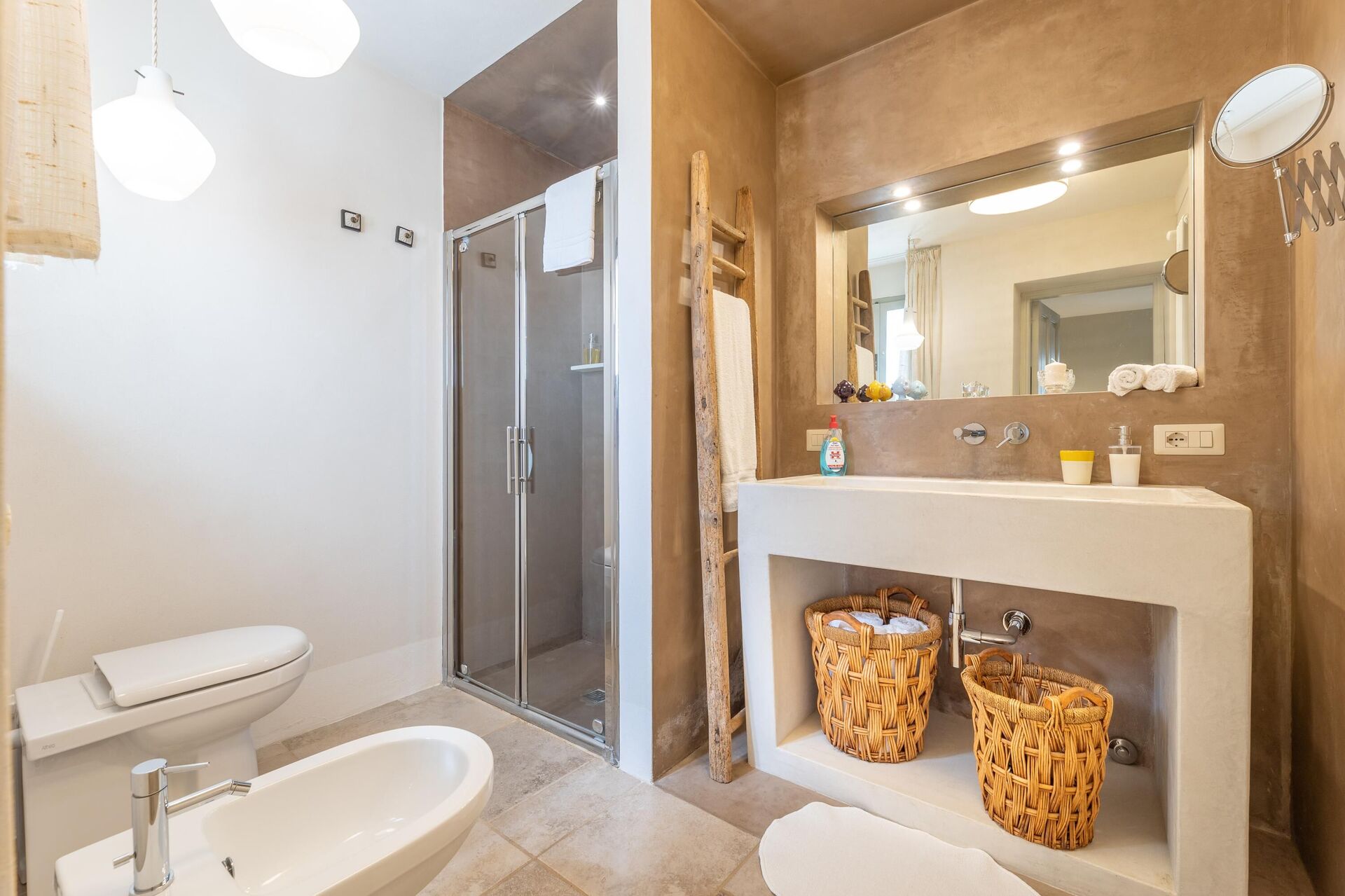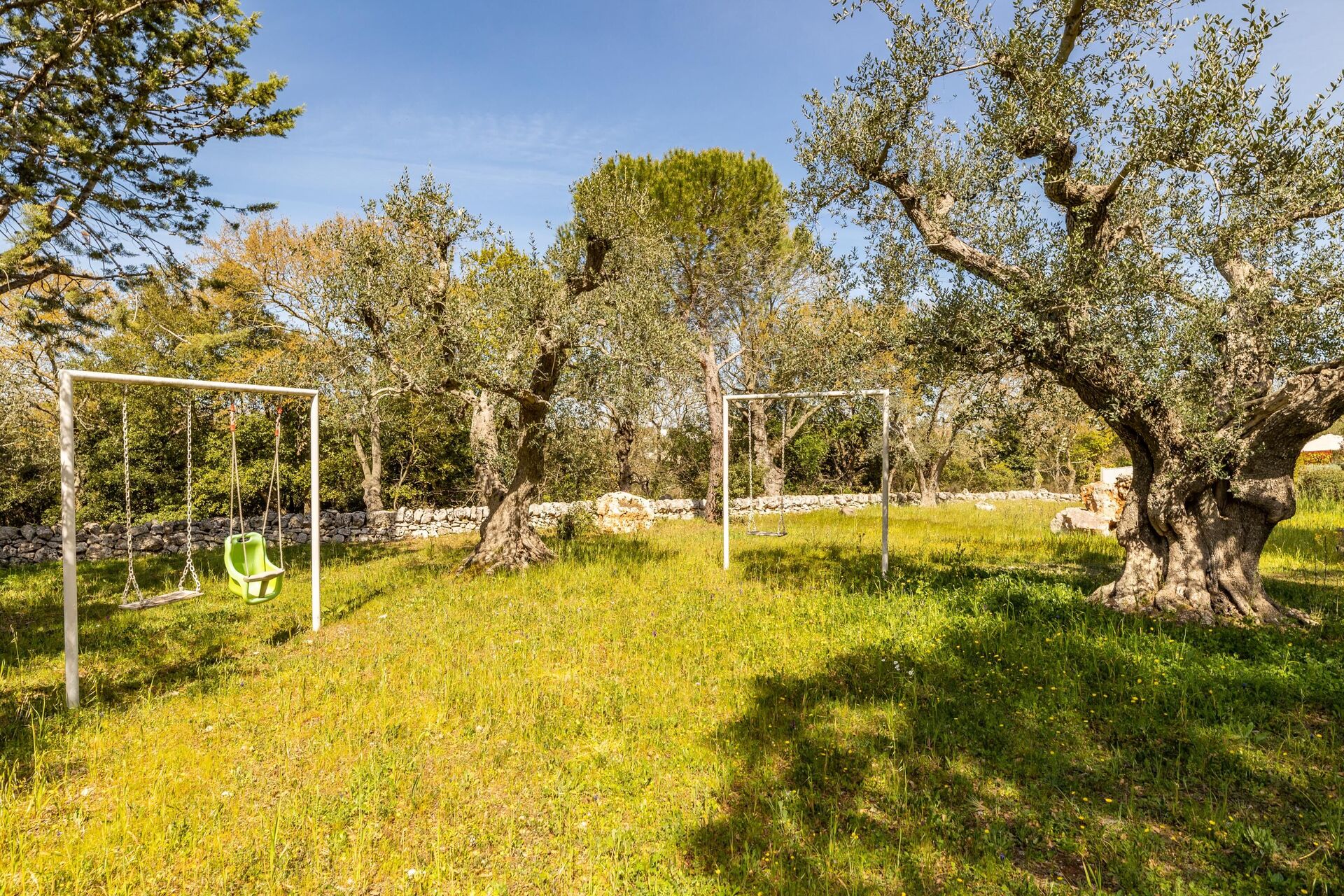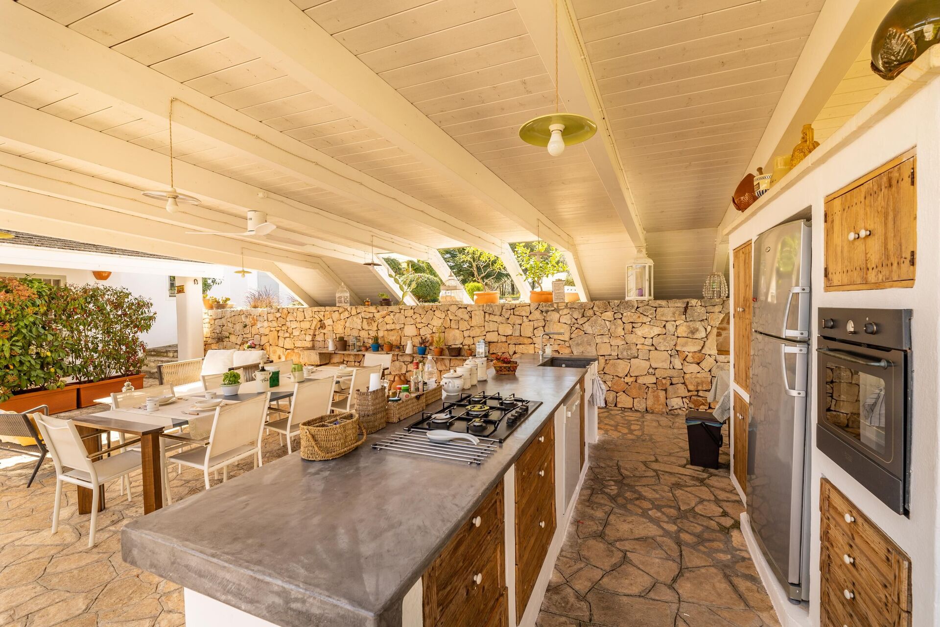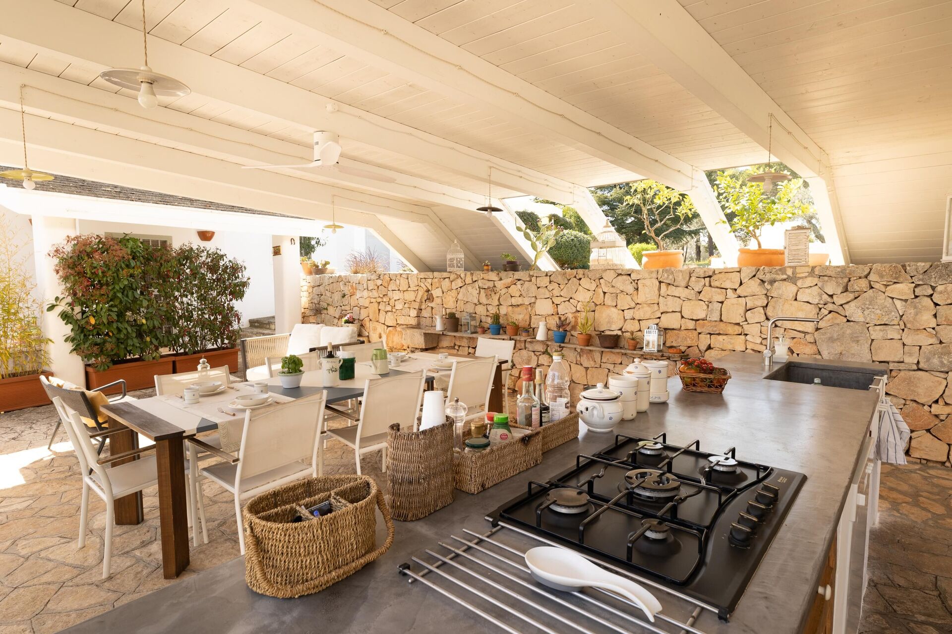 Im Aussenbereich ist diese besondere Villa von einem großen Garten mit einem kleinen Spielplatz für Kinder umgeben. Neben dem eleganten Schwimmbad, das den Gästen exklusiv zur Verfügung steht, verfügt das Anwesen über große Gemeinschaftsbereiche, um die Tage im Freien verbringen zu können: ein großer Pavillon mit Essbereich und eine sehr moderne Pergola mit einem schönen Ruhebereich und einem Essbereich sowie eine mit Grill ausgestatteten Küche stehen ebenfalls für die Gästen bereit.