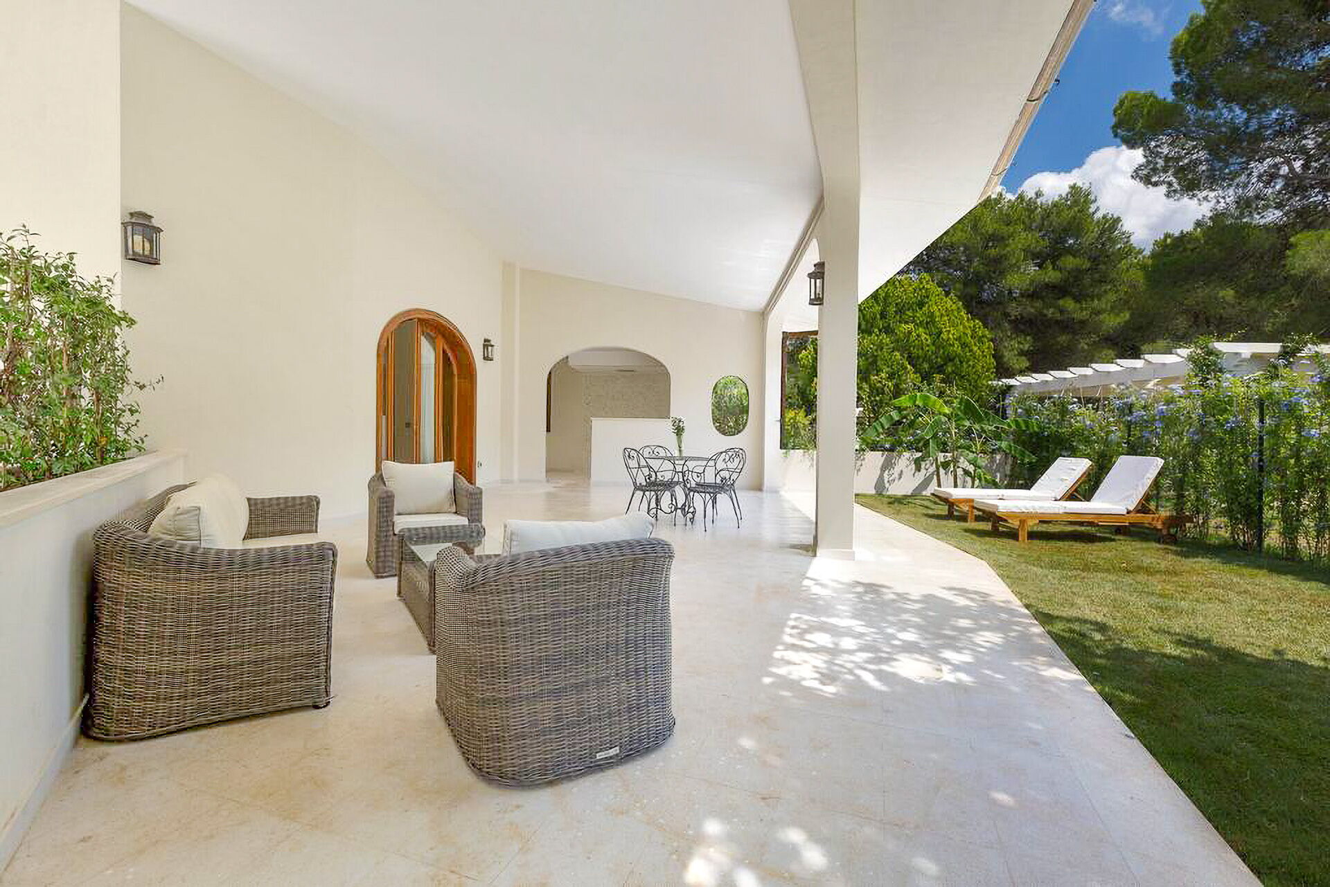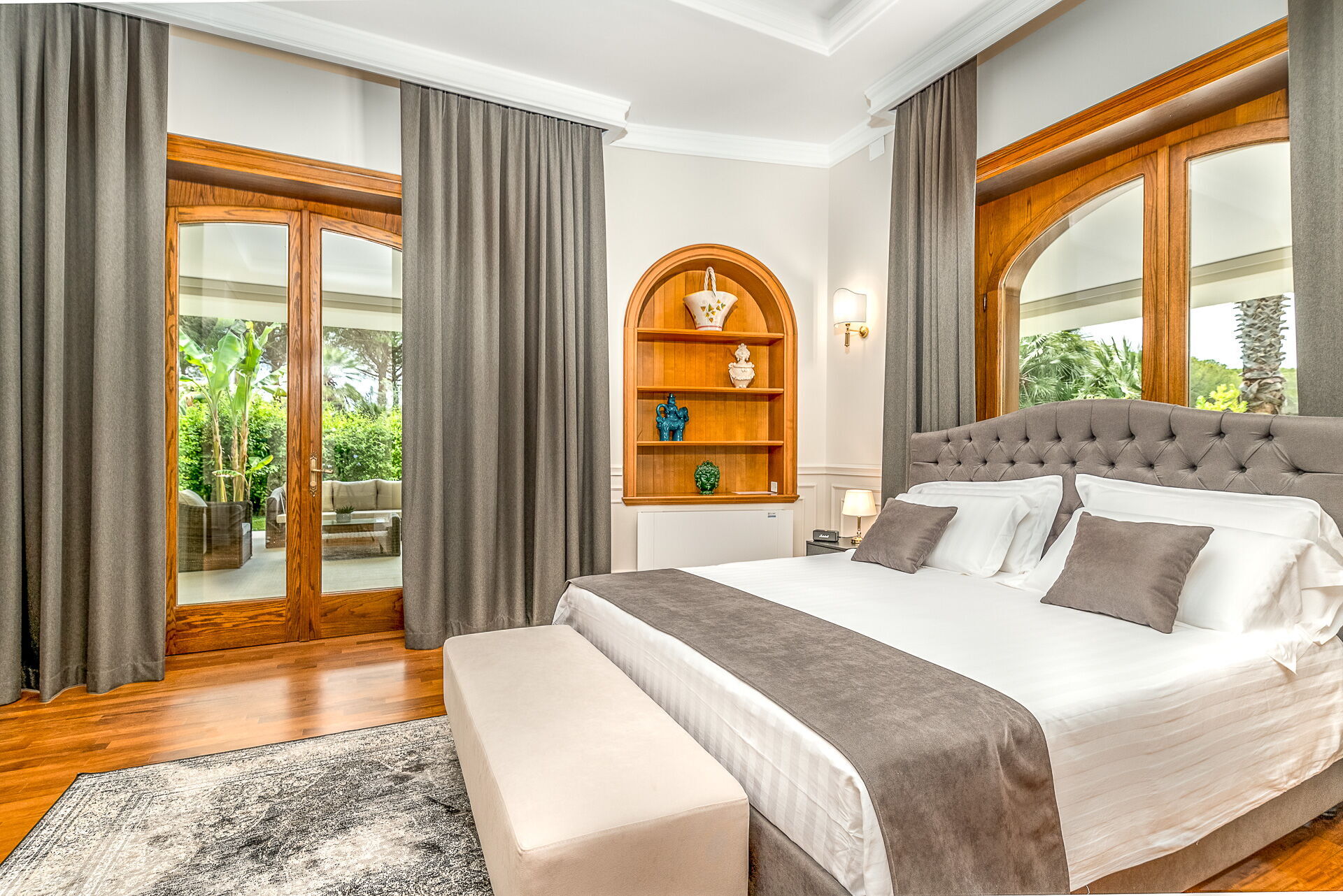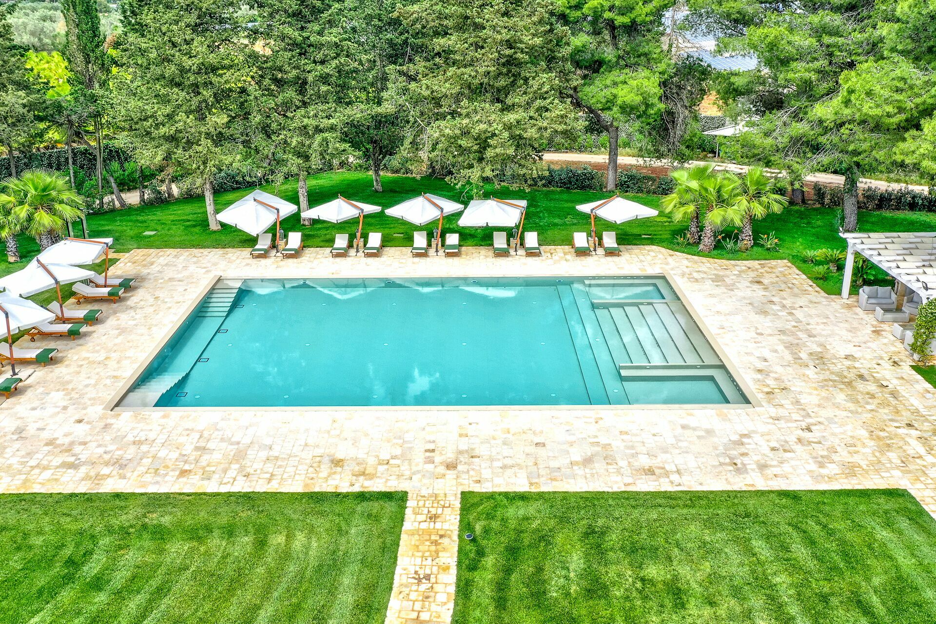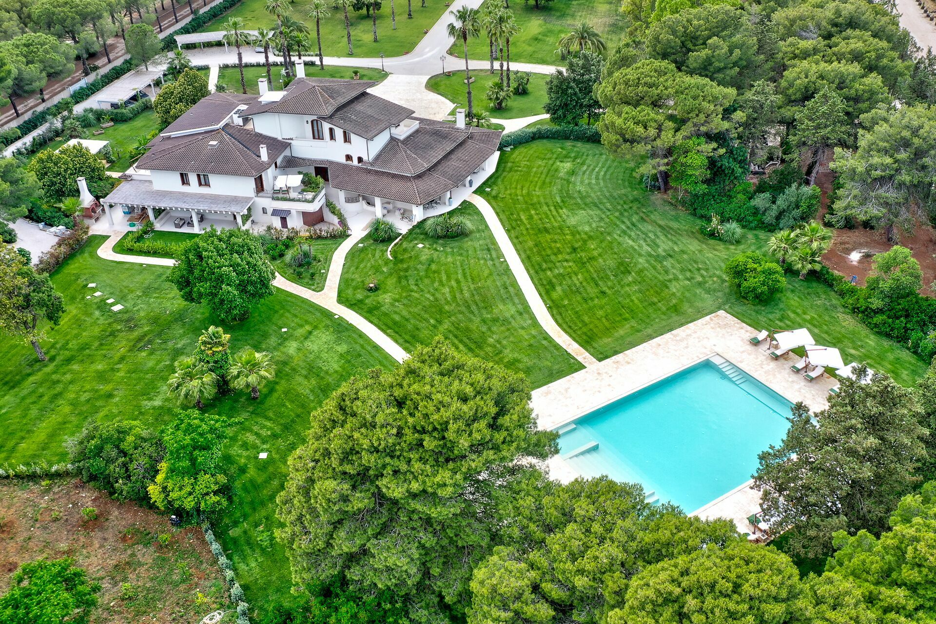 Die Inneneinrichtung ist raffiniert und die Zimmer sind sehr geräumig und hell. Der große eingezäunte Garten von etwa 8000 Quadratmetern umgibt das gesamte Anwesen mit einem schönen englischen Rasen und Bäumen und Pflanzen, die typisch für die mediterrane Macchia sind. Über einen kurzen Weg erreicht man das spektakuläre Schwimmbad, das den Gästen exklusiv zur Verfügung steht. Verschiedene Entspannungs- und Essbereiche befinden sich an verschiedenen Stellen des Gartens, unter einer eleganten Pergola oder auf den Veranden an den Seiten des Hauses.