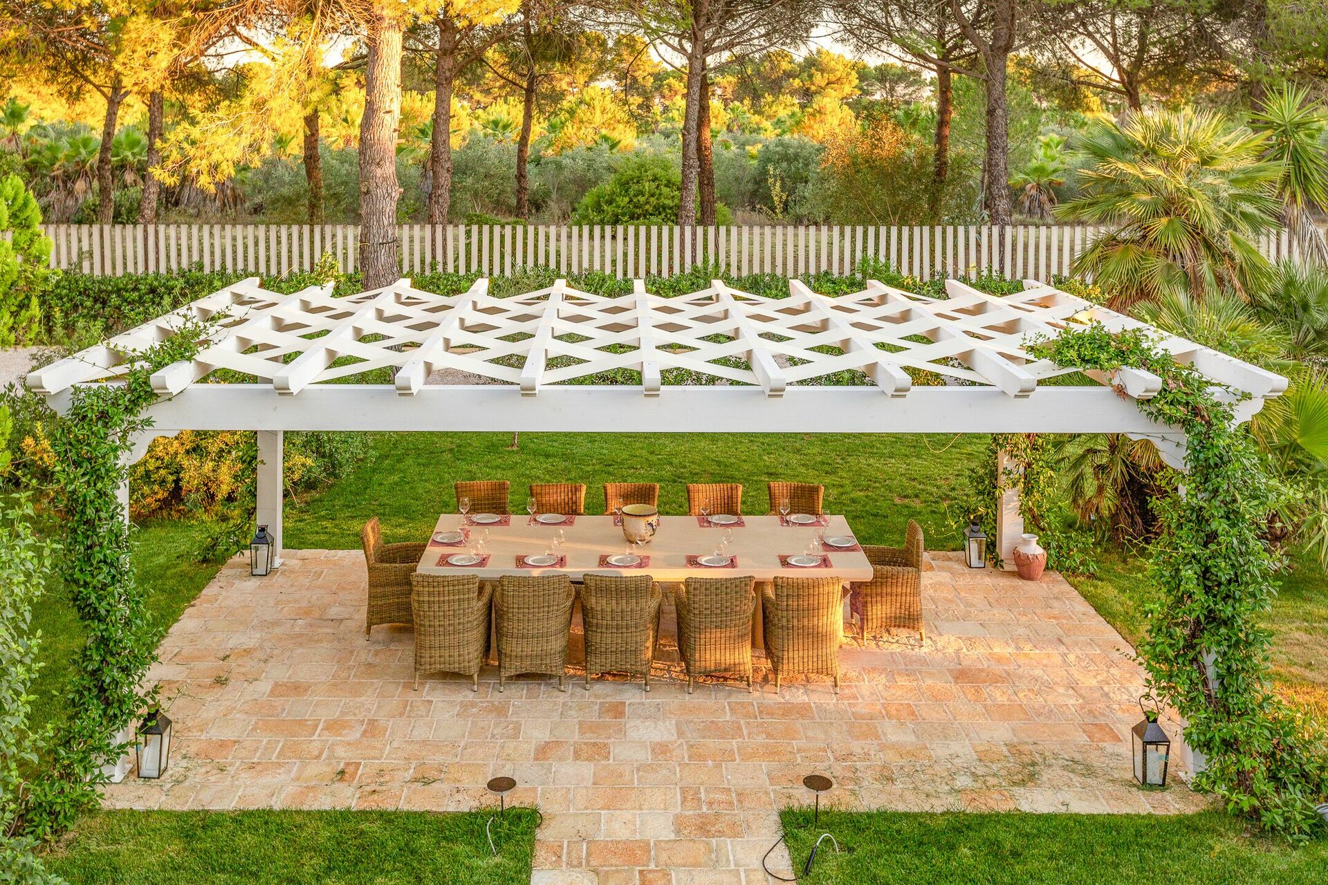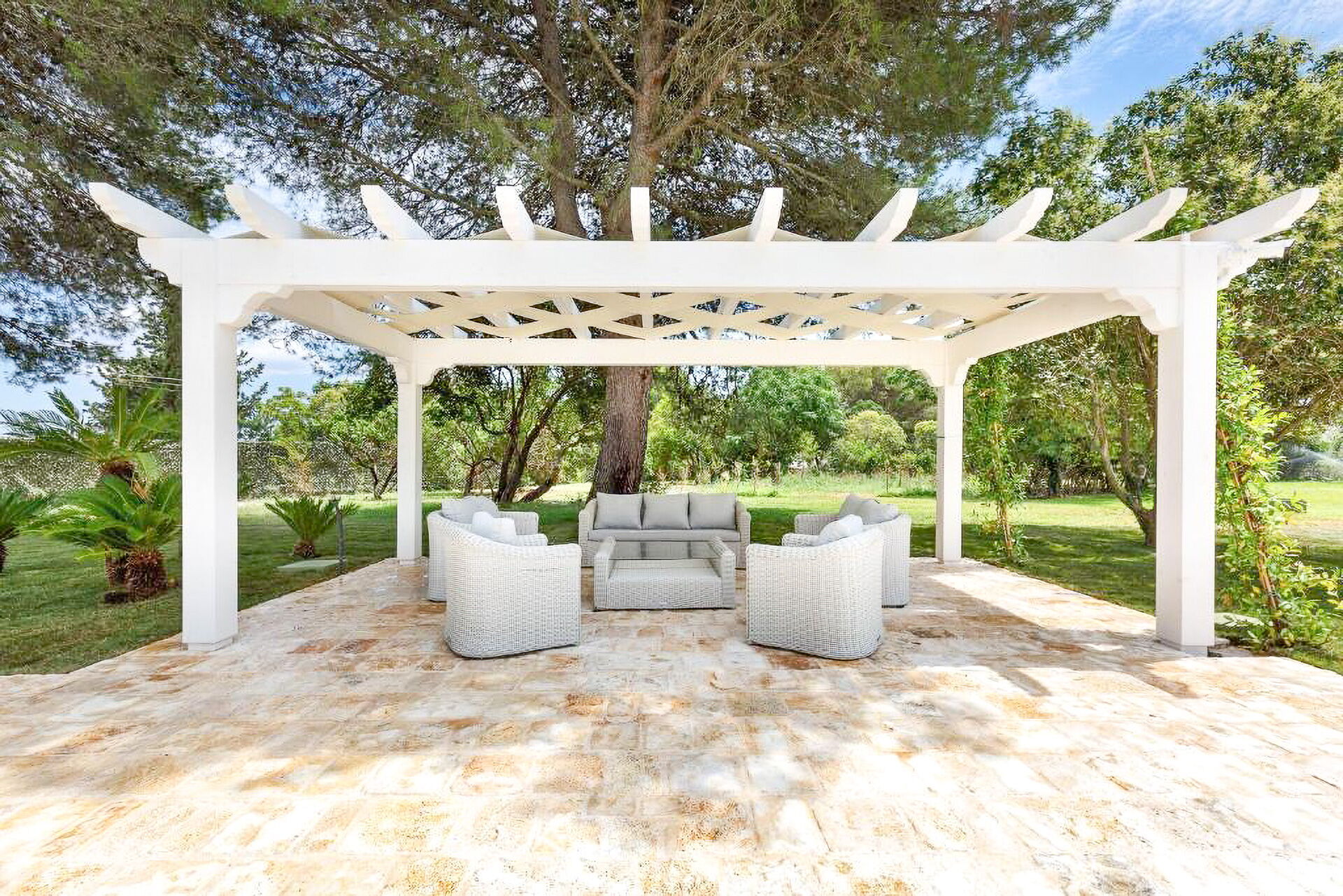 - Veranden und Pergola, die mit Ess- und Entspannungsbereichen ausgestattet sind