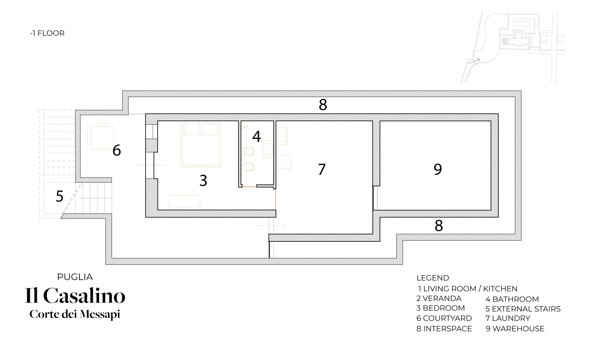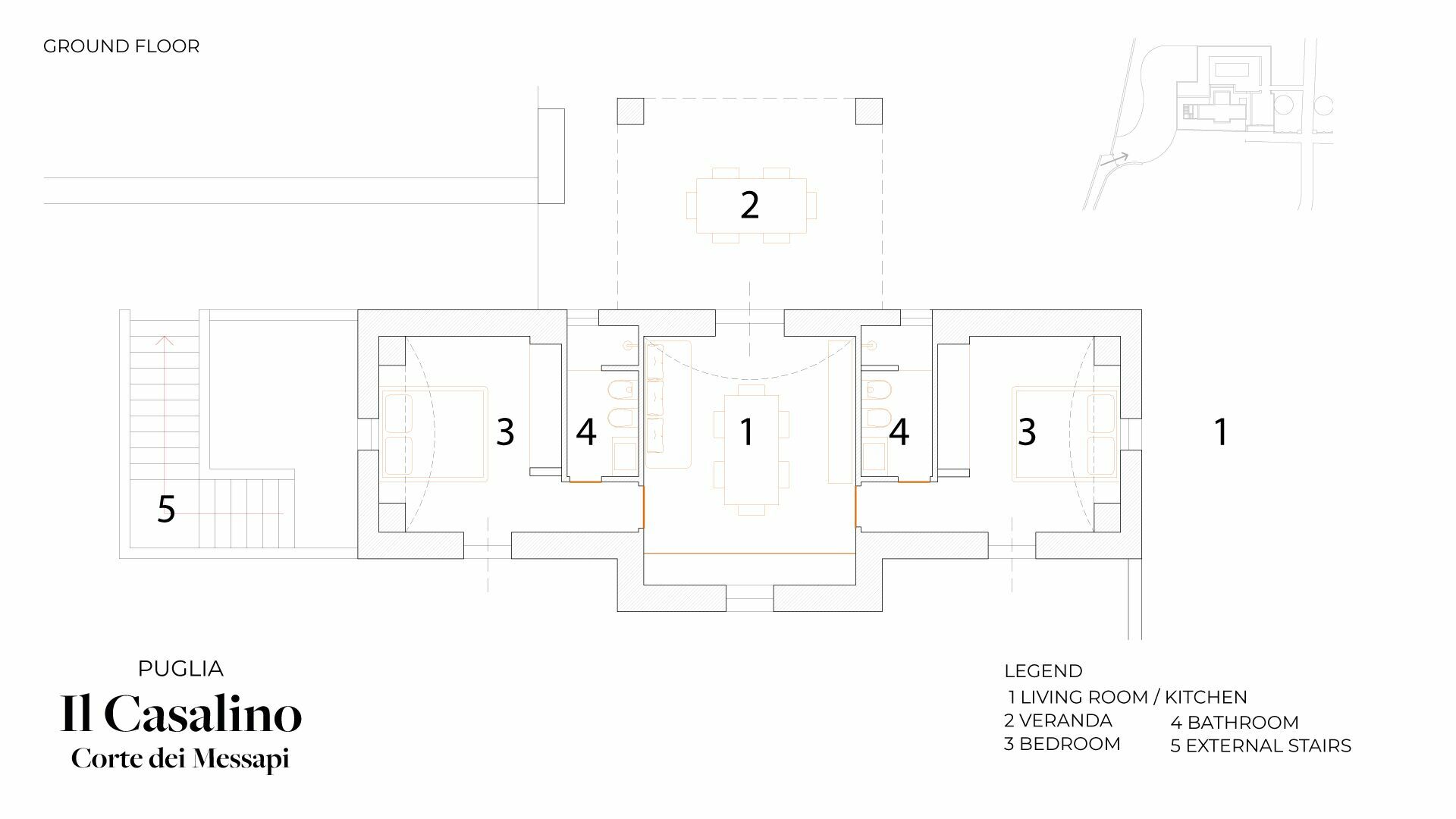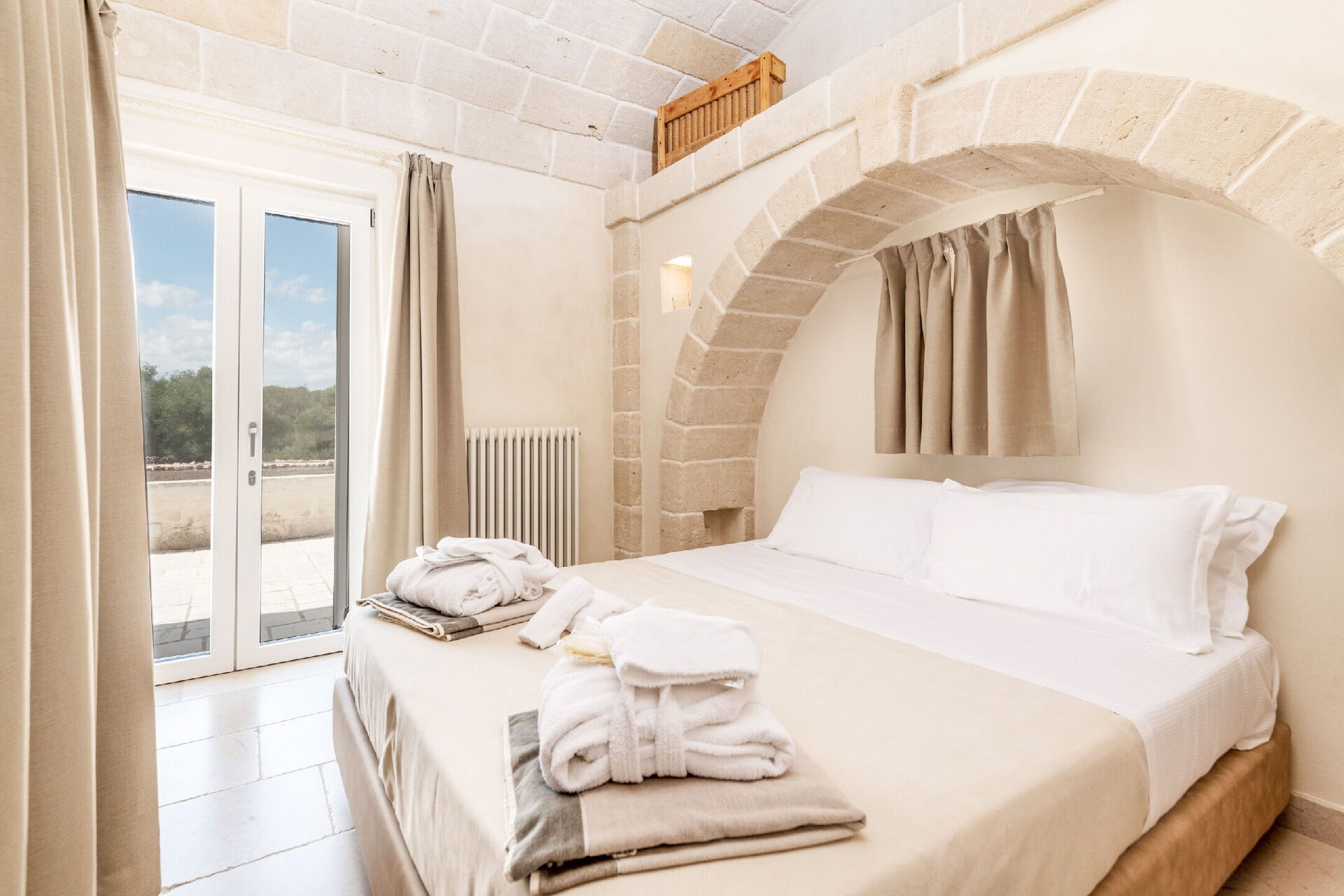 Casalino dei Messapi bietet Platz für bis zu 6 Personen und besteht aus zwei Doppelzimmern im Erdgeschoss und einem dritten Doppelzimmer im Untergeschoss, das nicht intern mit dem Rest des Hauses verbunden ist.