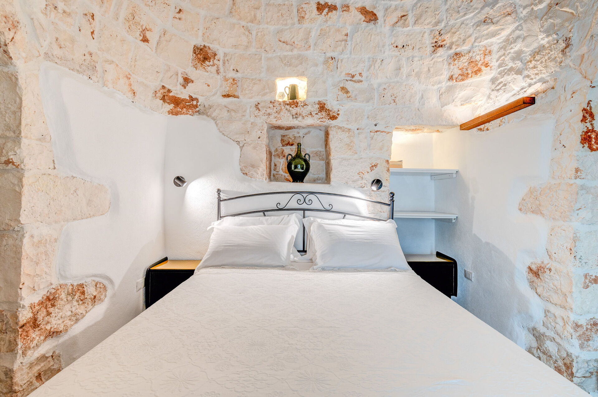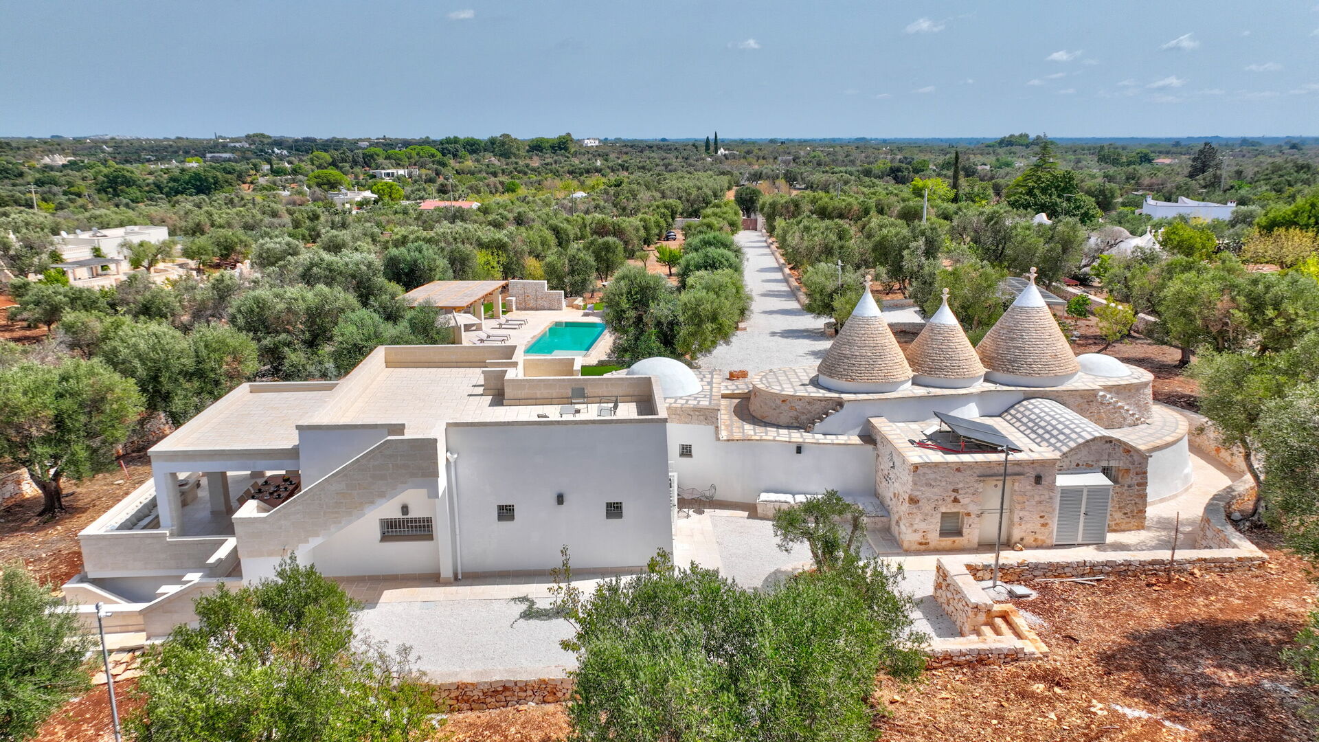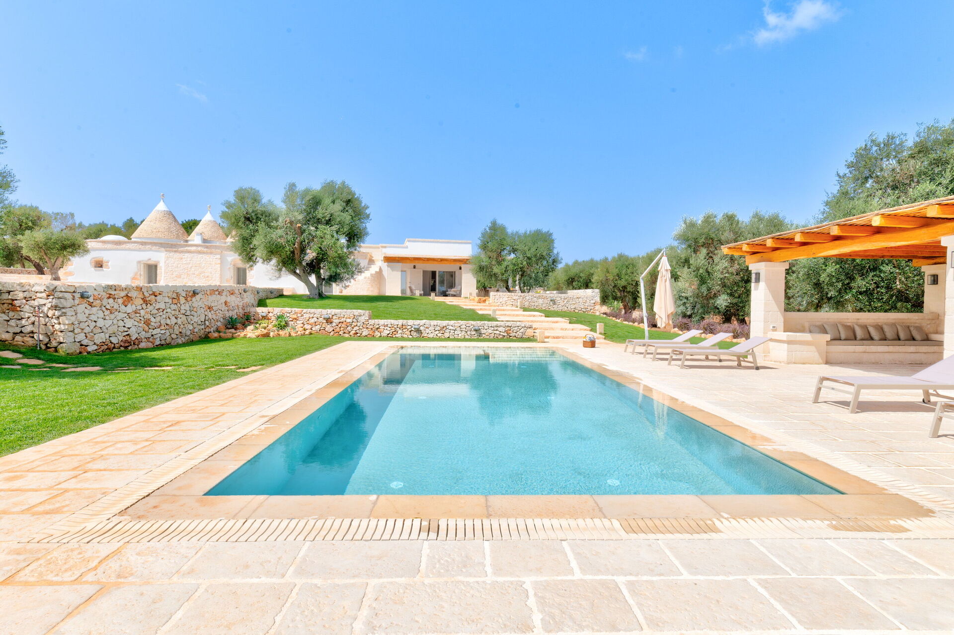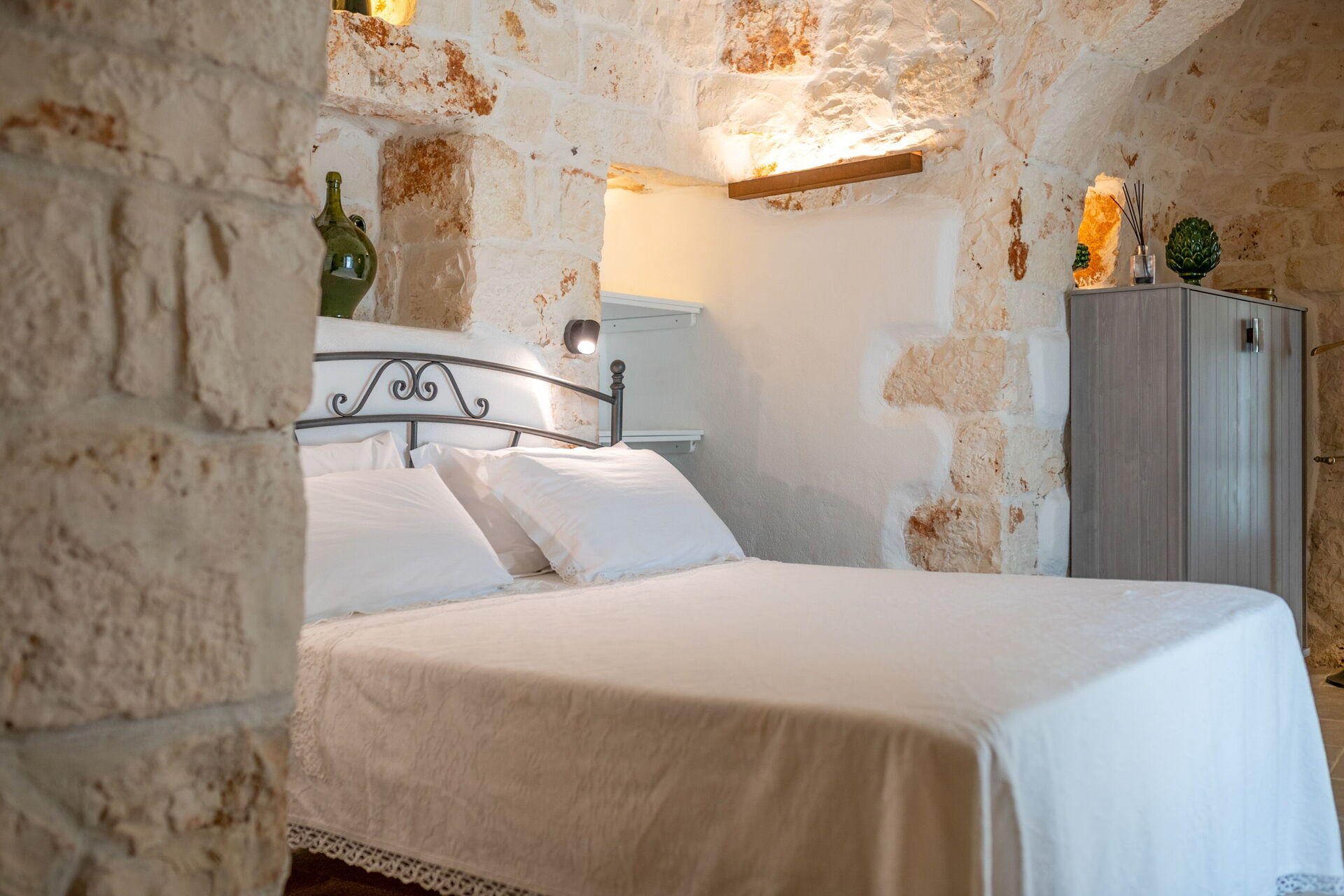 Trulli di Luccio ist ein Trullo mit privatem Pool zur Ferienvermietung in Apulien, in der Landschaft der berühmten "weißen Stadt" Ostuni. Dieses charakteristische traditionelle apulische Anwesen liegt eingebettet in eine herrliche ländliche Umgebung inmitten jahrhundertealter Olivenbäume; wenn Sie einen Urlaub im Zeichen von Ruhe und Natur suchen, ist dieses Anwesen perfekt für Ihre Bedürfnisse. Im Inneren wurde es geschmackvoll und schlicht eingerichtet, wobei ein Kontrast zwischen klassischem Stil und traditionellen Materialien wie lokalem Stein und Holz geschaffen wurde. Die gemütlichen Räume sind mit jedem Komfort ausgestattet und bieten Platz für bis zu 6 Personen in 3 Schlafzimmern. Im Außenbereich verfügt das Anwesen neben einem schönen Pool zur exklusiven Nutzung über großzügige Bereiche für das Leben im Freien: Eine große Veranda am Pool mit Außenküche, Grill und einem schönen Entspannungsbereich steht den Gästen zur Verfügung. Trulli di Luccio liegt strategisch günstig nur 8 km von Ostuni entfernt. Von hier aus können Sie bequem die wichtigsten touristischen Ziele der Region erkunden: die Strände von Torre Santa Sabina und Baia dei Camerini, das Naturschutzgebiet Torre Guaceto sowie die berühmten historischen Zentren wie Alberobello, Locorotondo, Carovigno und Polignano a Mare.