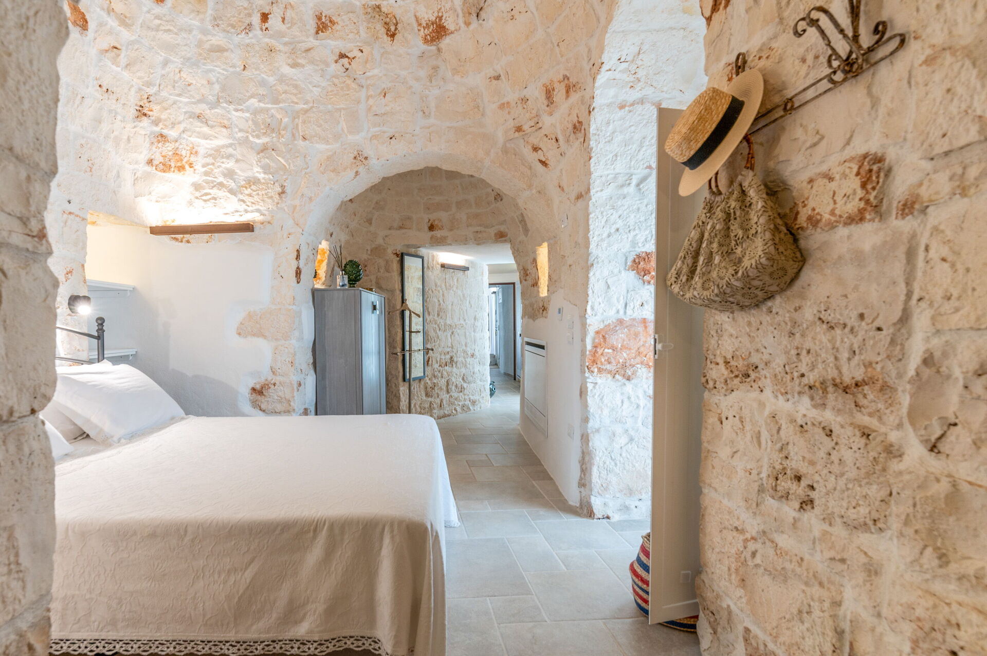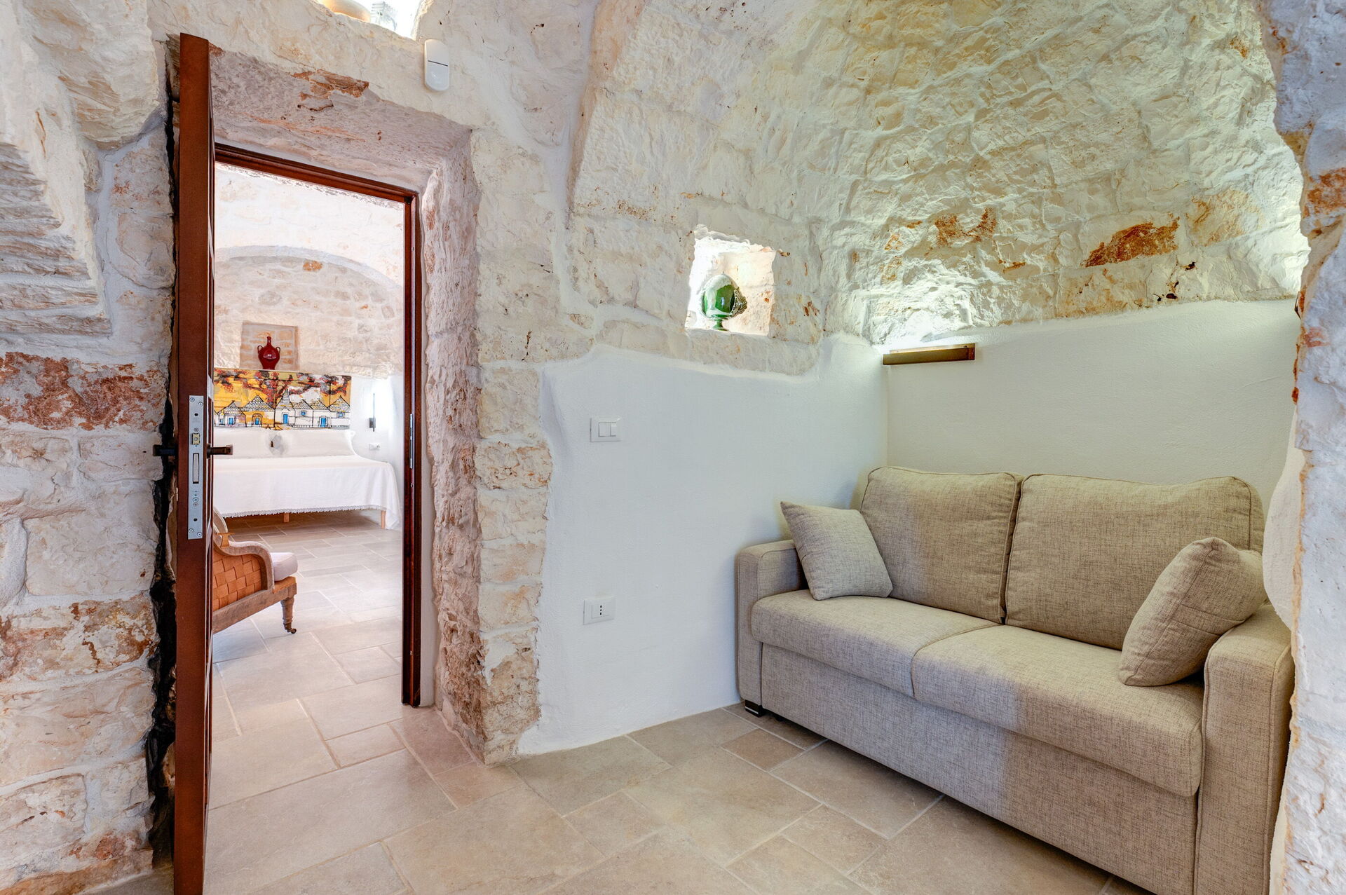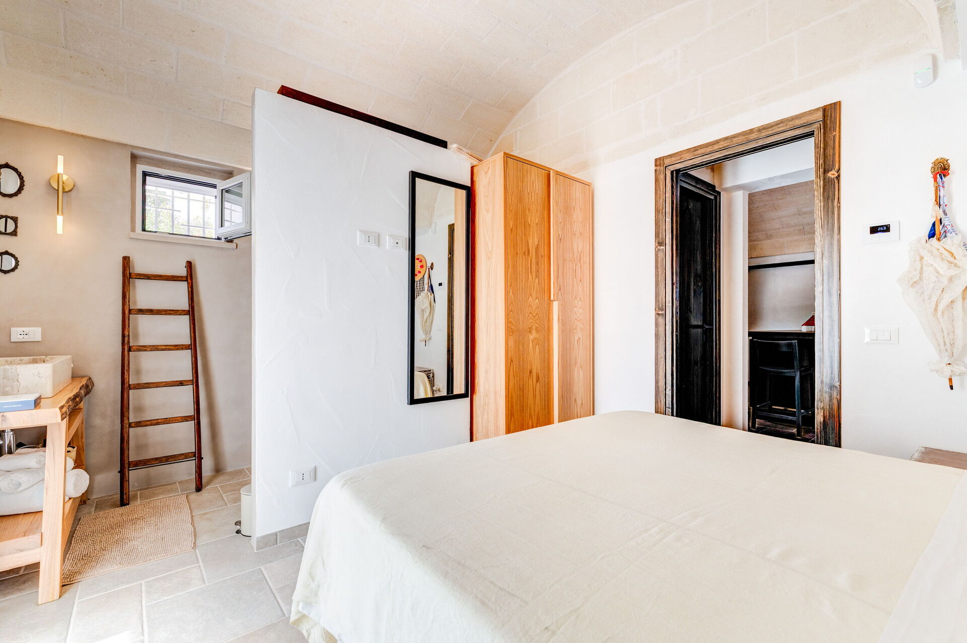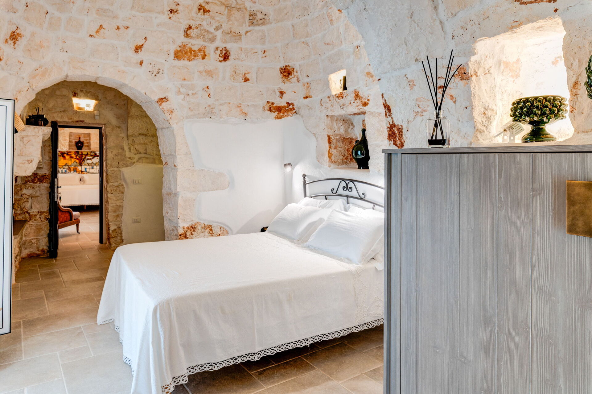 Trulli di Luccio ist ein Trullo mit privatem Pool zur Ferienvermietung in Apulien, in der Landschaft der berühmten "weißen Stadt" Ostuni. Dieses charakteristische traditionelle apulische Anwesen liegt eingebettet in eine herrliche ländliche Umgebung inmitten jahrhundertealter Olivenbäume; wenn Sie einen Urlaub im Zeichen von Ruhe und Natur suchen, ist dieses Anwesen perfekt für Ihre Bedürfnisse. Im Inneren wurde es geschmackvoll und schlicht eingerichtet, wobei ein Kontrast zwischen klassischem Stil und traditionellen Materialien wie lokalem Stein und Holz geschaffen wurde. Die gemütlichen Räume sind mit jedem Komfort ausgestattet und bieten Platz für bis zu 6 Personen in 3 Schlafzimmern. Im Außenbereich verfügt das Anwesen neben einem schönen Pool zur exklusiven Nutzung über großzügige Bereiche für das Leben im Freien: Eine große Veranda am Pool mit Außenküche, Grill und einem schönen Entspannungsbereich steht den Gästen zur Verfügung. Trulli di Luccio liegt strategisch günstig nur 8 km von Ostuni entfernt. Von hier aus können Sie bequem die wichtigsten touristischen Ziele der Region erkunden: die Strände von Torre Santa Sabina und Baia dei Camerini, das Naturschutzgebiet Torre Guaceto sowie die berühmten historischen Zentren wie Alberobello, Locorotondo, Carovigno und Polignano a Mare.