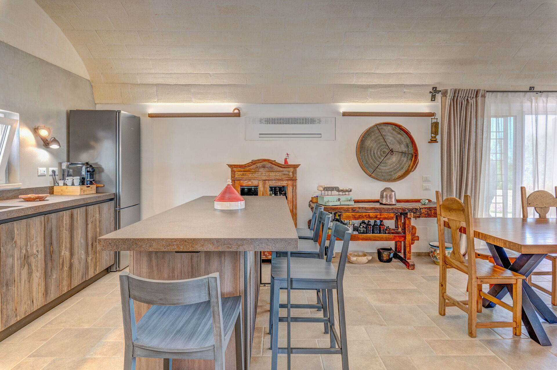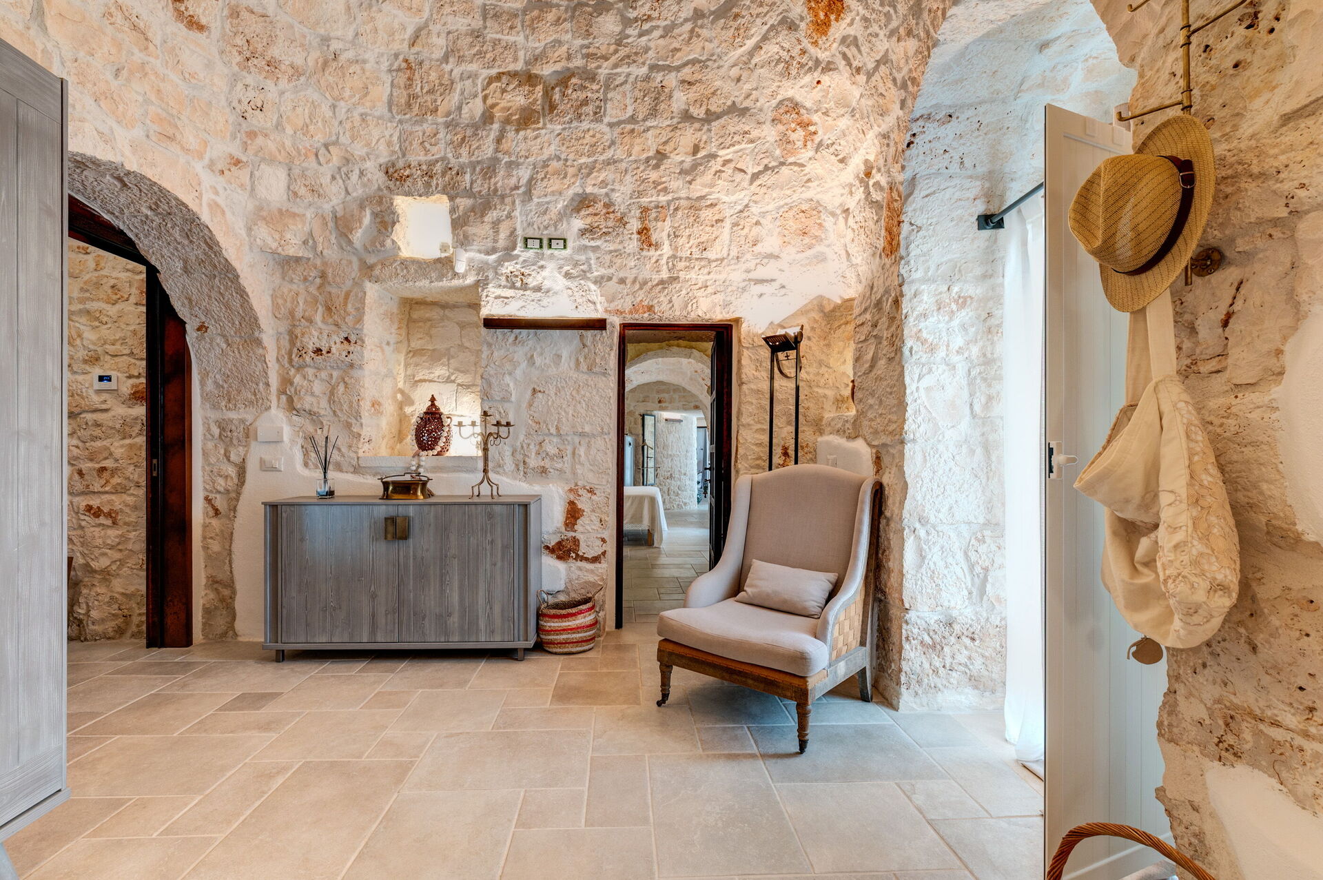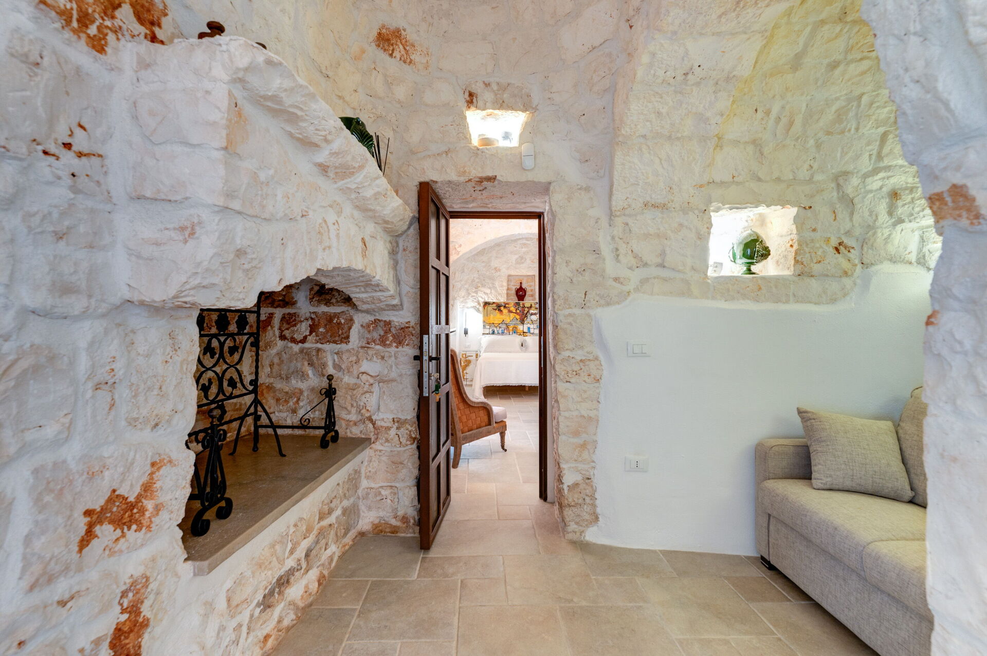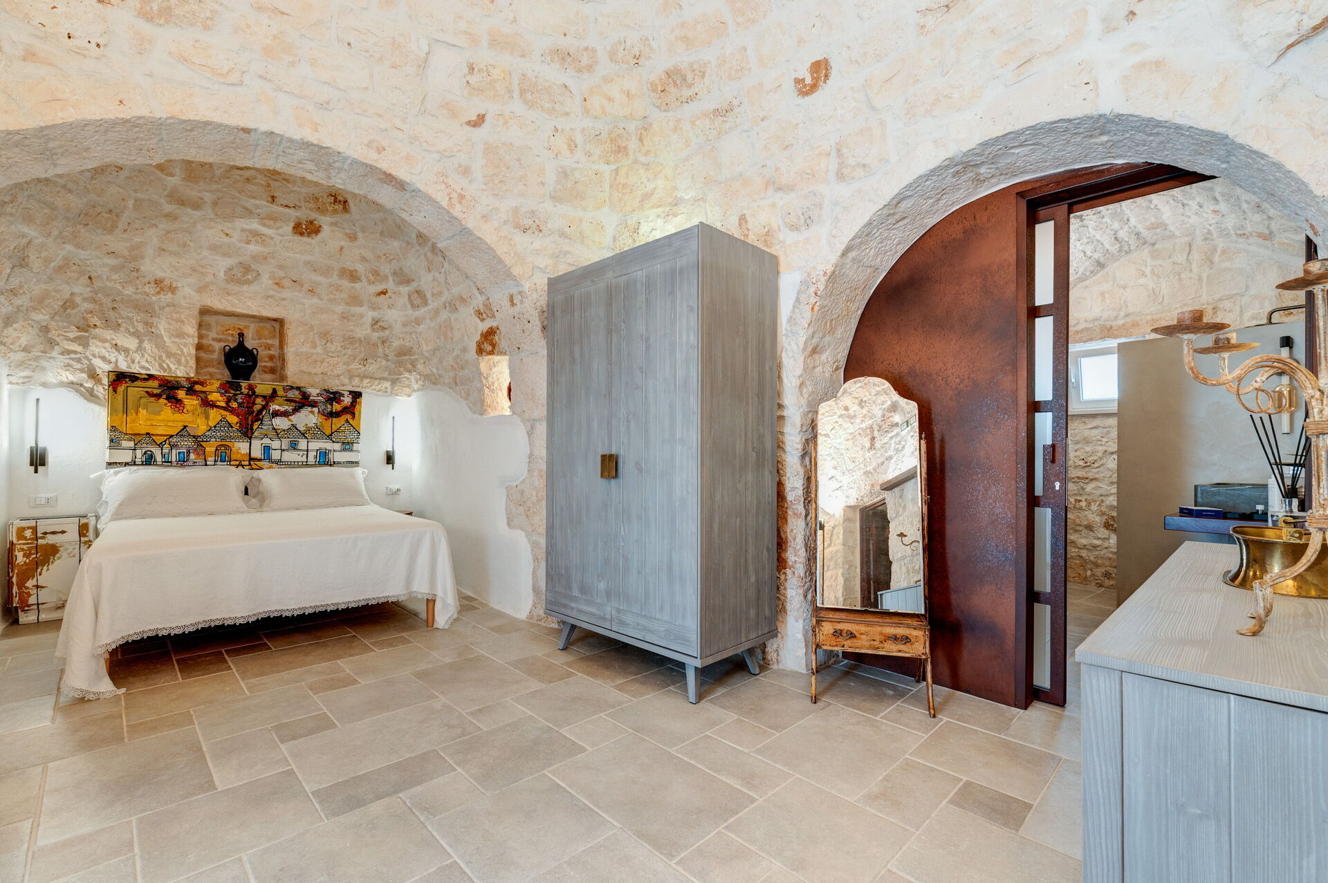 Trulli di Luccio ist ein Trullo mit privatem Pool zur Ferienvermietung in Apulien, in der Landschaft der berühmten "weißen Stadt" Ostuni. Dieses charakteristische traditionelle apulische Anwesen liegt eingebettet in eine herrliche ländliche Umgebung inmitten jahrhundertealter Olivenbäume; wenn Sie einen Urlaub im Zeichen von Ruhe und Natur suchen, ist dieses Anwesen perfekt für Ihre Bedürfnisse. Im Inneren wurde es geschmackvoll und schlicht eingerichtet, wobei ein Kontrast zwischen klassischem Stil und traditionellen Materialien wie lokalem Stein und Holz geschaffen wurde. Die gemütlichen Räume sind mit jedem Komfort ausgestattet und bieten Platz für bis zu 6 Personen in 3 Schlafzimmern. Im Außenbereich verfügt das Anwesen neben einem schönen Pool zur exklusiven Nutzung über großzügige Bereiche für das Leben im Freien: Eine große Veranda am Pool mit Außenküche, Grill und einem schönen Entspannungsbereich steht den Gästen zur Verfügung. Trulli di Luccio liegt strategisch günstig nur 8 km von Ostuni entfernt. Von hier aus können Sie bequem die wichtigsten touristischen Ziele der Region erkunden: die Strände von Torre Santa Sabina und Baia dei Camerini, das Naturschutzgebiet Torre Guaceto sowie die berühmten historischen Zentren wie Alberobello, Locorotondo, Carovigno und Polignano a Mare.