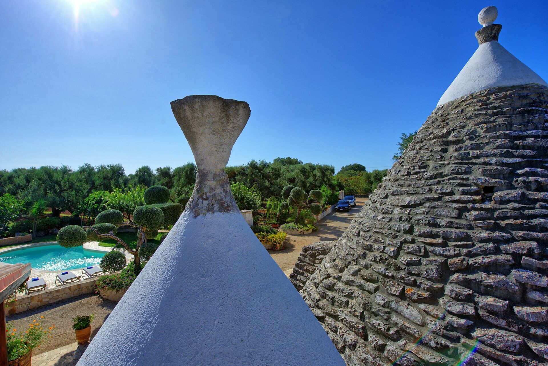 Den Gästen dieses einzigartigen Trullo steht zur Verfügung: 3 Schlafzimmer und 2 Bäder für 6/7 Personen. Ausgestatteter und eingezäunter Garten. Klimaanlage in jedem Schlafzimmer und in den Wohnzimmern. Privates Schwimmbad zum exklusiven Gebrauch der Gäste. Aussendusche neben dem Schwimmbad, Überdachte und ausgestattete Terrasse mit Tisch, Stühlen, TV, Barbecue und Holzofen. Internetzugang (W-LAN) gratis. Parkplatz