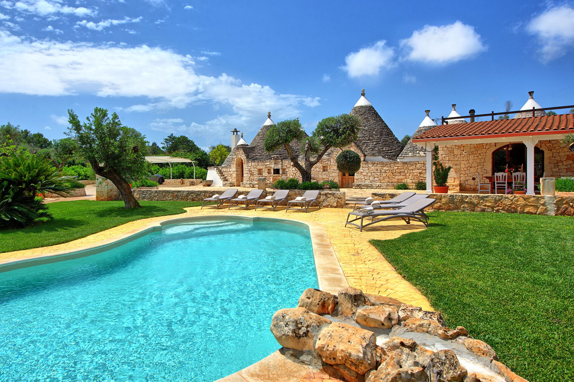 „Trullo Santo Stefano“in Apulien mit privatem Schwimmbad und perfekt gepflegtem Garten; dieser wunderschöne Besitz besteht aus 11 Trulli, die im Innenbereich miteinander verbunden sind. So ist eine aussergewöhnliche, charakteristische Unterkunft, auf insgesammt 145 m2 mit 4 Schlafzimmern entstanden.