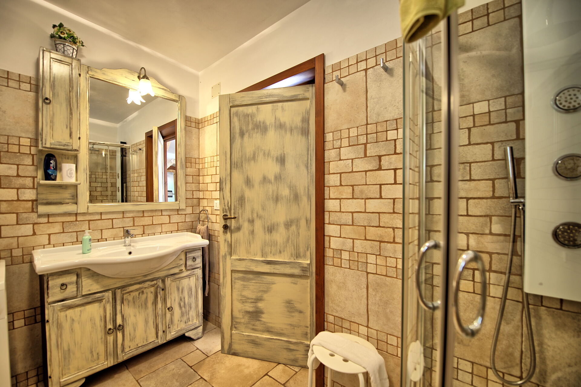 Durch das letzte Schlafzimmer gelangt man in ein weiteres Doppelzimmer mit eigenem Bad mit Dusche; dieses vierte Schlafzimmer ist auch direkt von außen zugänglich.