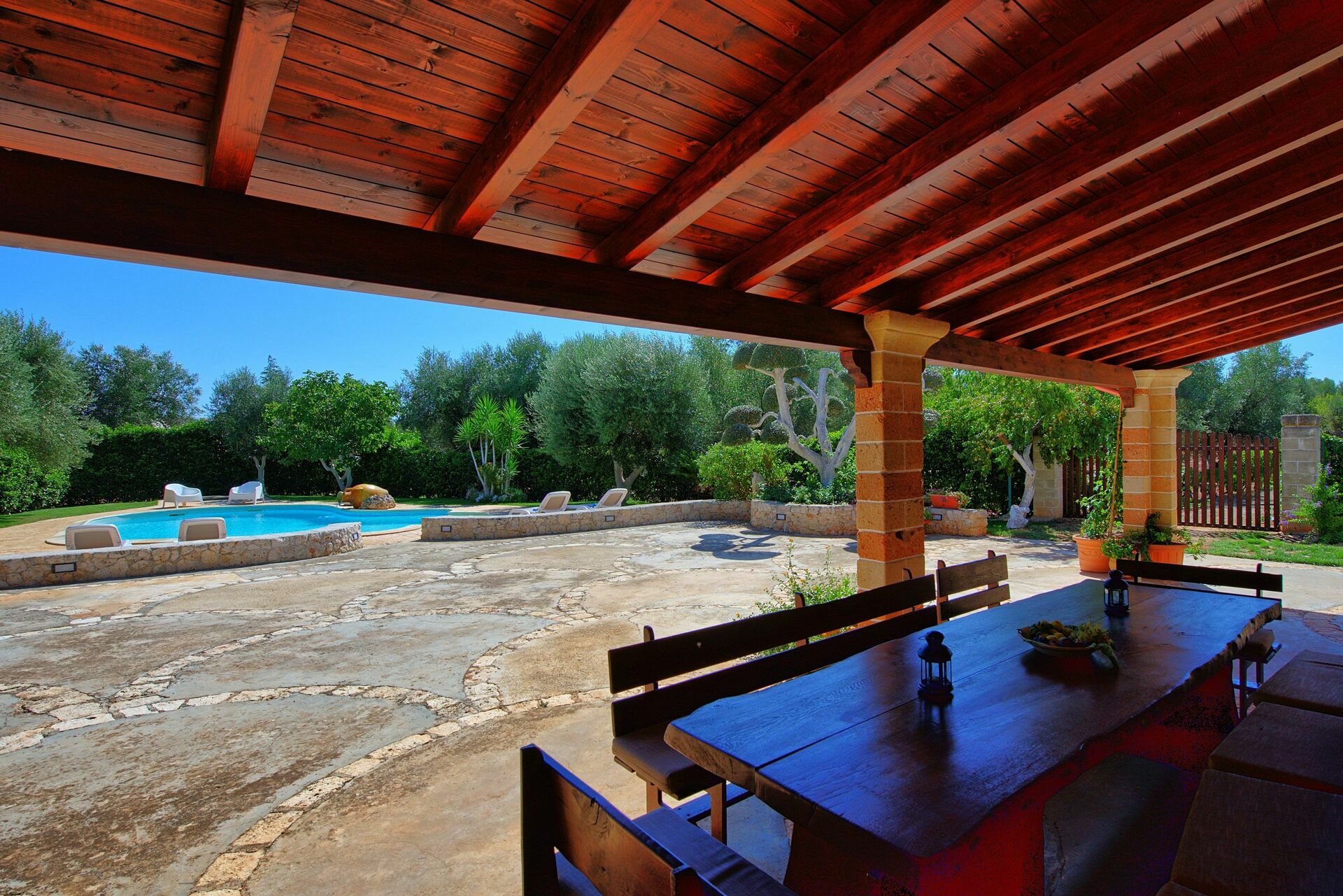 Der Besitz ist komplett freistehend und erst kürzlich vollständig renoviert worden: die Innenräume sind neu und sehr einladend; die Aussenplätze sind sehr gepflegt und beinhalten ein schönes privates Schwimmbad, das den Gästen exklusiv zur Verfügung steht, einen Pavillon und eine überdachte Terrasse, die mit Tisch und Stühlen zum draussen Essen ausgestattet sind.