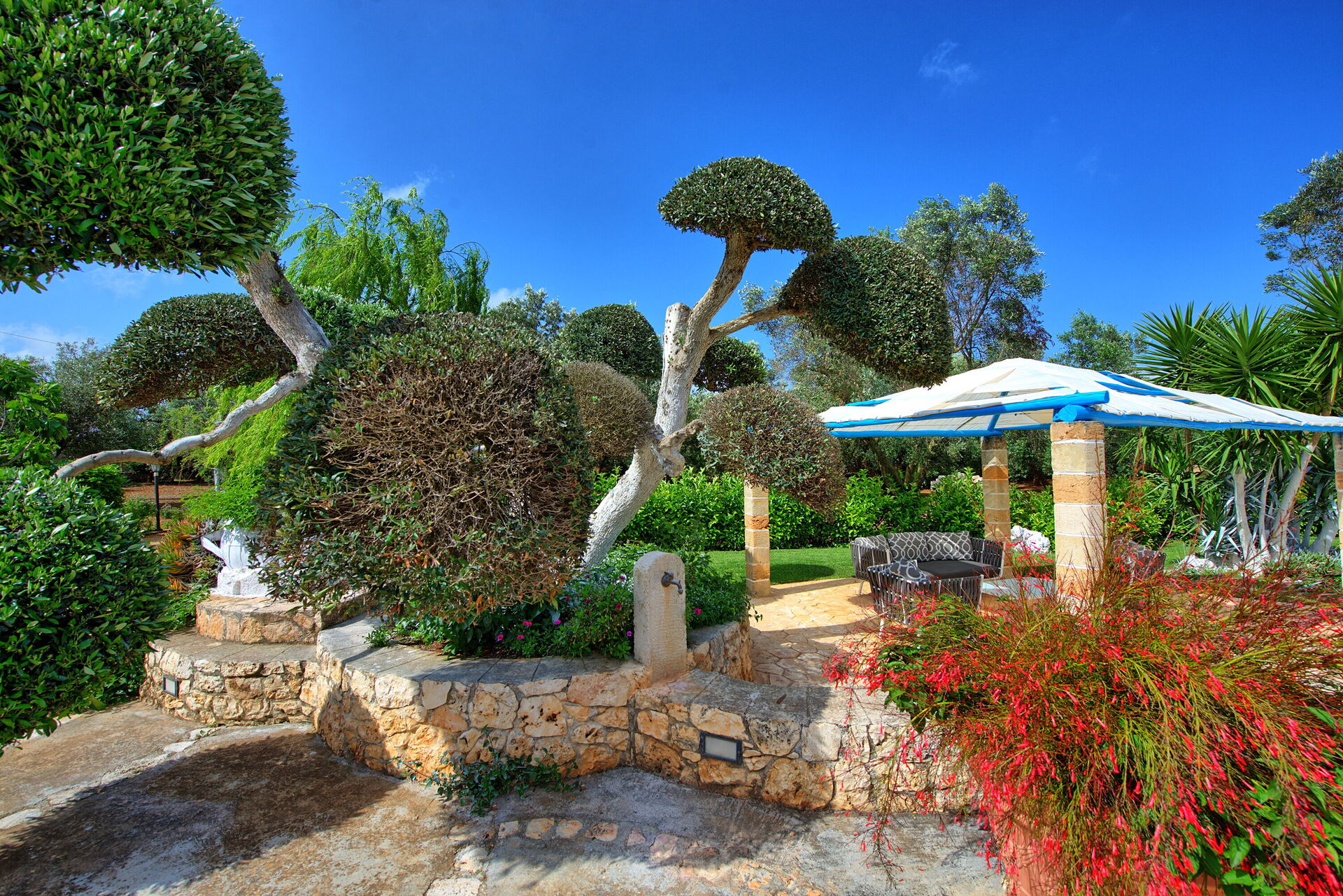 A lovely, private, 2 bedroom villa, perfect for a couple or small family, beautifully landscaped grounds and private swimming pool, with a lovely cabana. Located on a very quiet road, near the small town of San Michele Salentino, which has a number of very good restaurants, supermarkets and shops.