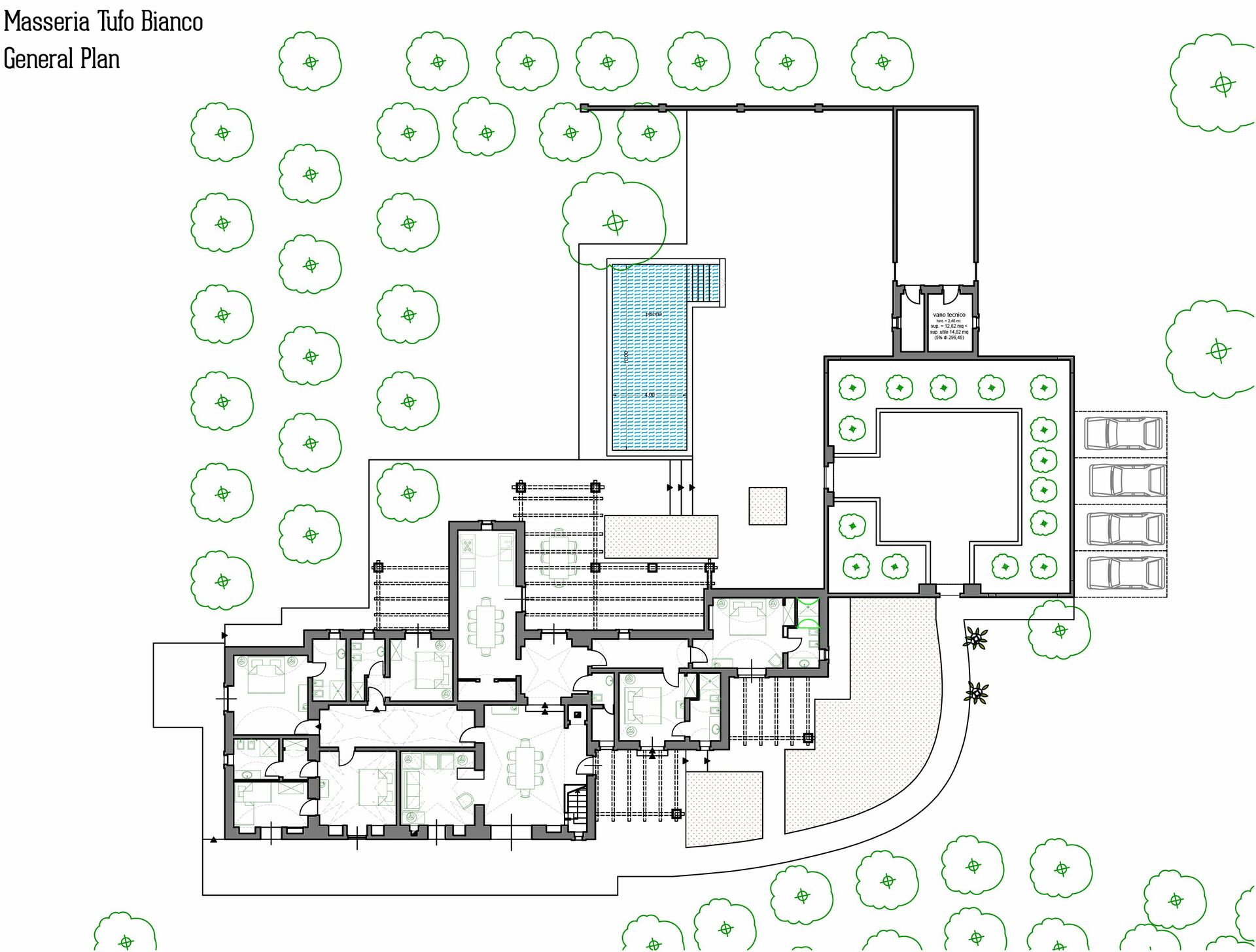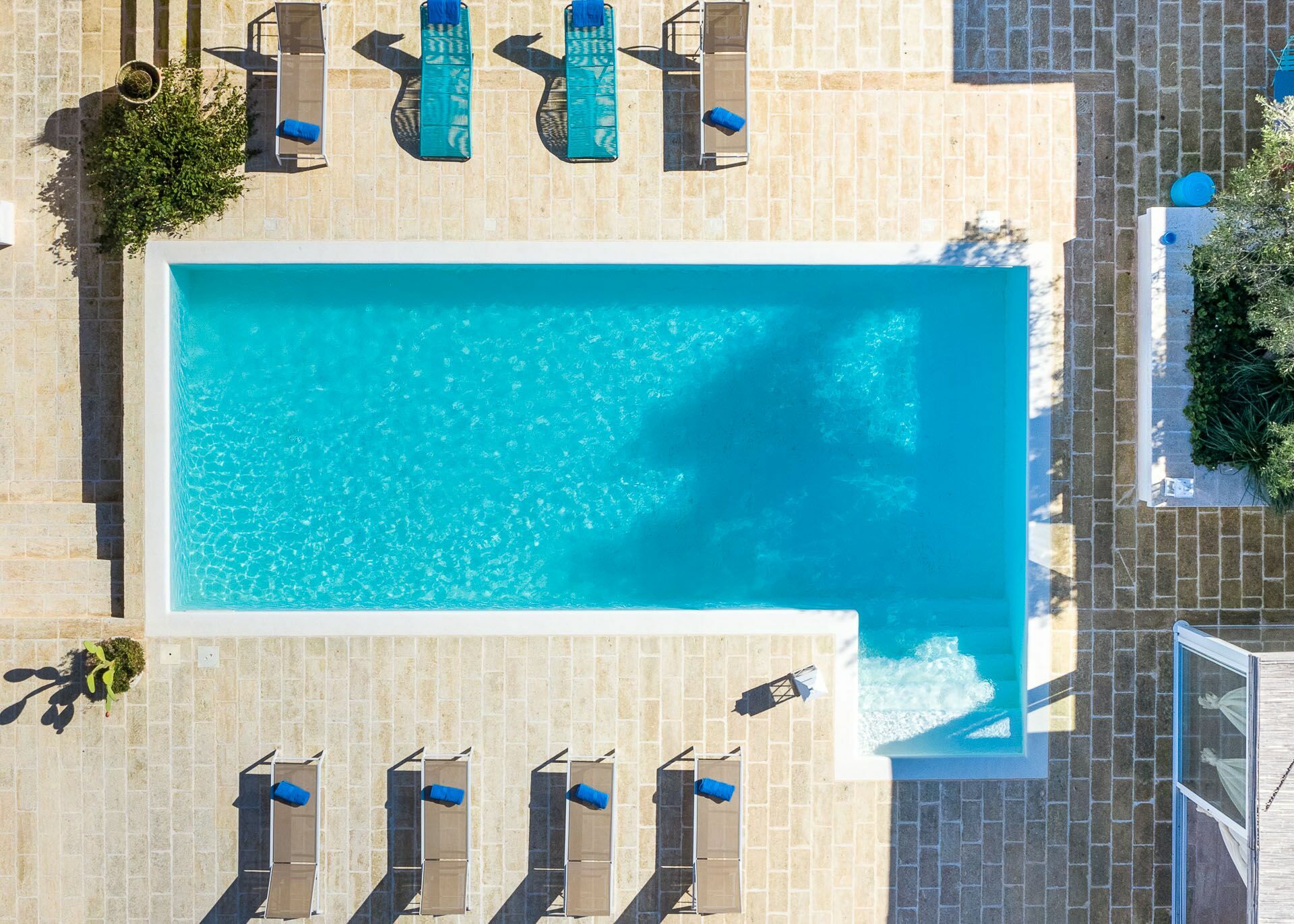 - Schwimmbad, exklusiv für die Gäste (L-Form mit Zugang über eine römische Treppe, 10 x 4 Meter, Tiefe 1,50 Meter)