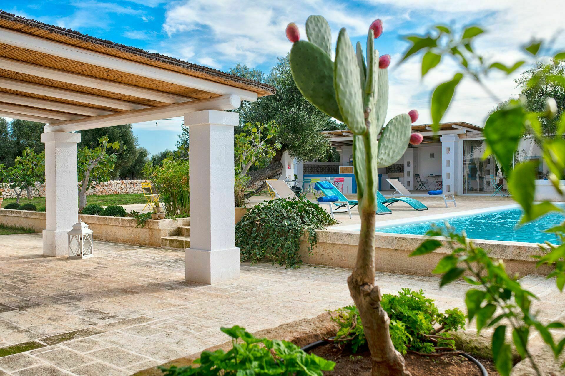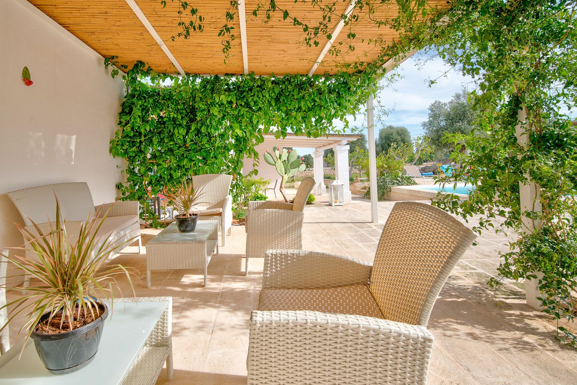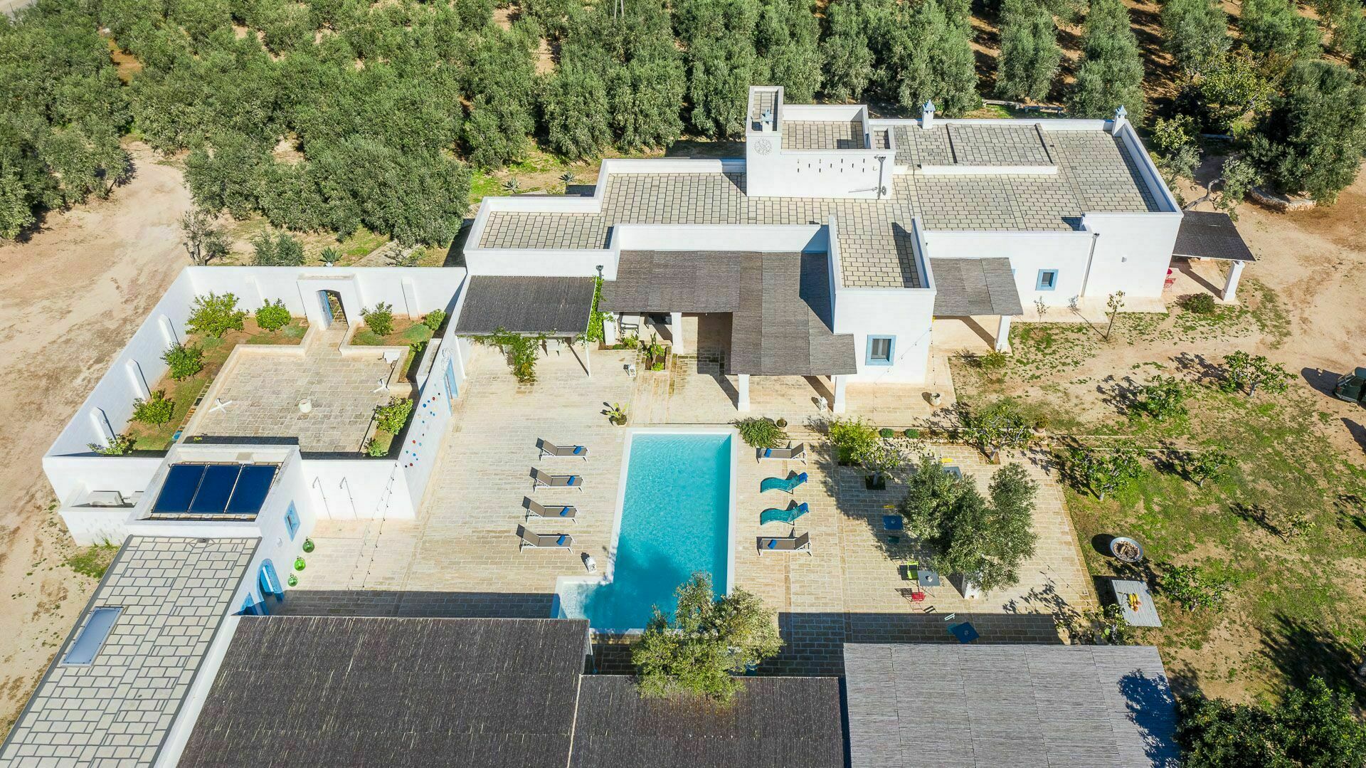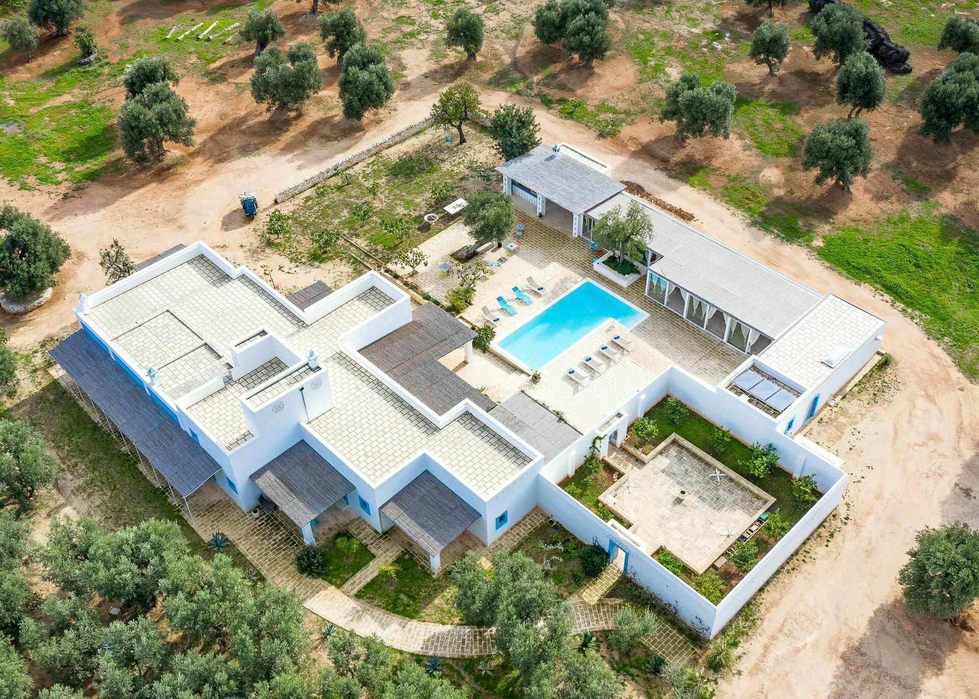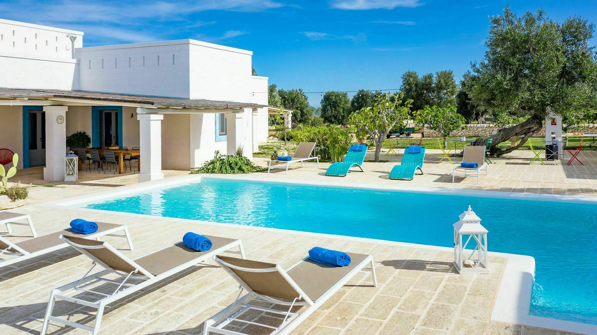 Die Außenbereiche sind ebenso wie die Innenräume sehr gastfreundlich. In dem großen Garten, der den Hof umgibt, befindet sich ein schönes Schwimmbad, das den Gästen exklusiv zur Verfügung steht mit einfachem Zugang über eine römische Treppe, einem Sonnenterrassen-Bereich mit Sonnenliegen sowie einem Bad im Freien mit Dusche. Um die Landschaft des Salento zu genießen und bezaubernde Mittag- und Abendessen im Freien zu organisieren, verfügt die Masseria Tufo Bianco über eine große, mit traditionellem Schilf bedeckte Veranda mit Tisch und Stühlen. Neben den verschiedenen Entspannungsbereichen im Freien, die mit Sofas und Sitzgelegenheiten ausgestattet sind, werden die Gäste im fantastischen Orangenhain der Villa vollständig von den Düften Apuliens umhüllt, wo sich ein weiterer Platz mit Sonenschirmen in einer ruhigen Ecke befindet. Der Stolz der zu vermietenden Villa ist ein kleiner Innenhof neben dem Schwimmbad mit Sukkulenten und Olivenbäumen, in dem man dank der verschiedenen aufgestellten Tische die Möglichkeit hat, zu frühstücken oder entspannende Momente zu verbringen oder vielleicht ein Buch zu lesen.