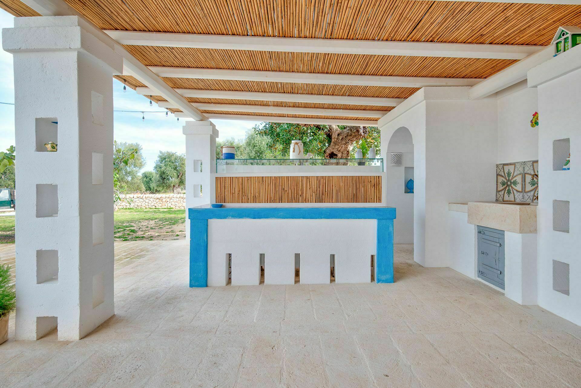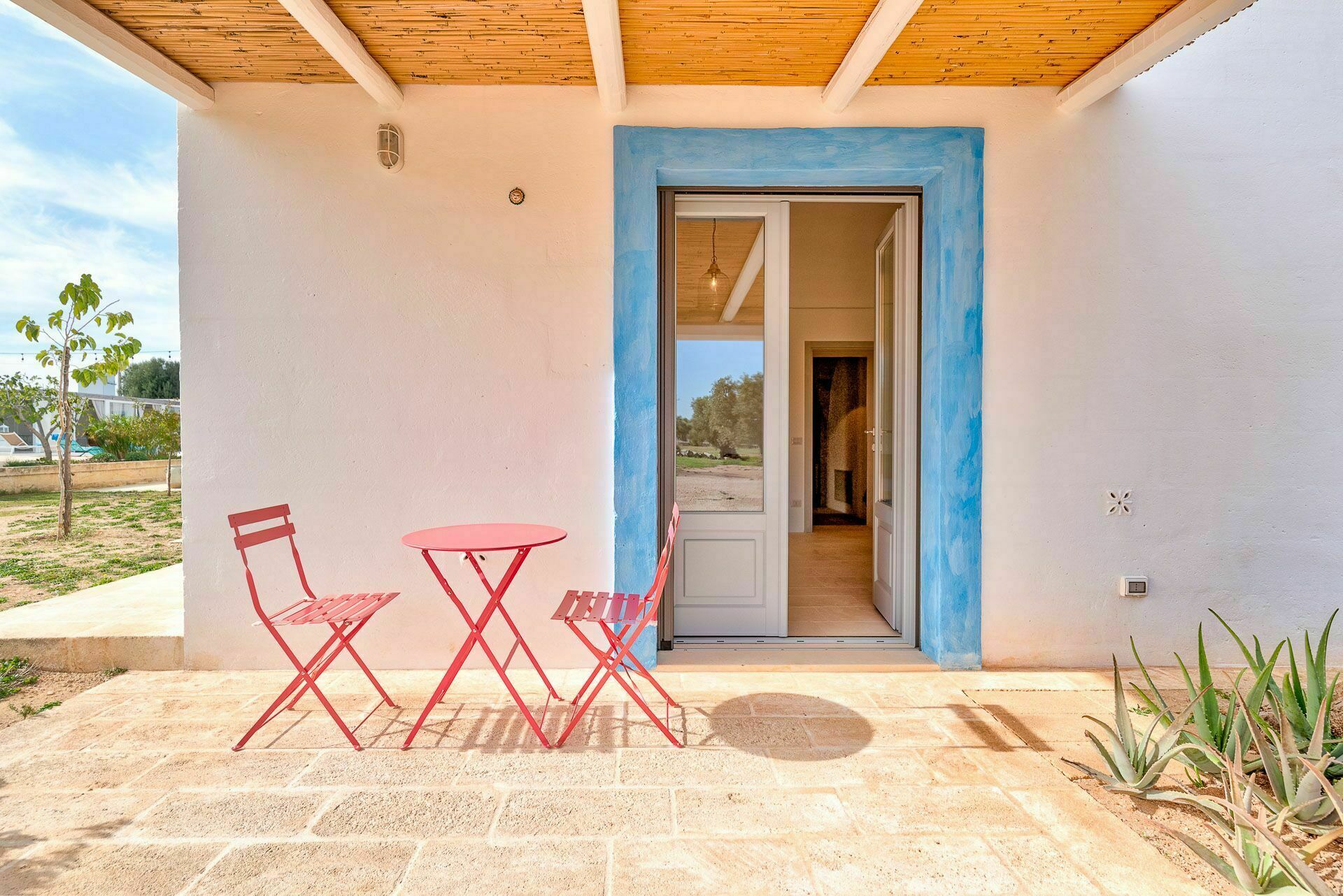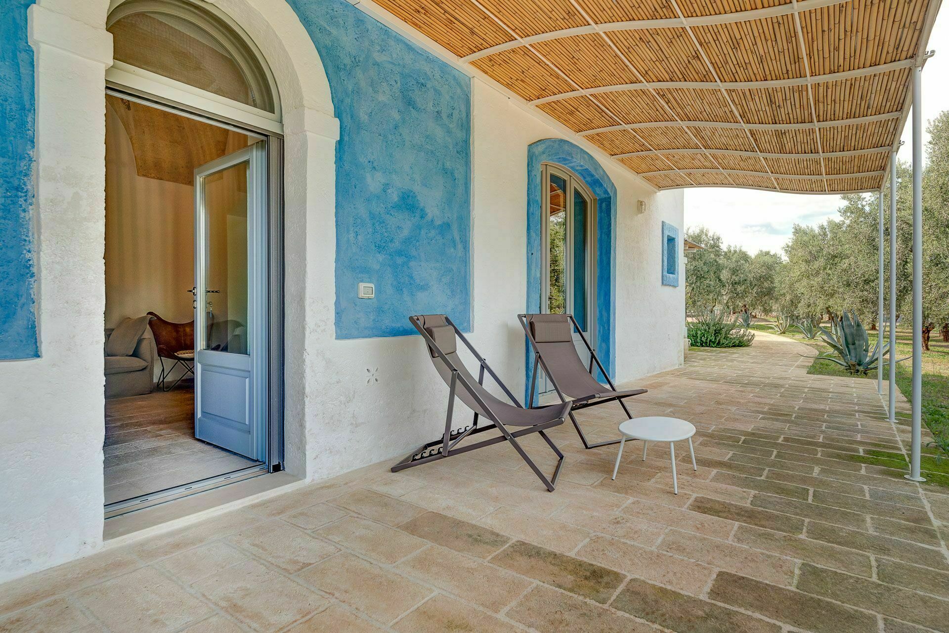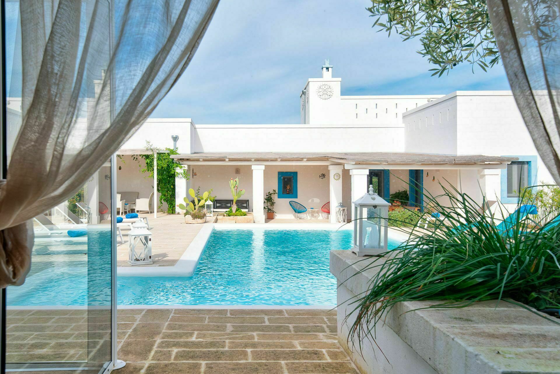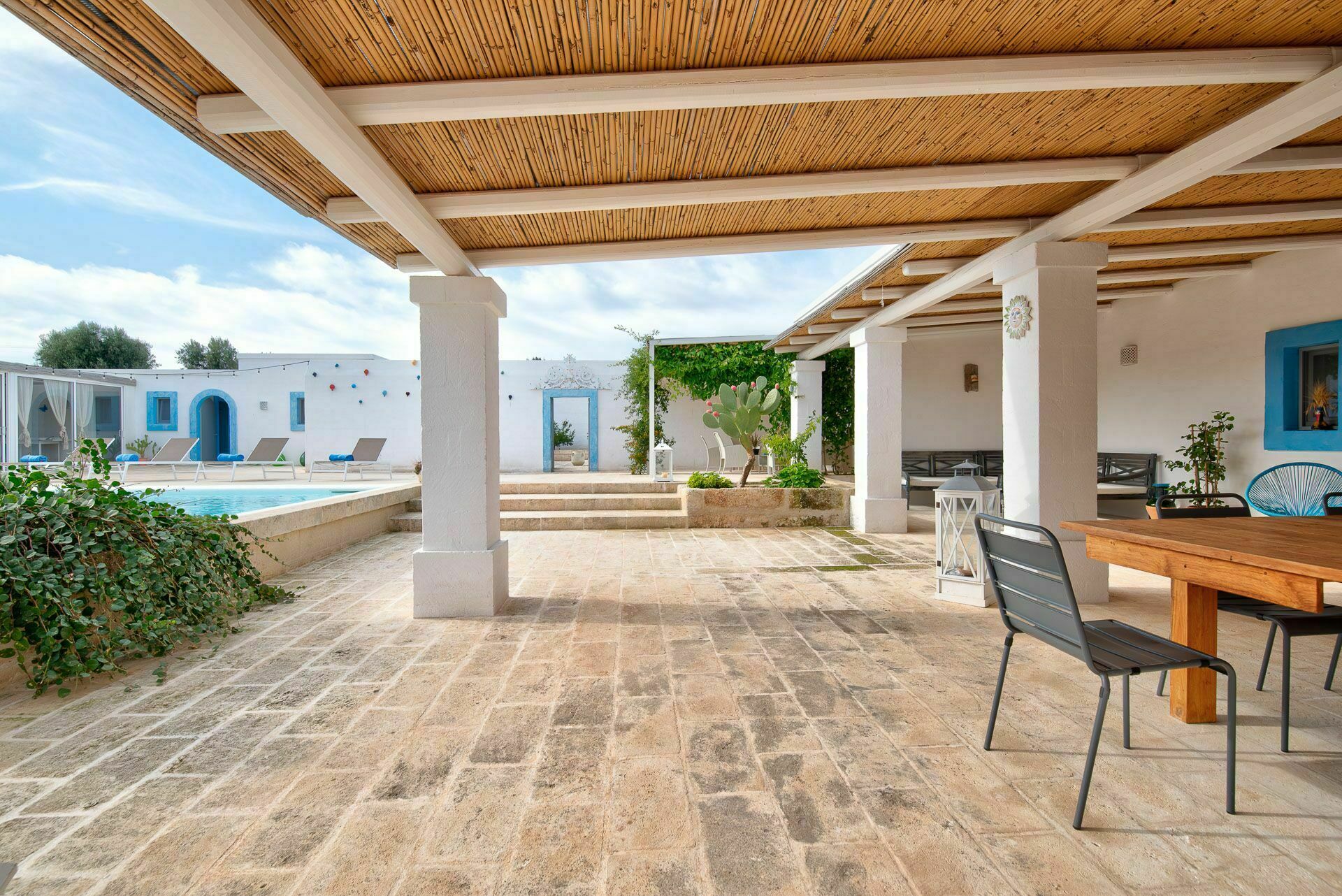 Die Außenbereiche sind ebenso wie die Innenräume sehr gastfreundlich. In dem großen Garten, der den Hof umgibt, befindet sich ein schönes Schwimmbad, das den Gästen exklusiv zur Verfügung steht mit einfachem Zugang über eine römische Treppe, einem Sonnenterrassen-Bereich mit Sonnenliegen sowie einem Bad im Freien mit Dusche. Um die Landschaft des Salento zu genießen und bezaubernde Mittag- und Abendessen im Freien zu organisieren, verfügt die Masseria Tufo Bianco über eine große, mit traditionellem Schilf bedeckte Veranda mit Tisch und Stühlen. Neben den verschiedenen Entspannungsbereichen im Freien, die mit Sofas und Sitzgelegenheiten ausgestattet sind, werden die Gäste im fantastischen Orangenhain der Villa vollständig von den Düften Apuliens umhüllt, wo sich ein weiterer Platz mit Sonenschirmen in einer ruhigen Ecke befindet. Der Stolz der zu vermietenden Villa ist ein kleiner Innenhof neben dem Schwimmbad mit Sukkulenten und Olivenbäumen, in dem man dank der verschiedenen aufgestellten Tische die Möglichkeit hat, zu frühstücken oder entspannende Momente zu verbringen oder vielleicht ein Buch zu lesen.