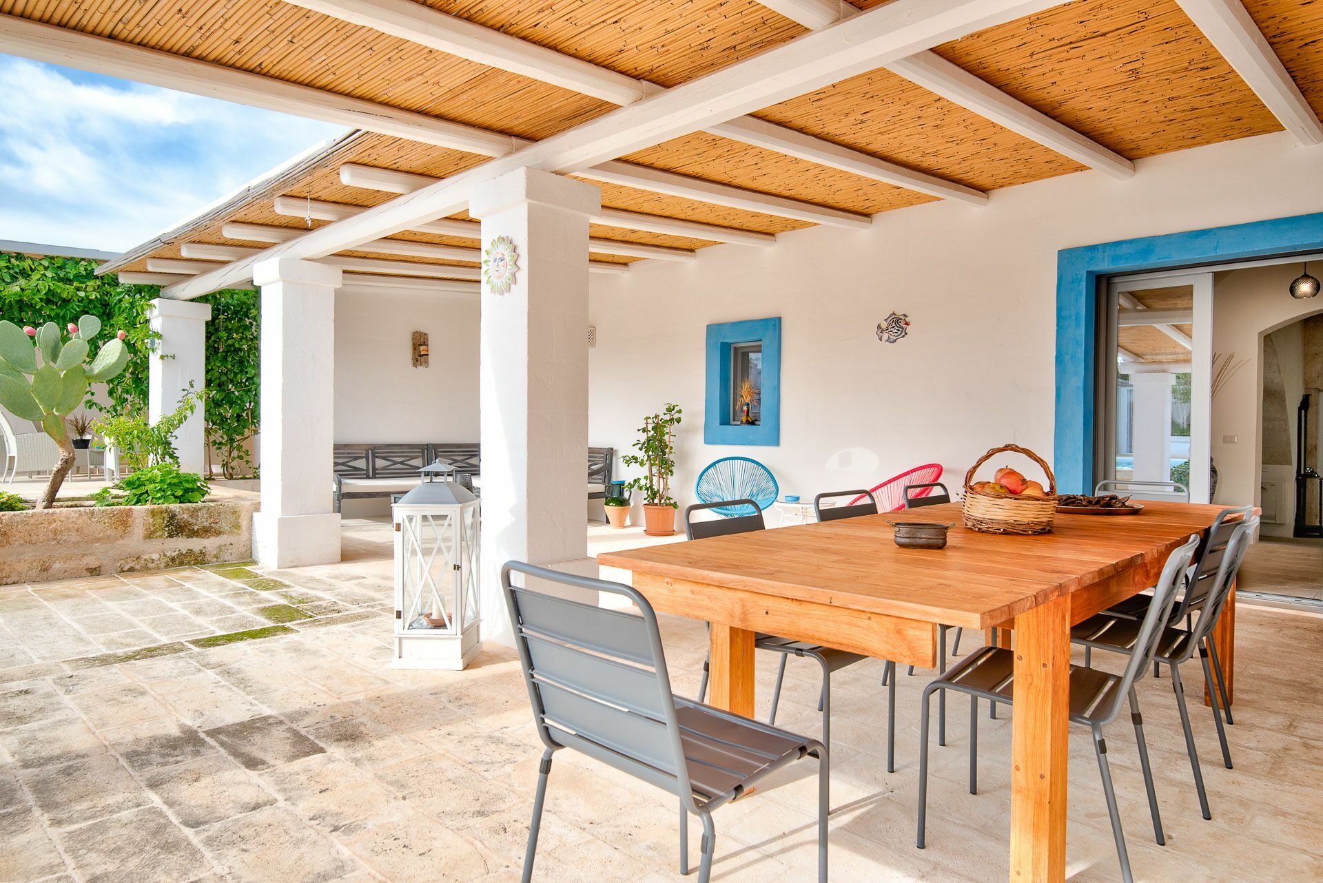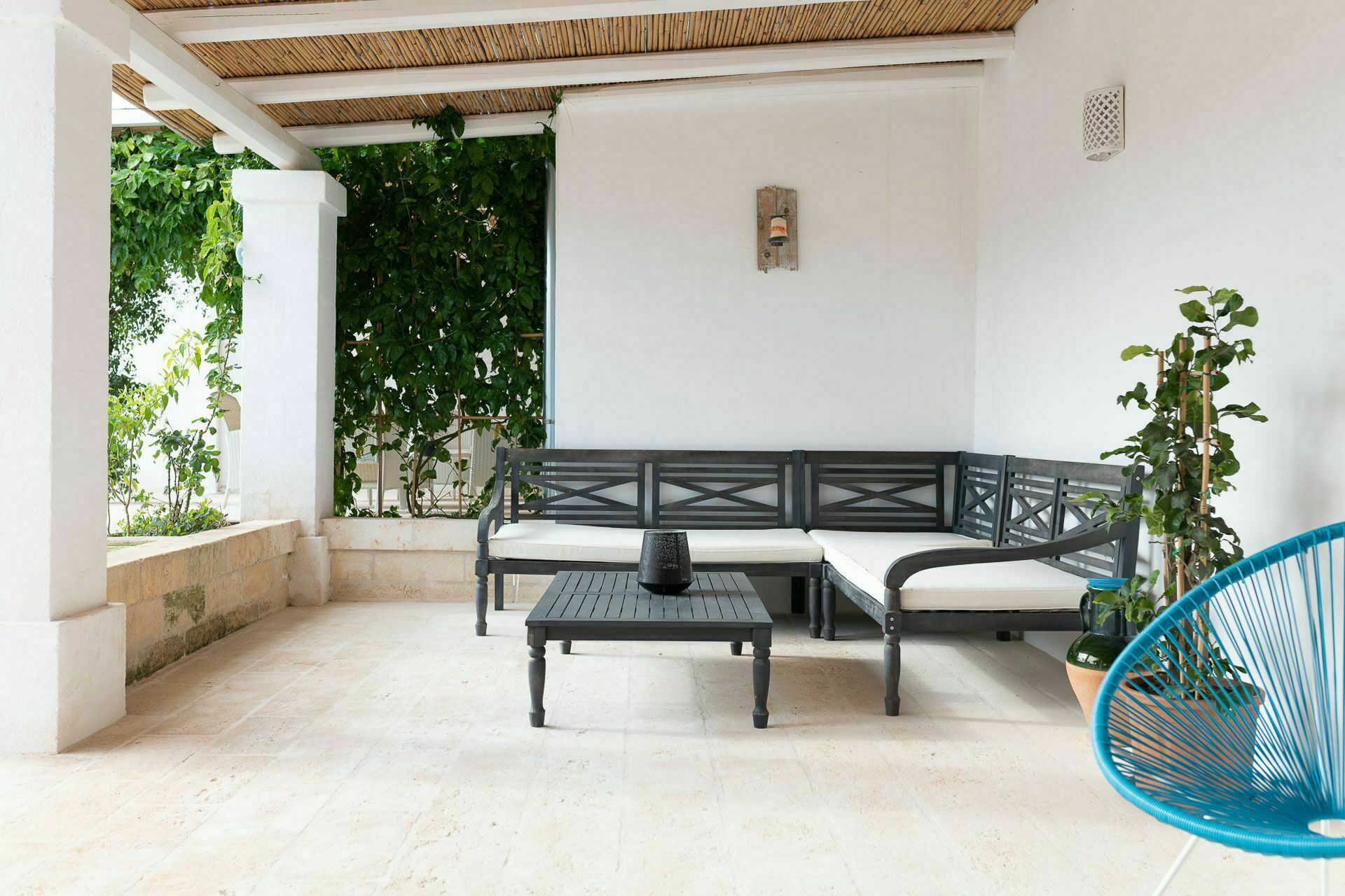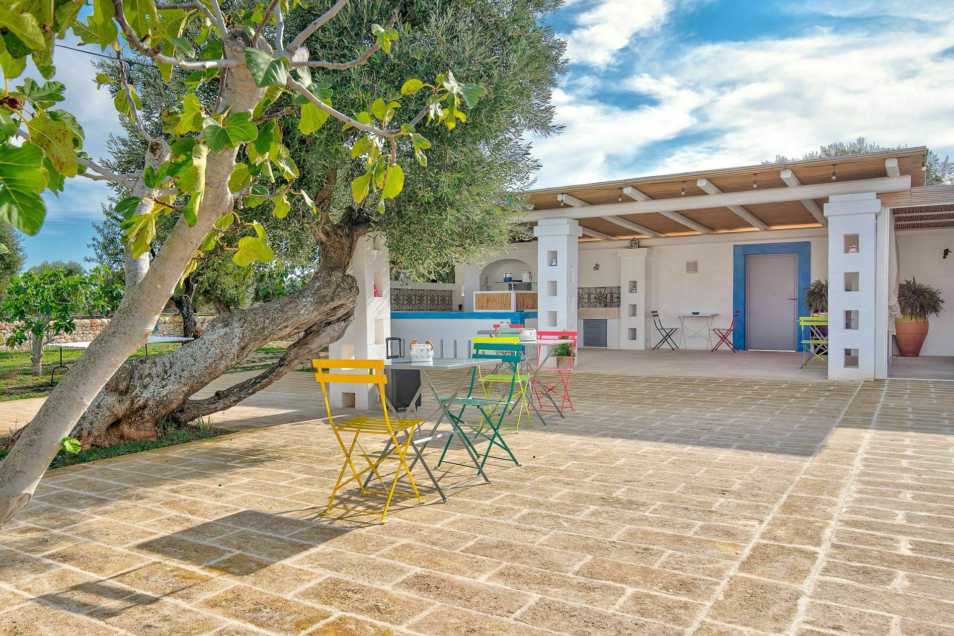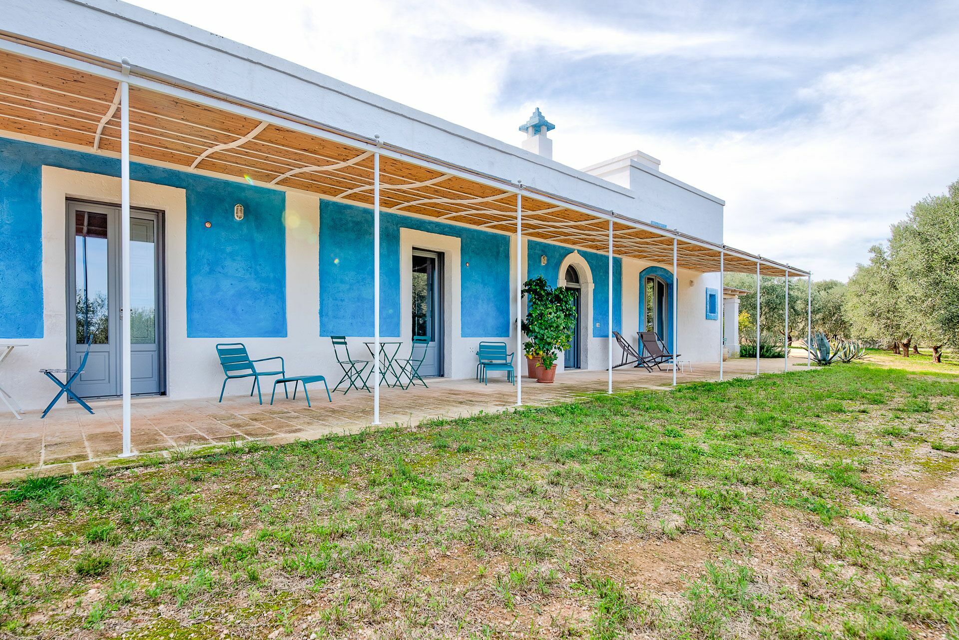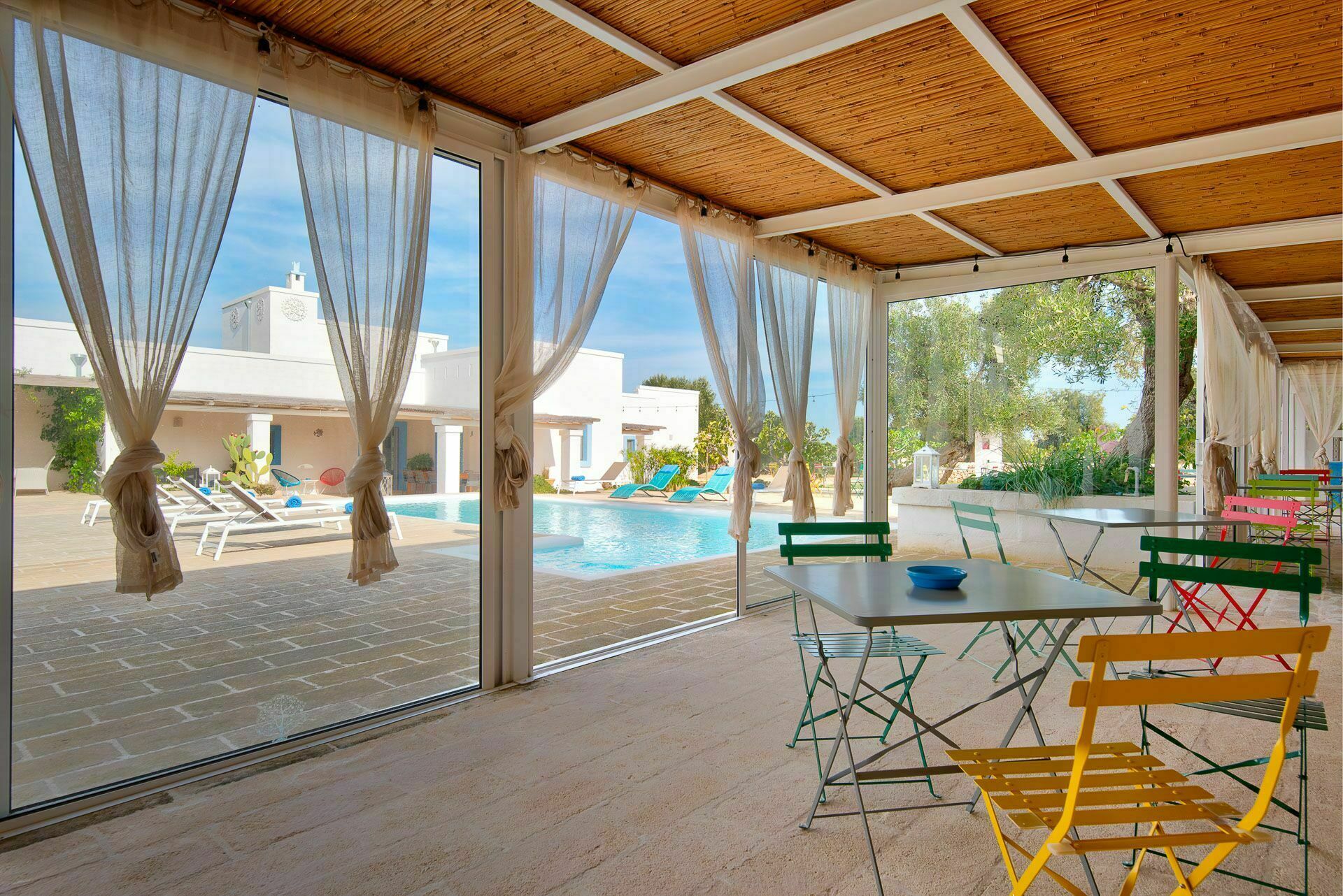 Die Außenbereiche sind ebenso wie die Innenräume sehr gastfreundlich. In dem großen Garten, der den Hof umgibt, befindet sich ein schönes Schwimmbad, das den Gästen exklusiv zur Verfügung steht mit einfachem Zugang über eine römische Treppe, einem Sonnenterrassen-Bereich mit Sonnenliegen sowie einem Bad im Freien mit Dusche. Um die Landschaft des Salento zu genießen und bezaubernde Mittag- und Abendessen im Freien zu organisieren, verfügt die Masseria Tufo Bianco über eine große, mit traditionellem Schilf bedeckte Veranda mit Tisch und Stühlen. Neben den verschiedenen Entspannungsbereichen im Freien, die mit Sofas und Sitzgelegenheiten ausgestattet sind, werden die Gäste im fantastischen Orangenhain der Villa vollständig von den Düften Apuliens umhüllt, wo sich ein weiterer Platz mit Sonenschirmen in einer ruhigen Ecke befindet. Der Stolz der zu vermietenden Villa ist ein kleiner Innenhof neben dem Schwimmbad mit Sukkulenten und Olivenbäumen, in dem man dank der verschiedenen aufgestellten Tische die Möglichkeit hat, zu frühstücken oder entspannende Momente zu verbringen oder vielleicht ein Buch zu lesen.