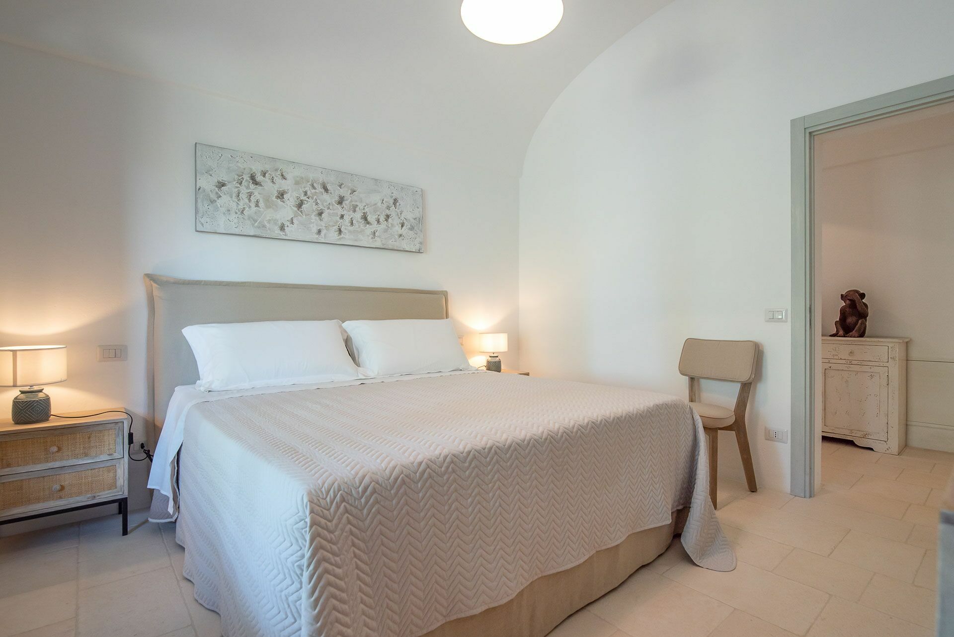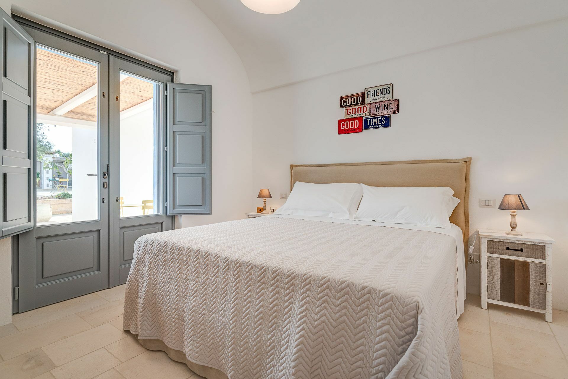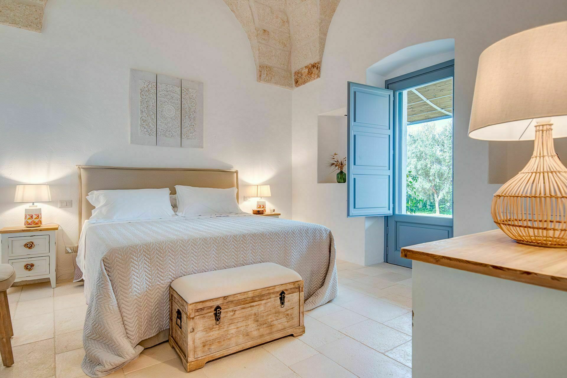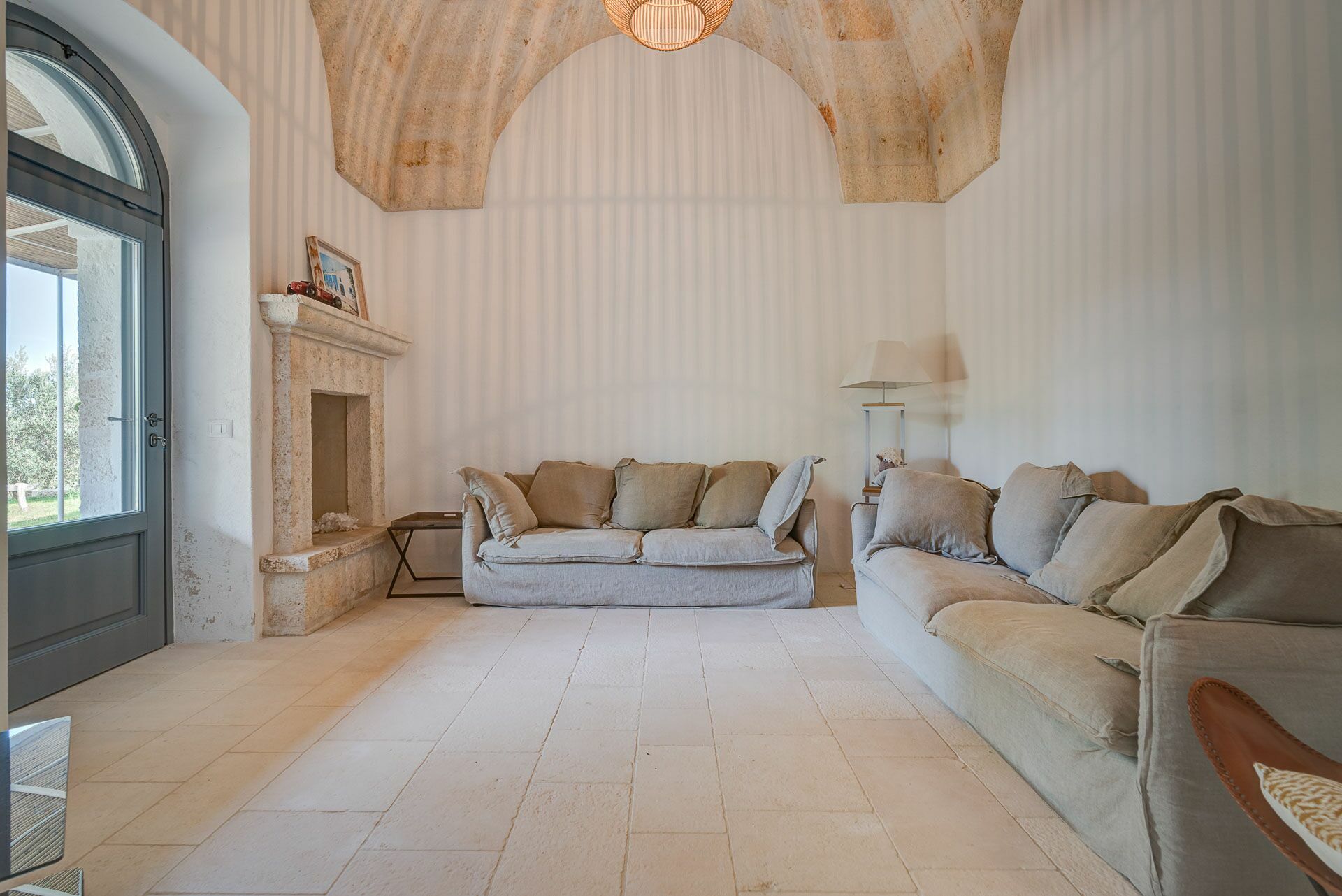 Besonders interessant ist die schöne Gestaltung der Innenräume des Gutshofes, die eine perfekte Kombination aus zeitgenössischem Design und ländlicher Architektur schaffen. Dank der 5 Doppelzimmer bietet die Villa Platz für bis zu 10 Personen in einer einladenden und funktionalen Umgebung. Die Innenräume sind gut aufgeteilt und hell: Dank der großen Säle mit Tuffgewölbe werden auch Regentage kein Problem für die Gäste sein, denn sie können wunderbare Momente in Gesellschaft von Freunden und Familie in schönster Atmosphäre verbringen.