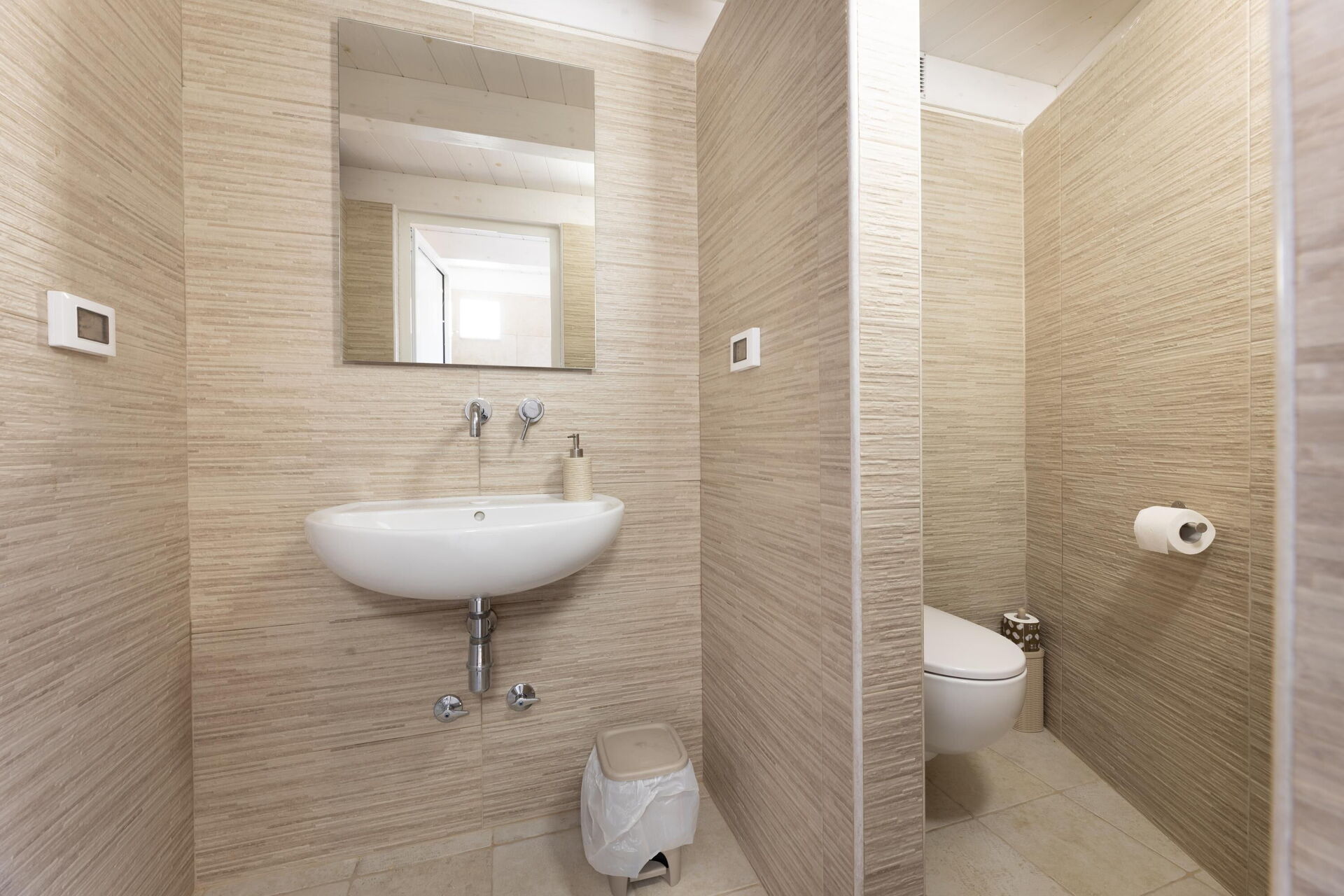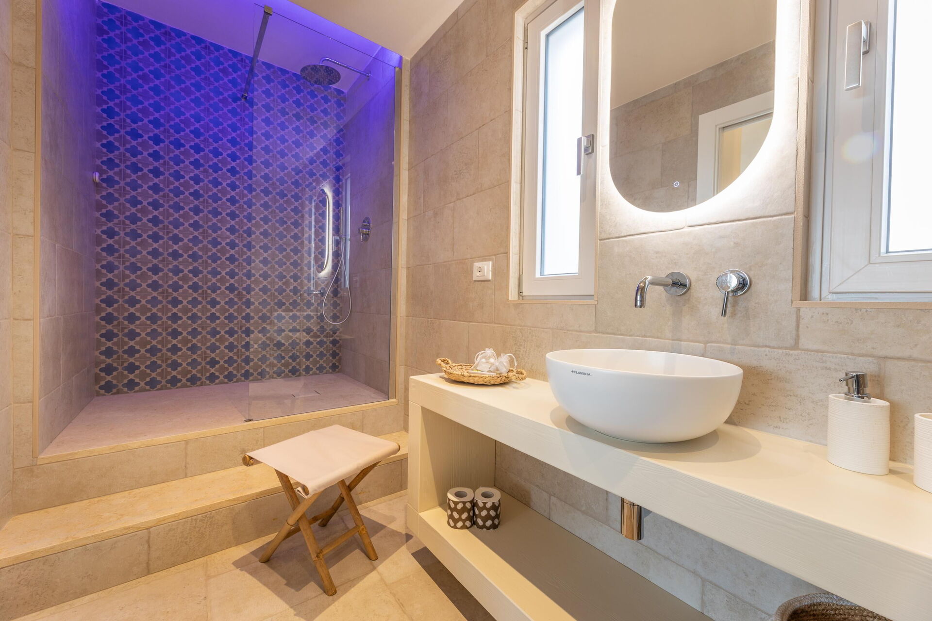 Erdgeschoss: (Nur von außen zugänglich und nicht intern miteinander oder mit dem Rest der Villa verbunden): 3 Doppelzimmer mit privatem Bad mit Dusche und Außen-Whirlpool (1,80 x 1,20 m; Tiefe 0,40 m; beheizt auf 28–32 °C).