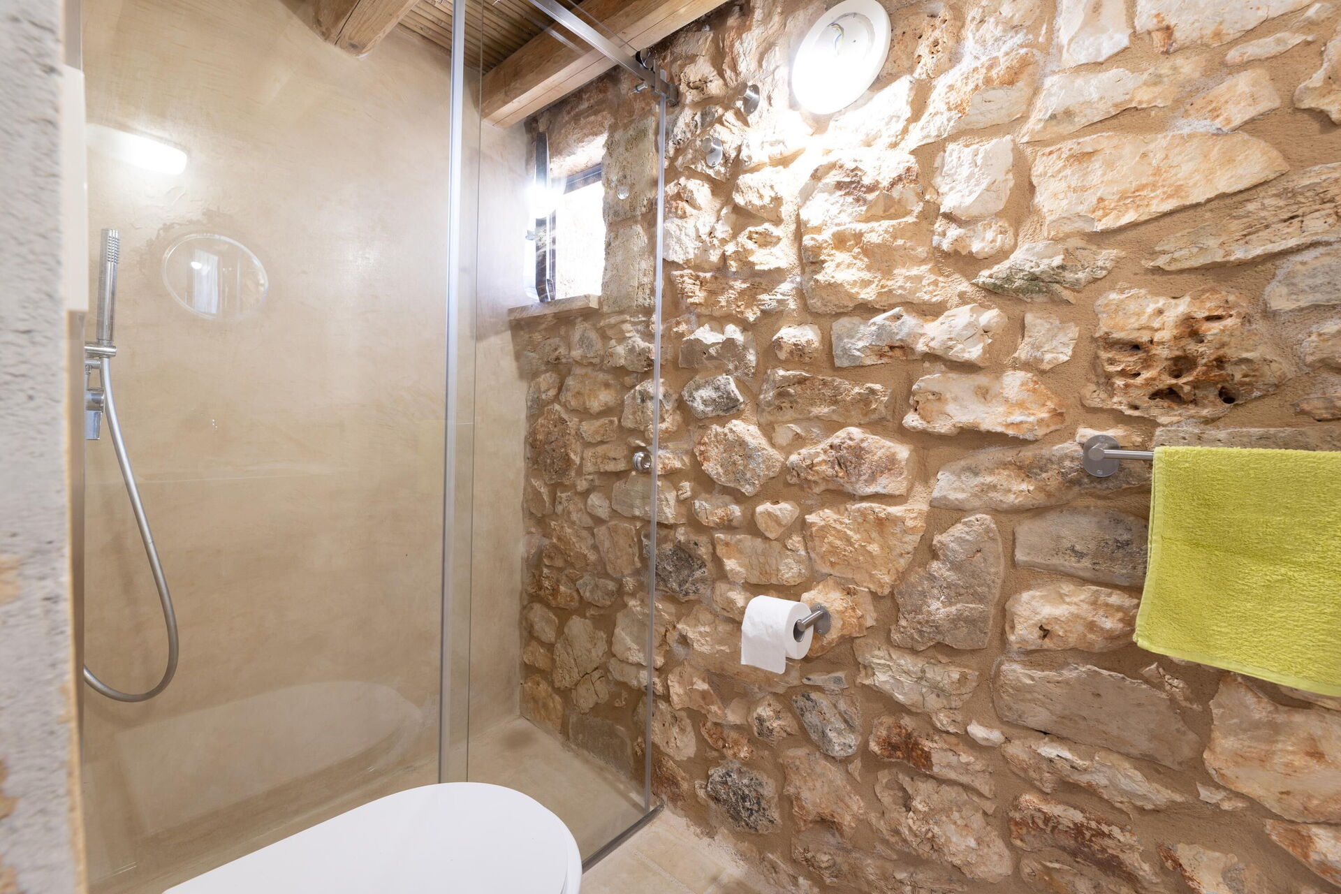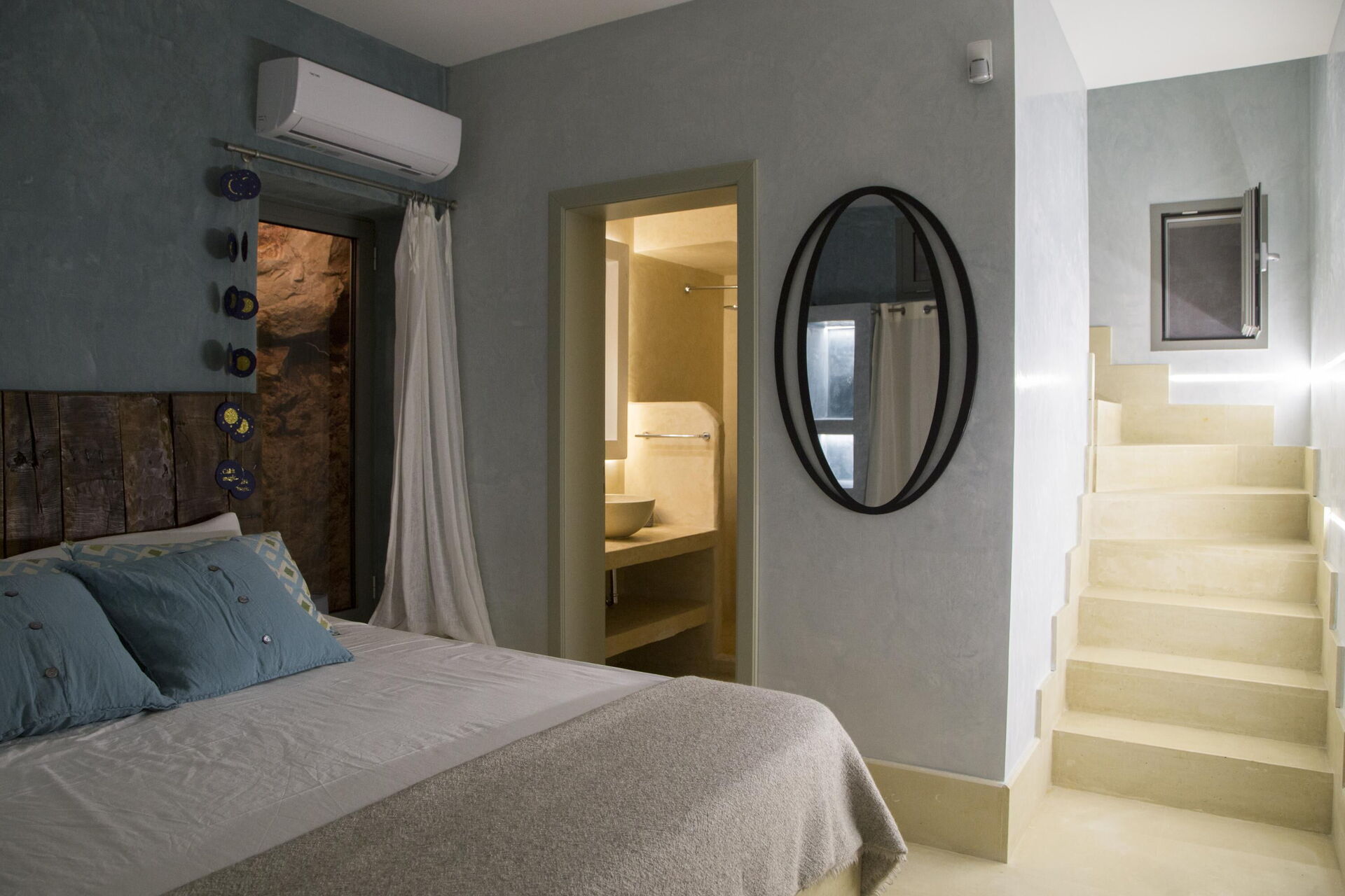 Schlafzimmer mit Doppelbett (Klimaanlage) und Badezimmer mit Dusche (ohne Fenster).