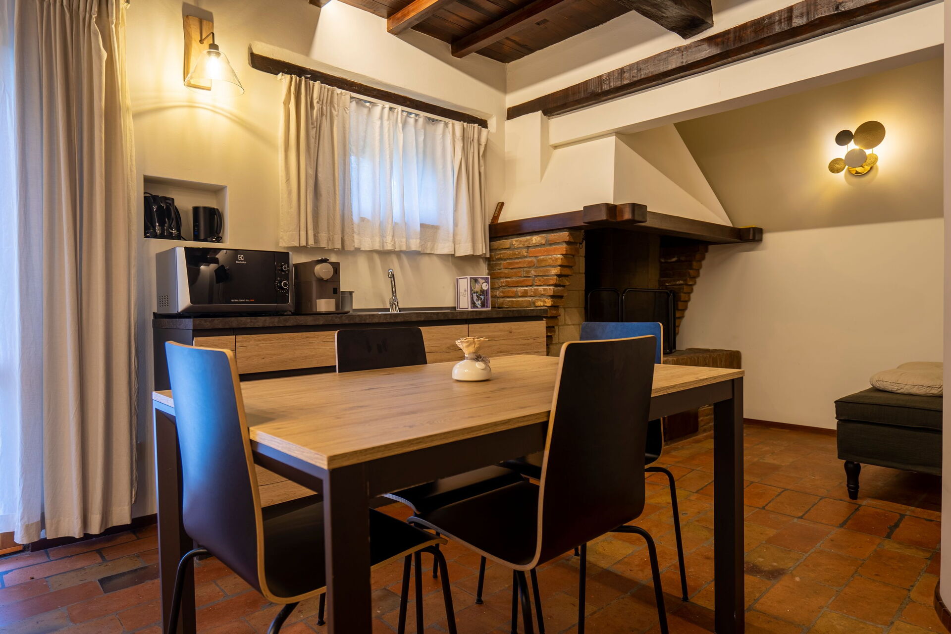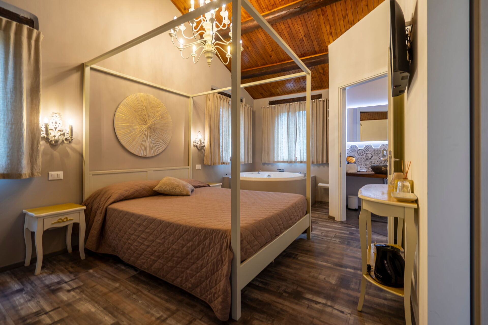 Erdgeschoss: Wohnzimmer (Klimaanlage, TV) mit Essbereich und Küche (Herd, Backofen, Gefrierschrank, Kühlschrank, Geschirrspüler, Kaffeemaschine); Suite mit Wohnzimmer mit Kamin, Doppelschlafsofa, TV, Schlafzimmer mit Doppelbett (Klimaanlage, TV, Minibar)mit Eck-Whirlpool-Badewanne mit Farbtherapie, mit privatem Bad mit begehbarer Dusche (ideal für Personen mit eingeschränkter Mobilität), Zugang zu einer privaten Terrasse mit Blick auf den Park; Suite mit Wohnzimmer mit Kamin, Küchenzeile (Herd, Kühlschrank), Einzelschlafsofa, TV, Schlafzimmer mit Doppelbett (Klimaanlage, TV, Minibar) mit Eck-Whirlpool-Badewanne mit Farbtherapie und privatem Bad mit Multifunktionsdusche mit Farbtherapie und Türkischem Bad .