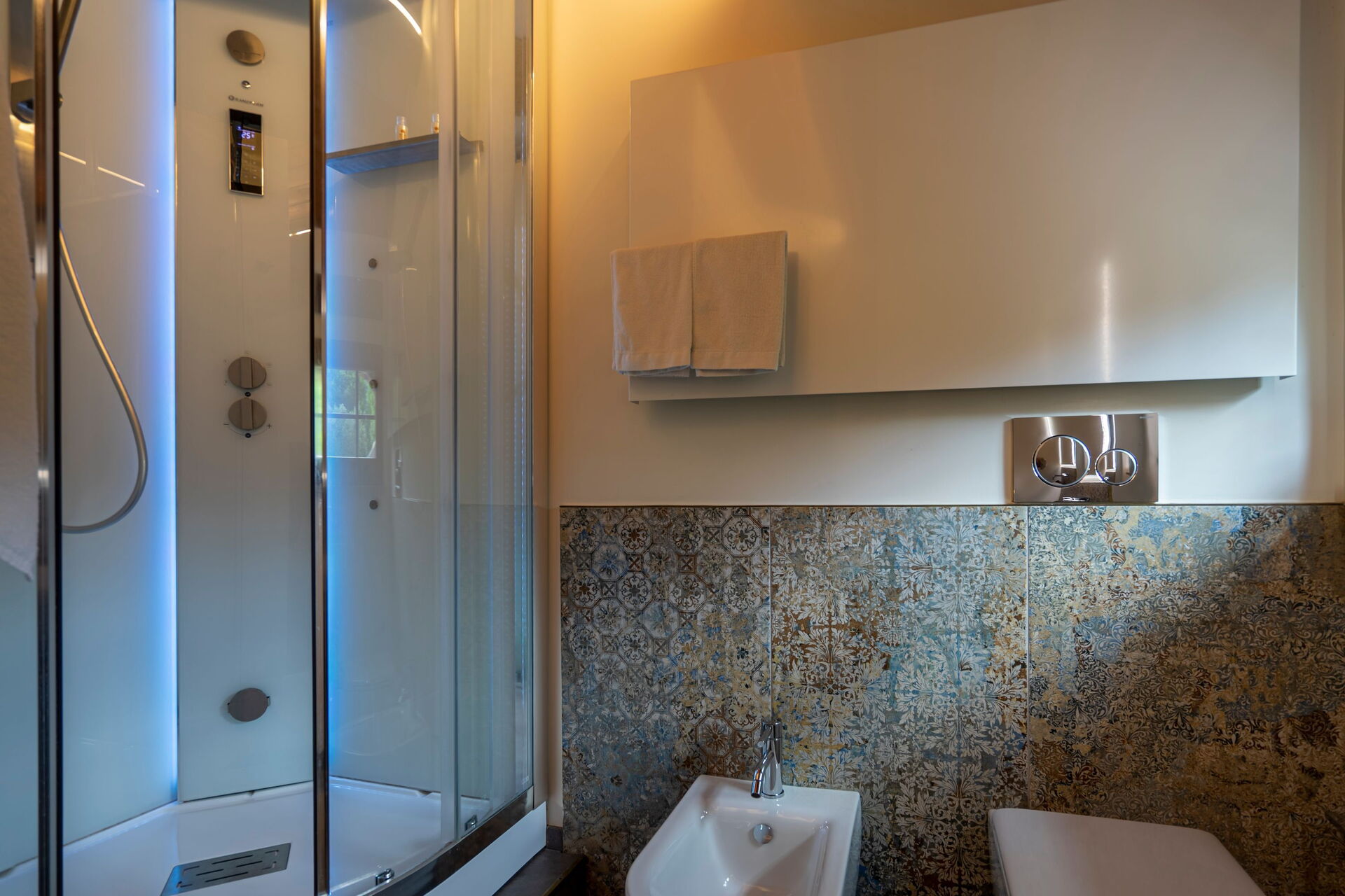 Erster Stock: Doppelzimmer (Klimaanlage, Fernseher, Minibar) mit privatem Bad mit Multifunktionsdusche mit Farbtherapie und türkischem Bad; Schlafzimmer mit Doppelbett (Klimaanlage, Fernseher, Minibar) mit Einzelschlafsofa, Hydromassagewanne mit Farbtherapie und privatem Bad mit Multifunktionsdusche mit Farbtherapie und türkischem Bad.
