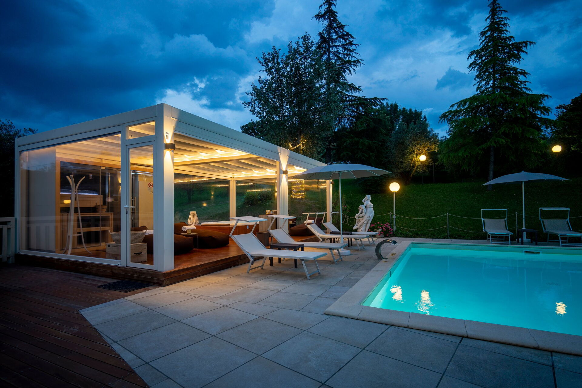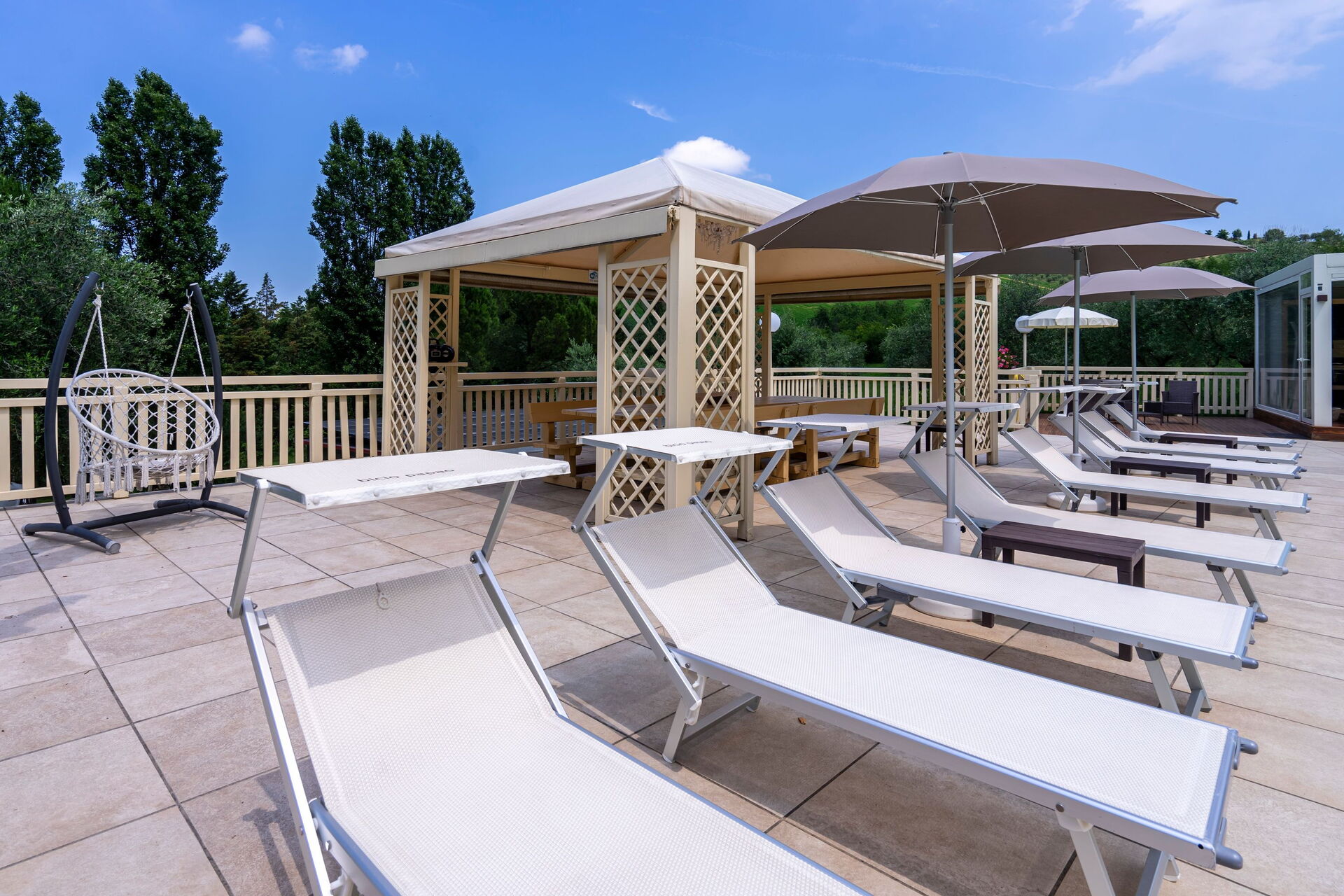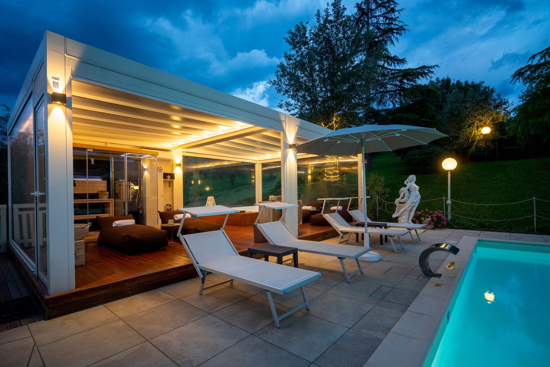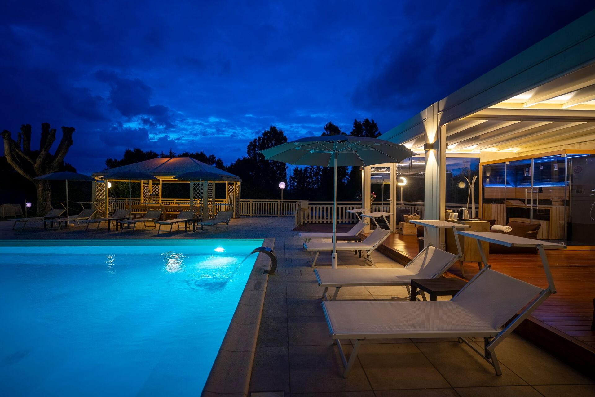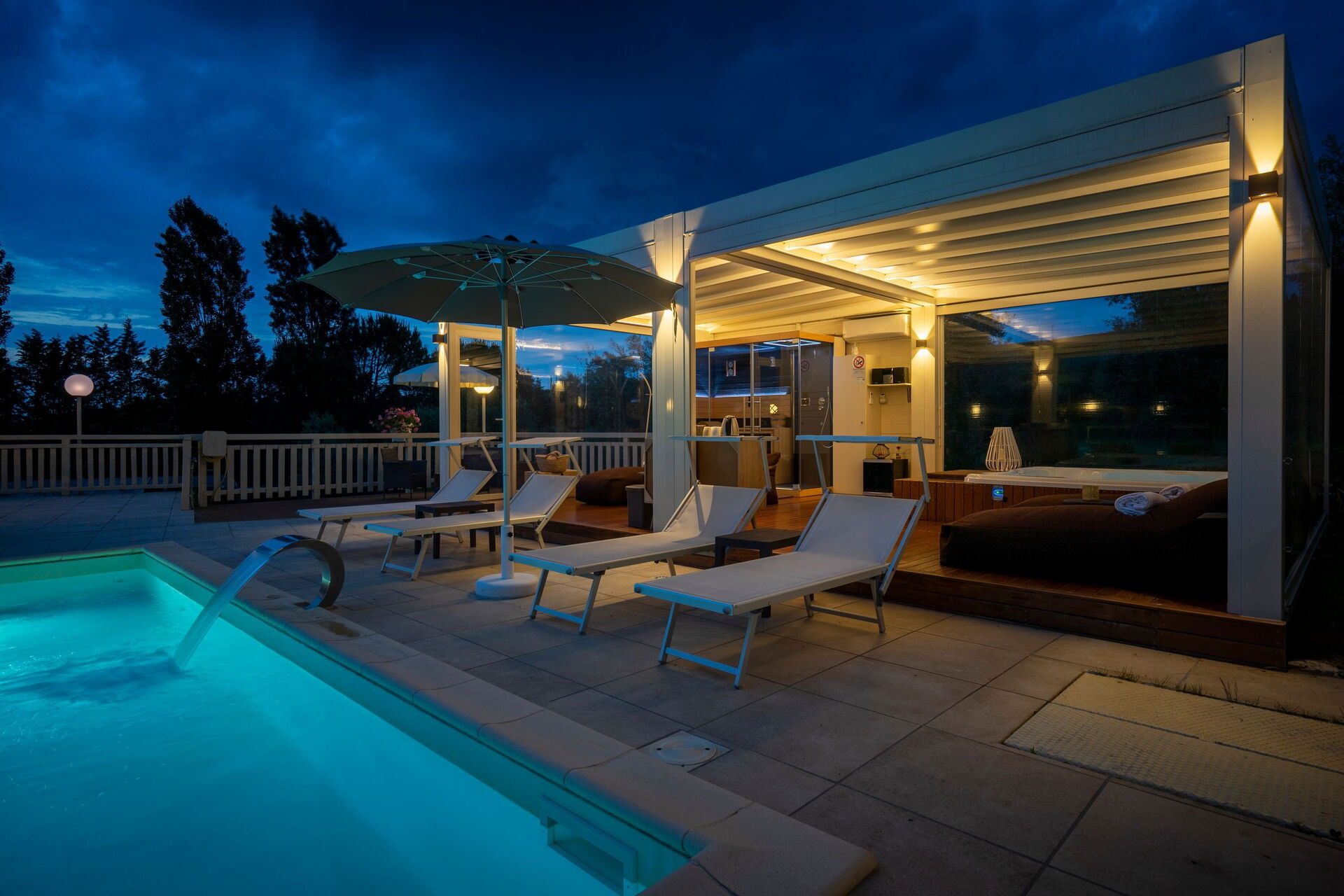 Die Panorama-Außenbereiche bieten zahlreiche Gemeinschaftsbereiche und ermöglichen es den Gästen, sich am Schwimmbad zu entspannen, wo sich neben der Sonnenterrasse ein Pavillon und ein Outdoor-Spa mit Sauna und Türkischem Bad befindet, das von 14.00 bis 00.00 Uhr geöffnet ist, und ein beheizbares Whirlpool verfügbar h/24.