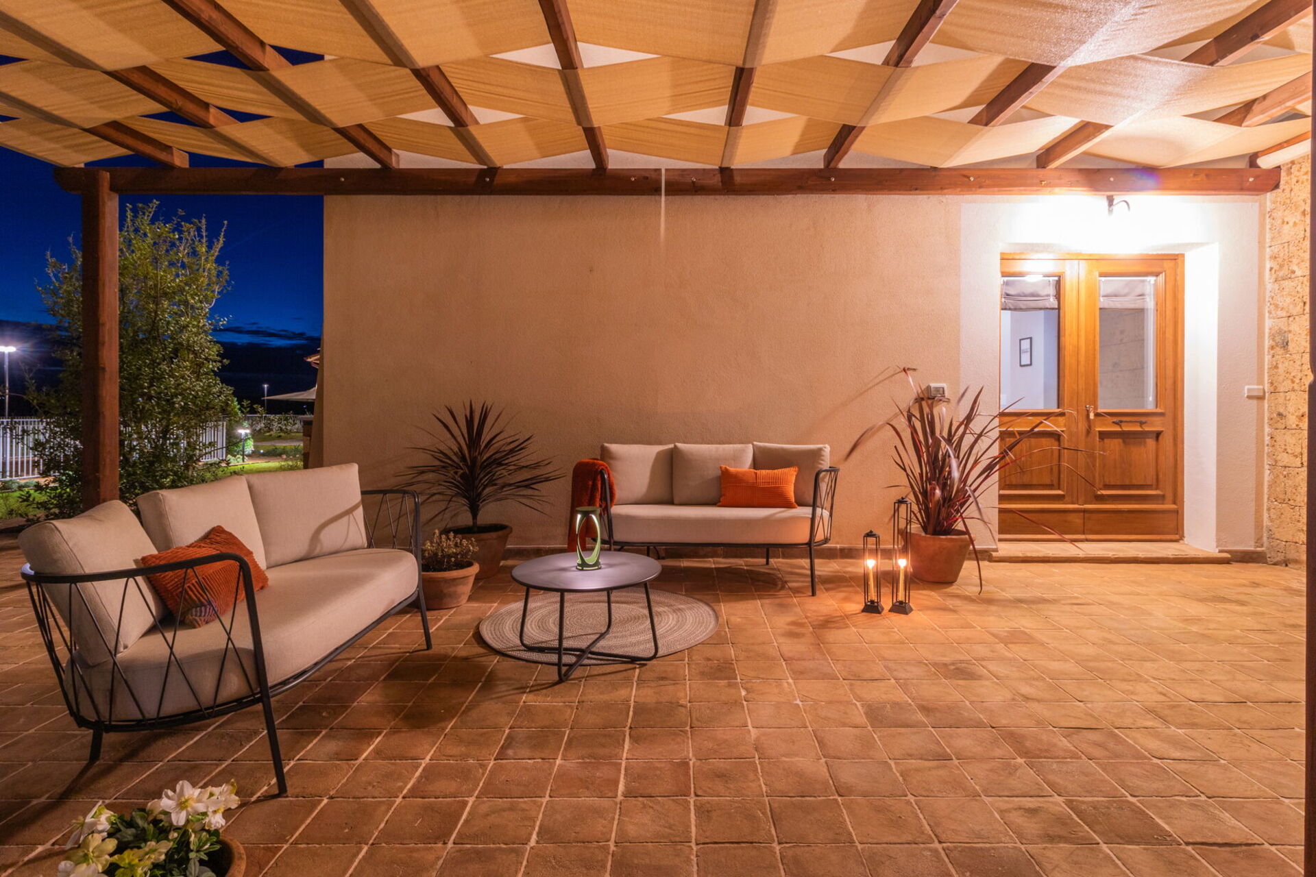 - Panoramaveranda mit Holzpergola und Sonnensegeln, ausgestattet für Mahlzeiten im Freien