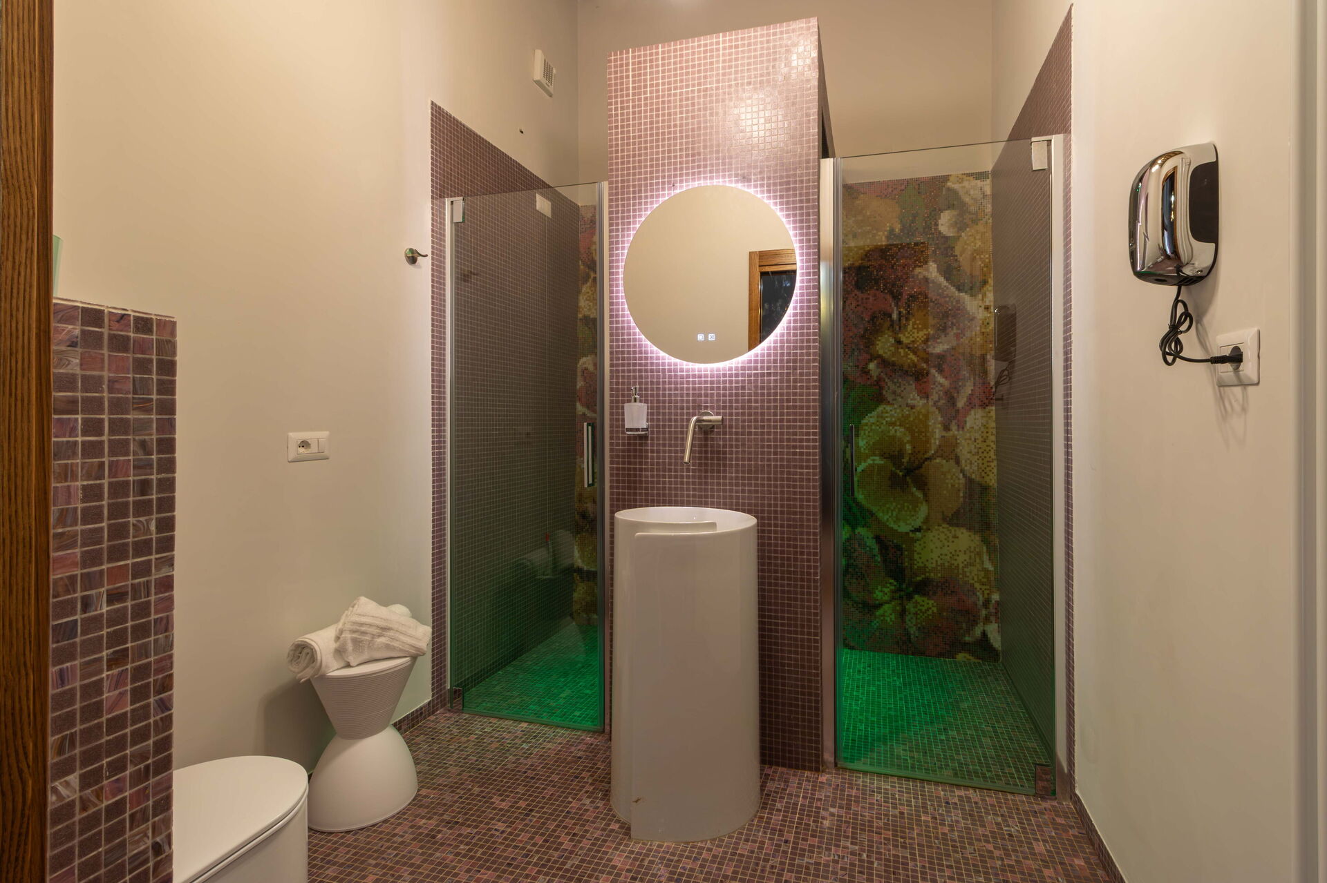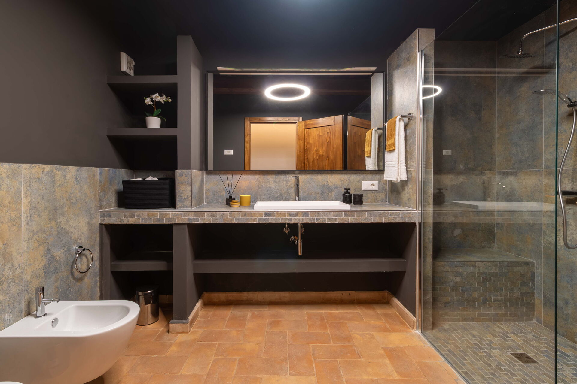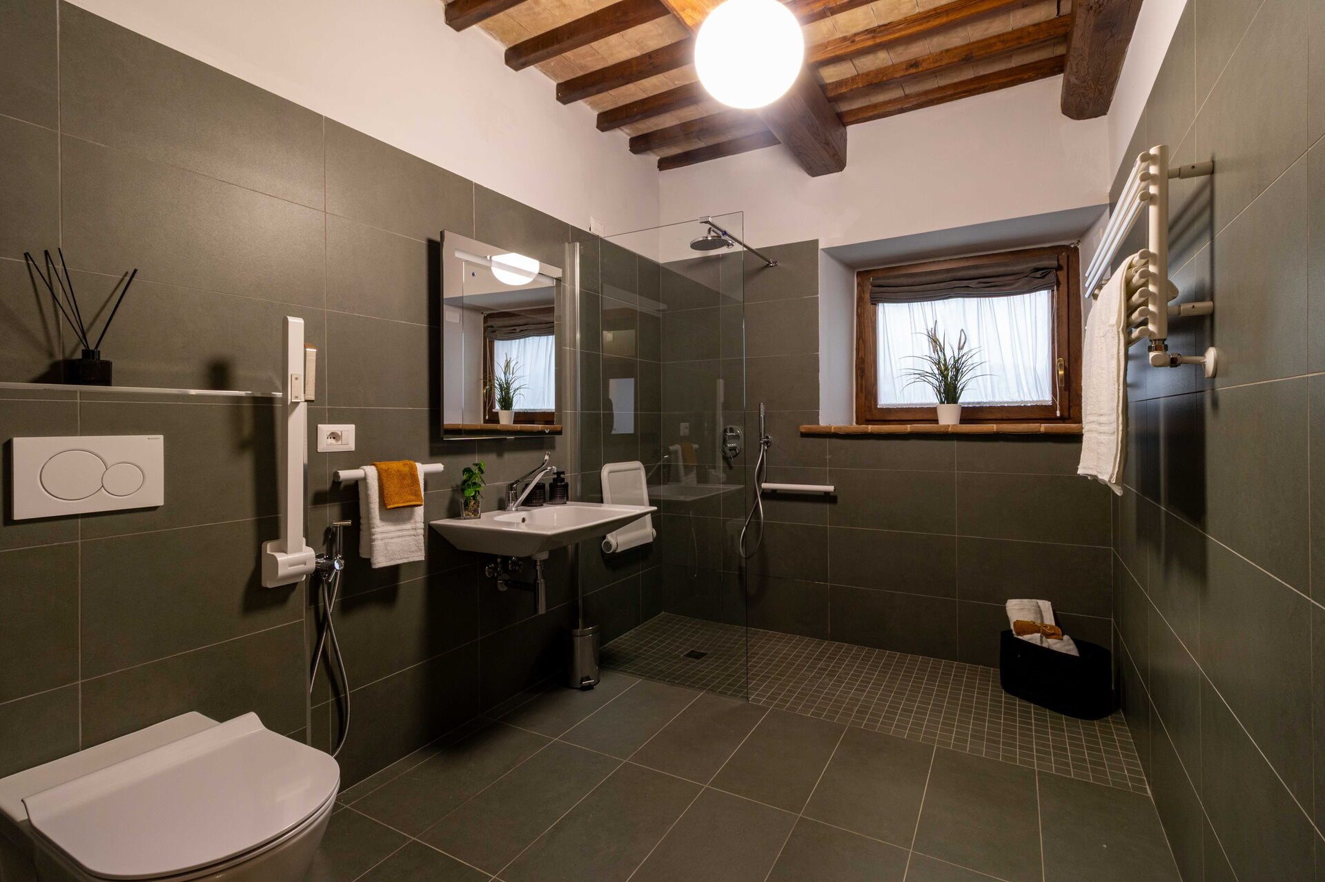 Erdgeschoss (nicht intern mit den anderen Wohneinheiten verbunden): Schlafzimmer mit Doppelbett und privatem Badezimmer mit ebenerdiger Dusche (ohne Fenster, ideal für Personen mit eingeschränkter Mobilität und Menschen mit Behinderungen).