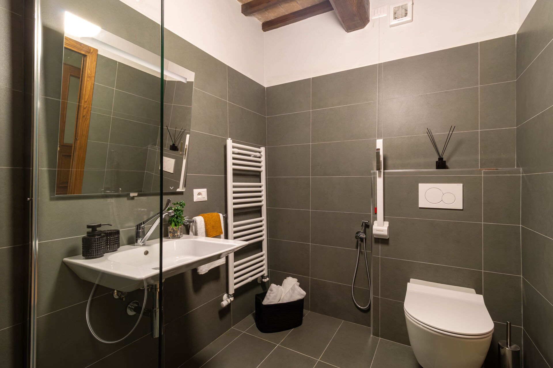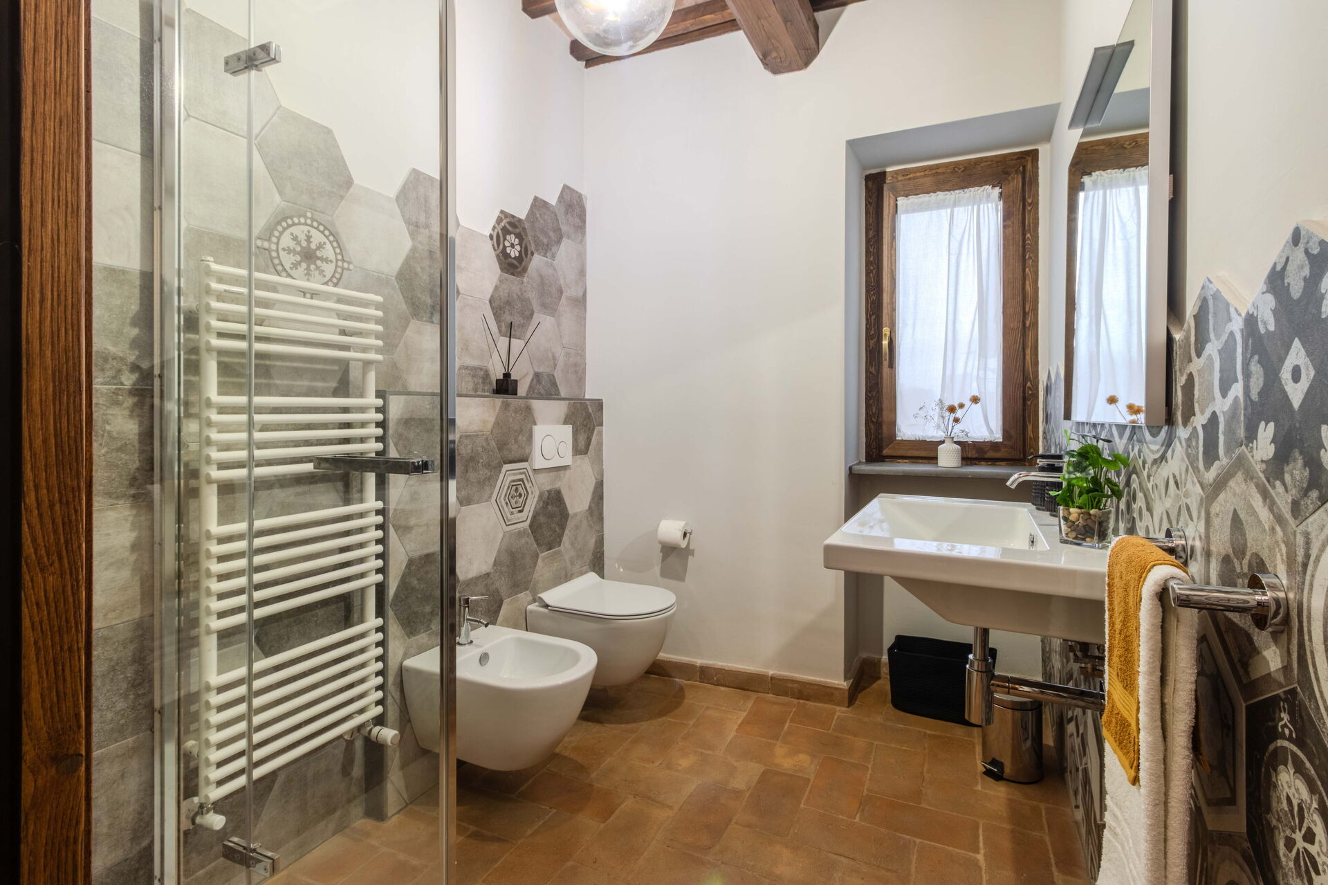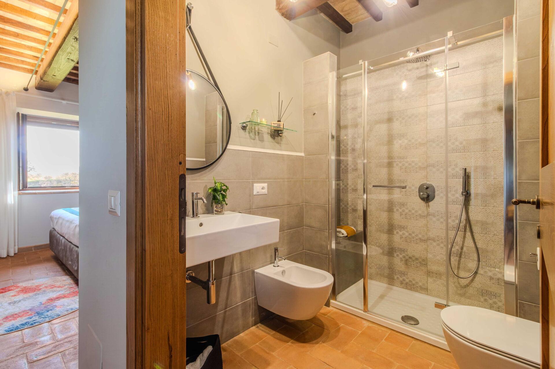 Erdgeschoss (nicht intern mit den anderen Wohneinheiten verbunden): Schlafzimmer mit Doppelbett und privatem Badezimmer mit ebenerdiger Dusche (ohne Fenster, ideal für Personen mit eingeschränkter Mobilität und Menschen mit Behinderungen).