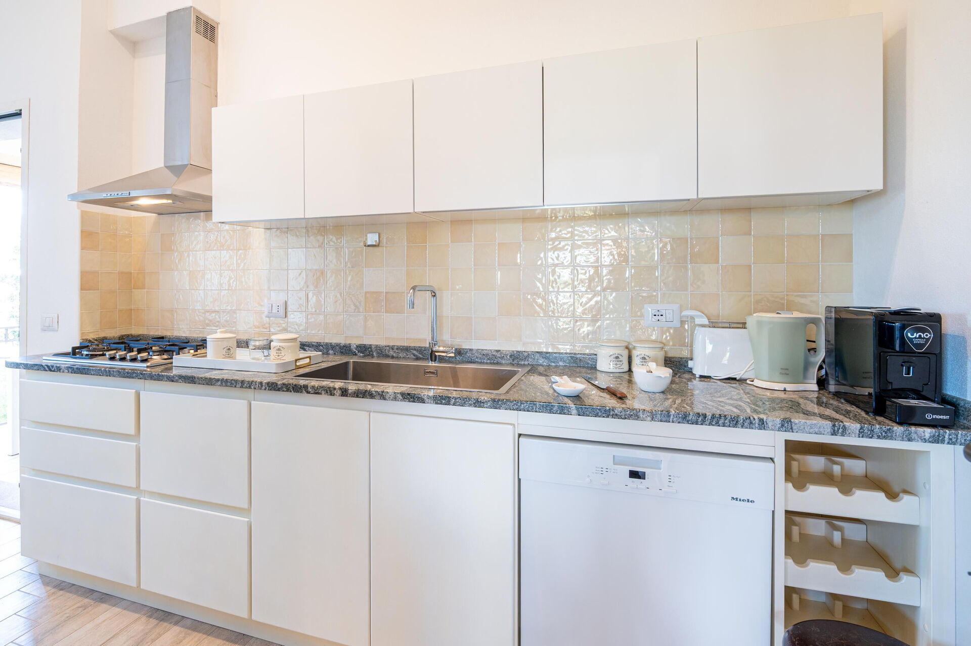 Erdgeschoss: helles Wohnzimmer (Sat-TV) mit Essbereich, Küche (Herd, Backofen, Kühlschrank, Gefrierschrank, Geschirrspüler, Mikrowelle, Espressomaschine) mit Zugang zu einer Terrasse, die für Mahlzeiten im Freien mit Panoramablick auf das Meer ausgestattet ist; Schlafzimmer mit Doppelbett, Schlafzimmer mit Doppelbett (Bett auf Wunsch in 2 Einzelbetten teilbar), Badezimmer mit Dusche, Schlafzimmer mit französischem Bett, Badezimmer mit Dusche und Waschmaschine.