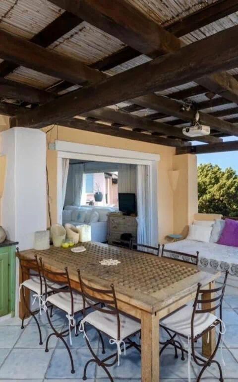 Das Appartment verfügt über eine überdachte Panoramaveranda mit Tisch und Stühlen, auf der man im Freien essen und einen schönen Blick auf den alten Pier der Bucht von Porto Cervo genießen kann.