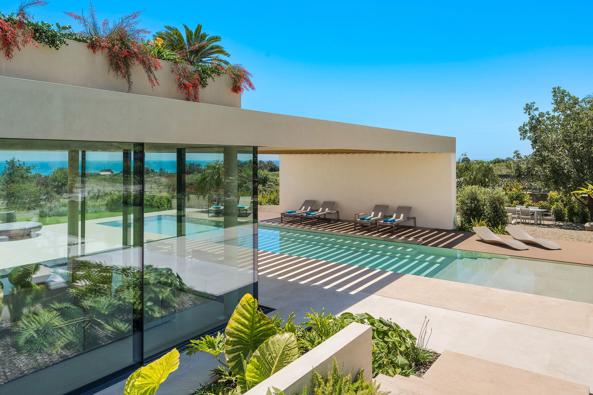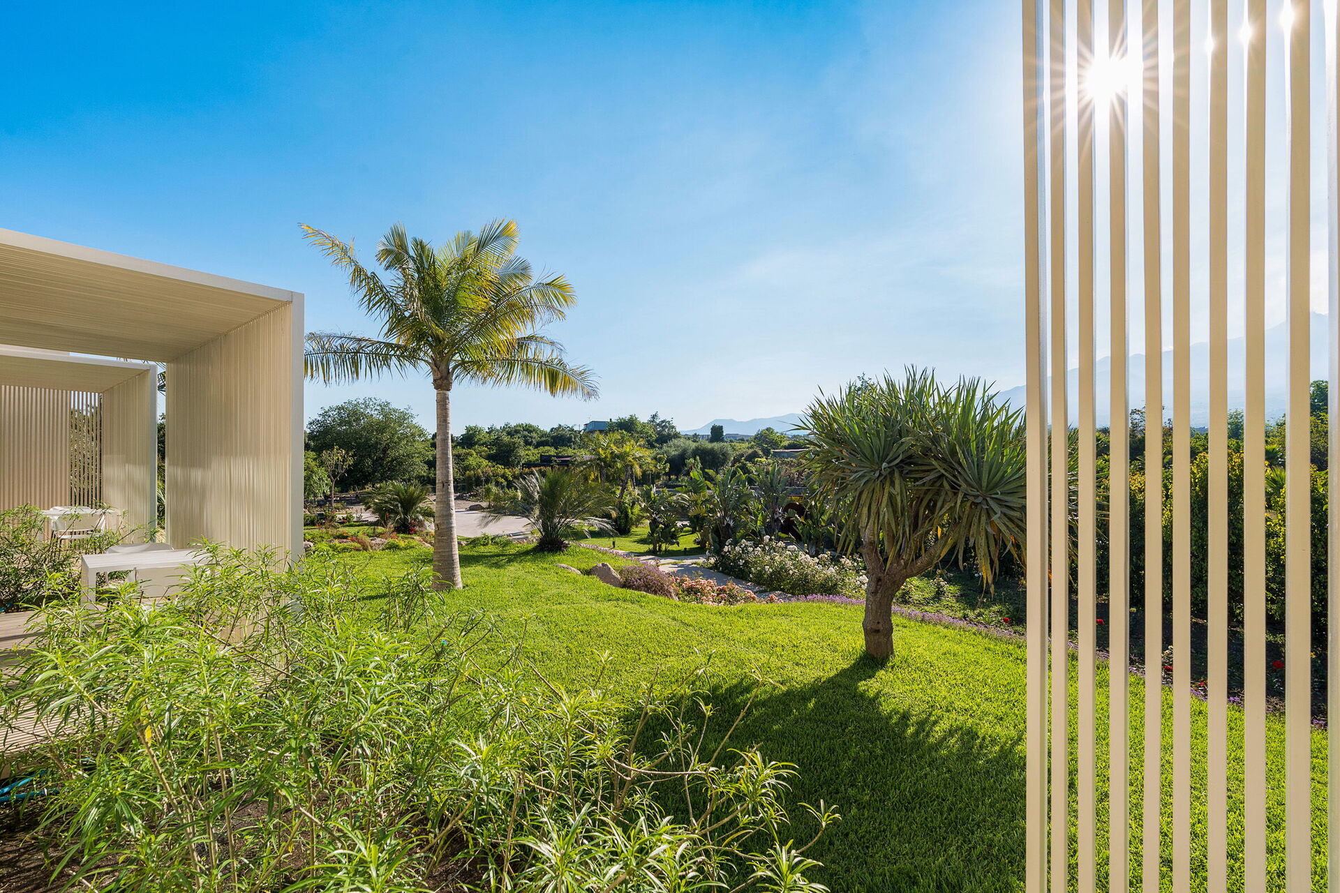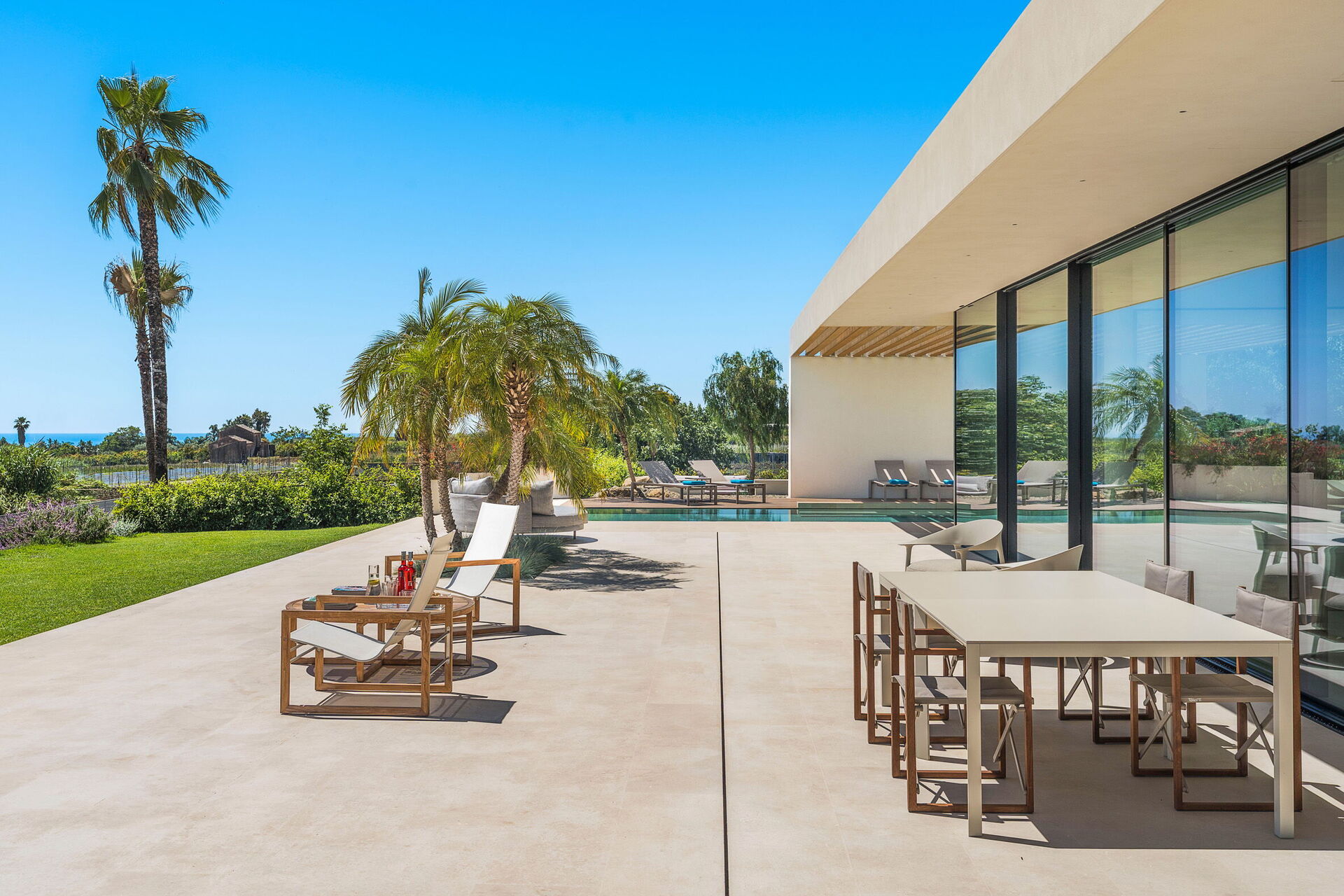 Die Panorama-Außenbereiche bieten zahlreiche Bereiche, die es den Gästen ermöglichen, einen angenehmen Aufenthalt mit Familie oder Freunden zu verbringen: Die Gäste können im Freien essen, am auf Schwimmbad (mit Hydromassagebereich und Salzreinigungssystem) entspannen oder auf der Sonnenterrasse, die sich ideal für unvergessliche Momente unter der sizilianischen Sonne eignet, ausruhen.