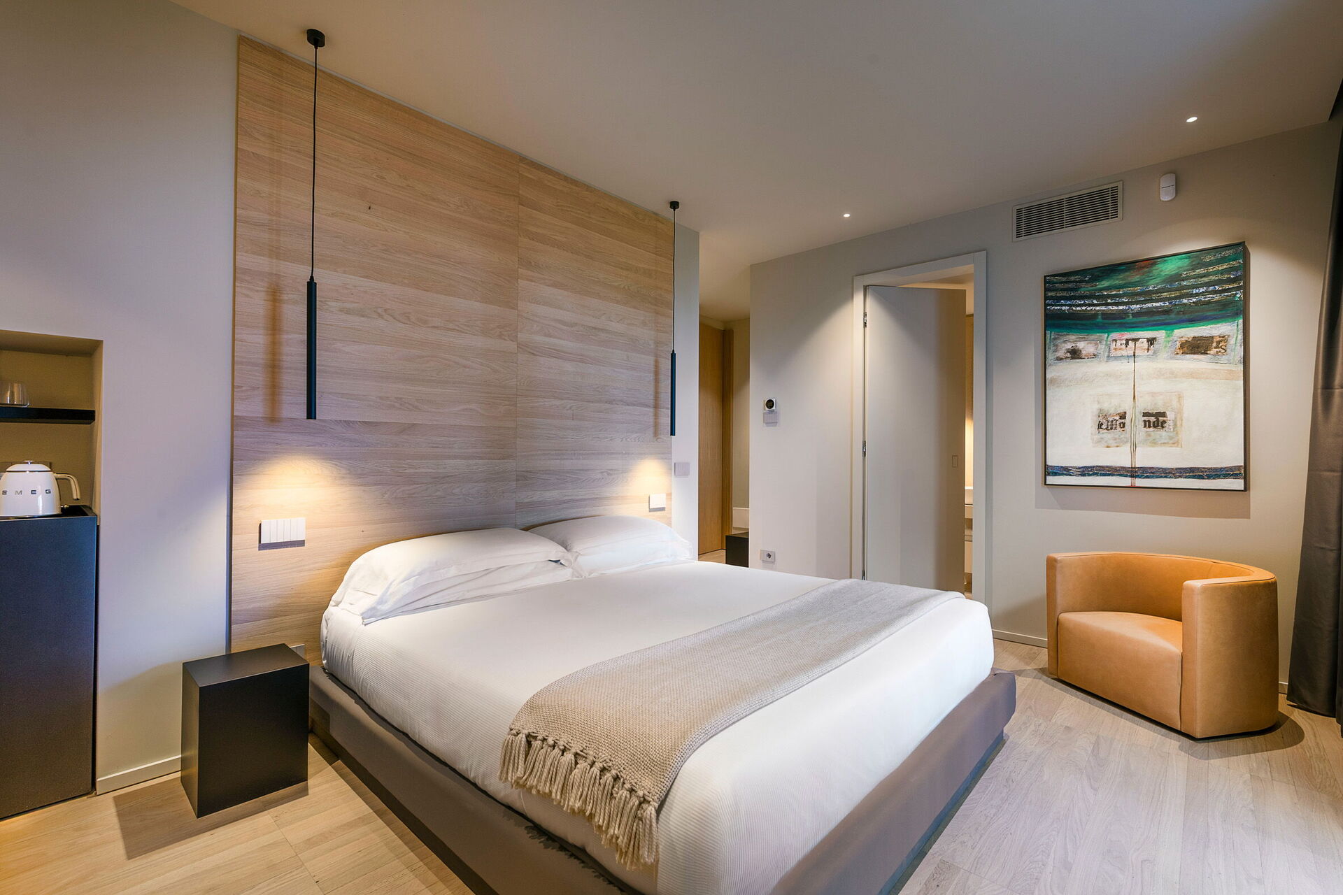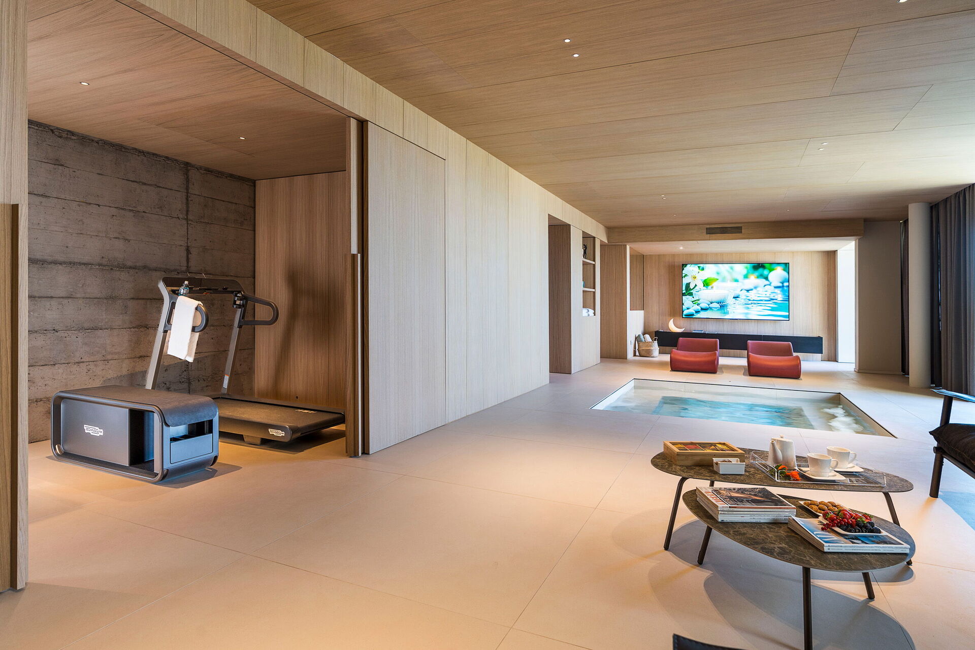 Untergeschoss: Schlafzimmer mit Doppelbett (Bettgröße: 180 x 200 cm, Minibar) und privatem Bad mit Dusche, Fitnessbereich und Wellnessbereich mit Hydromassage-Badewanne (2,70 x 2,70 Meter; Mindesttiefe: 0,40 Meter; Maximaltiefe: 0,90 Meter); auf 28° erheiztbar;
