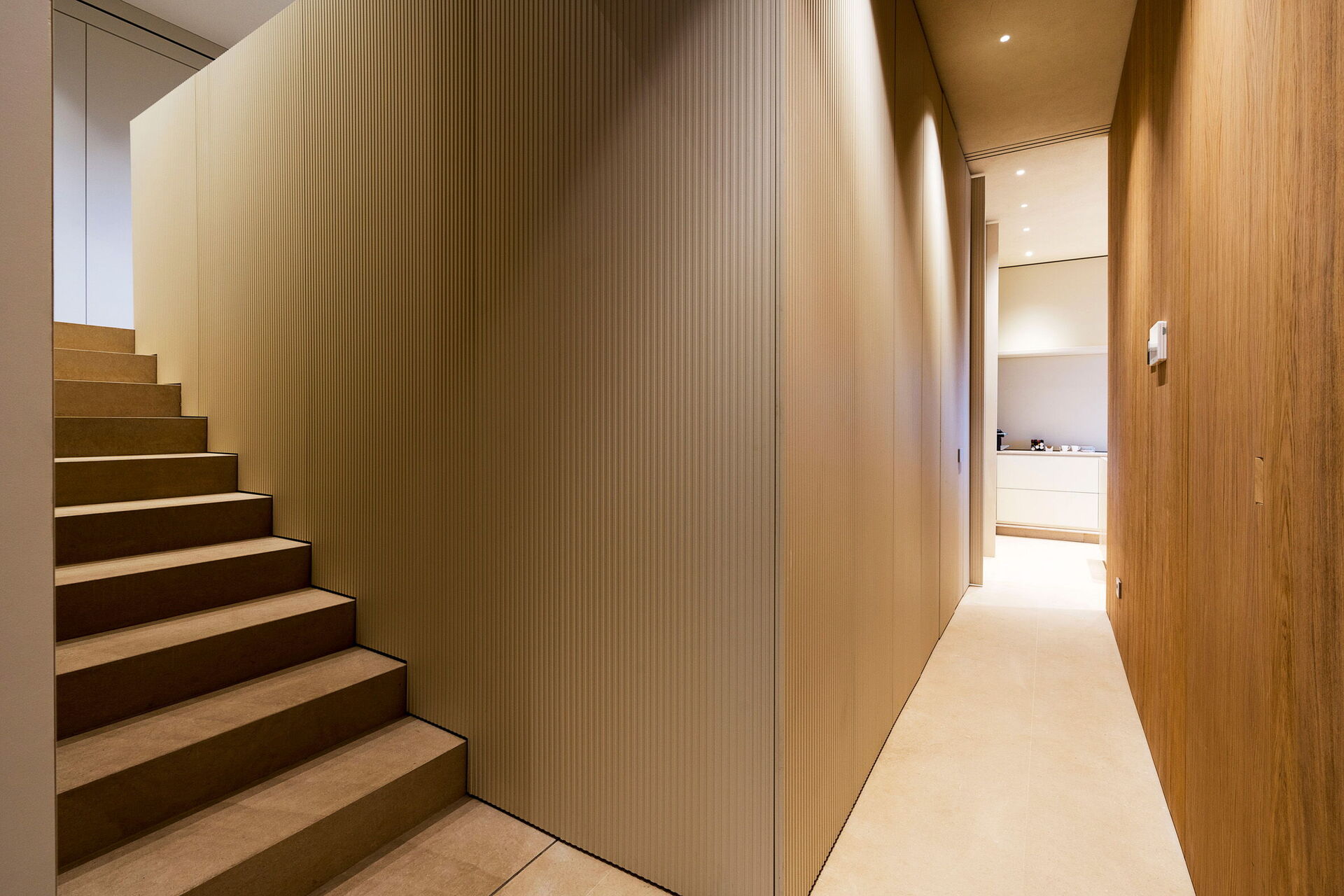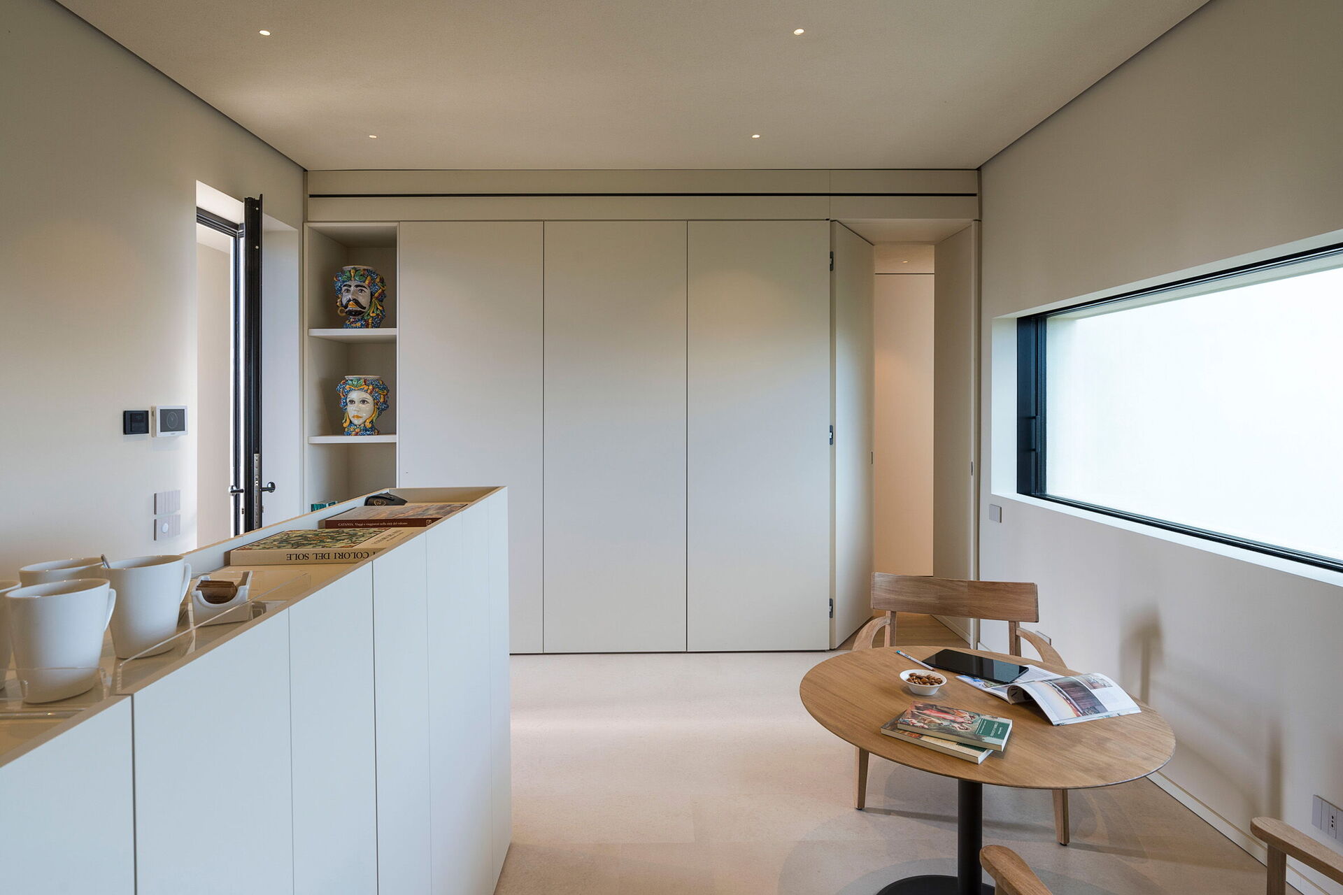 Erhöhtes Erdgeschoss: großer und heller Wohnbereich mit großen Fenstern, bestehend aus Wohnzimmer (Smart-TV) mit Essbereich mit Zugang nach draußen, Küche (Herd, Backofen, Kühlschrank, Gefrierschrank, Geschirrspüler, Mikrowelle, Toaster, Espressomaschine, amerikanische Kaffeemaschine, Toaster), Toilette, Waschküche.