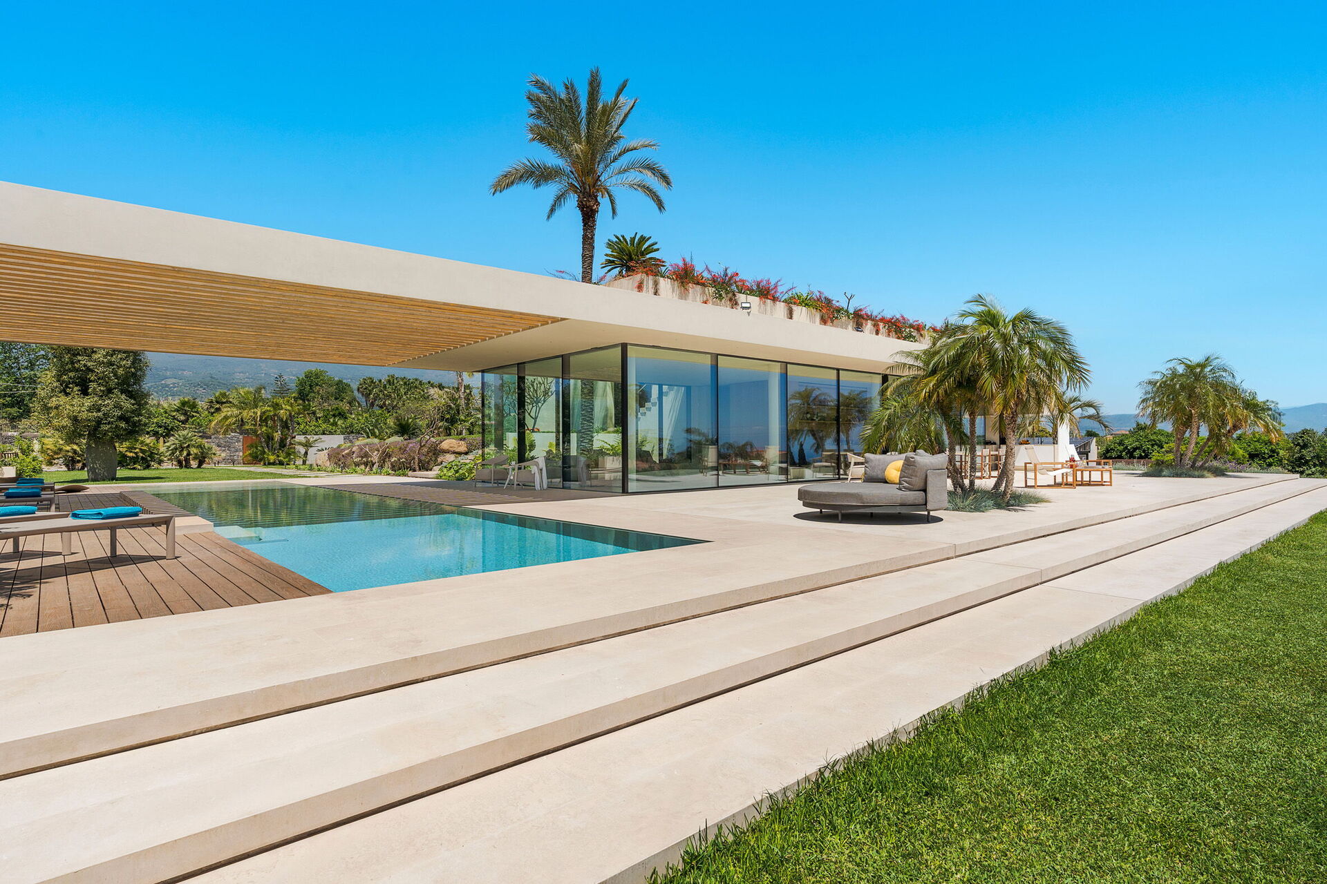 Diese exklusive Ferienvilla ist modern und luxuriös und genießt eine malerische Panoramalage mit atemberaubender Aussicht, die vom Ätna bis Taormina reicht und sowohl vom Schwimmbad als auch von den großen Terrassen und dem Garten aus bewundert werden kann.