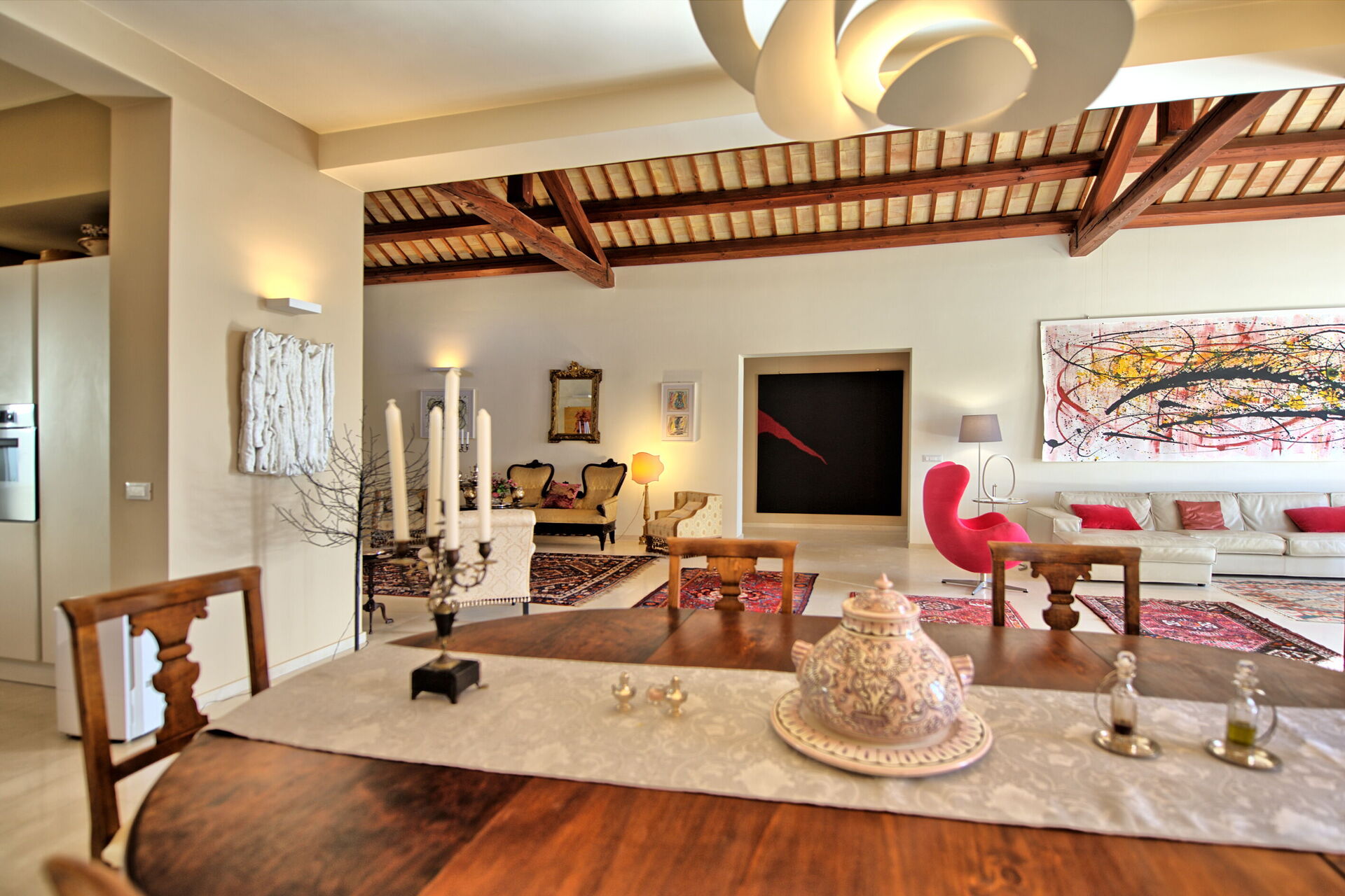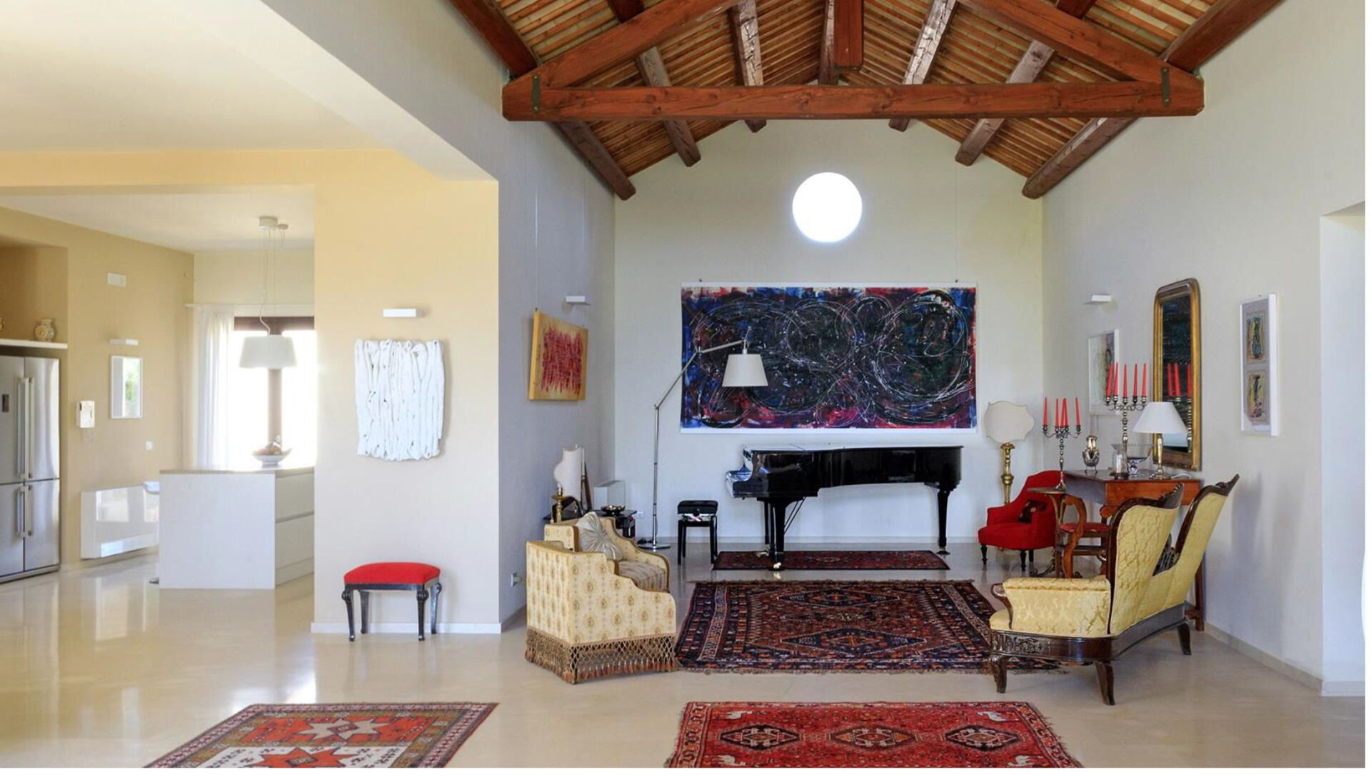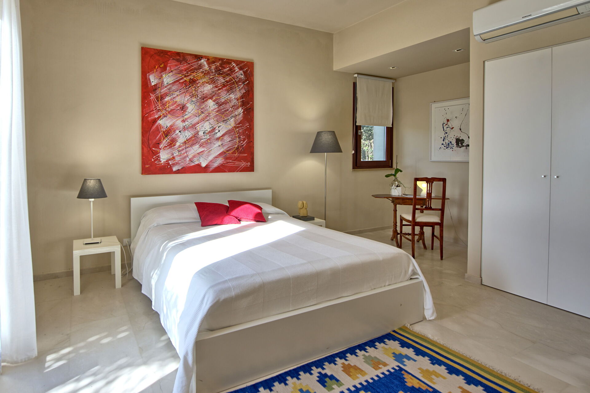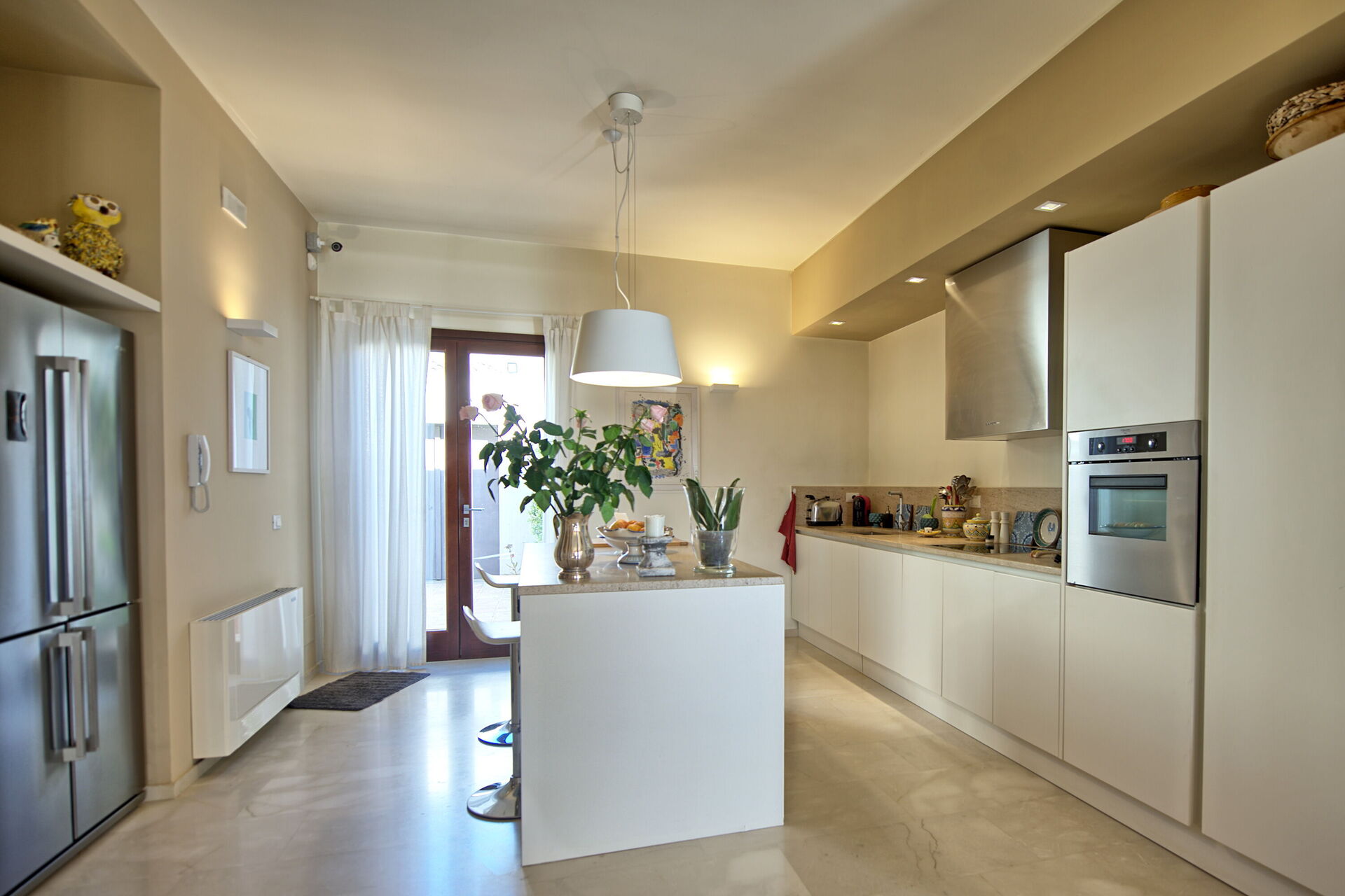Die Villa ist von einem gepflegten und üppigen Garten umgeben und die einladenden Innenräume sind mit Eleganz und Liebe zum Detail mit modernen Kunstwerken, Marmorböden, modernen Möbeln und Designerbeleuchtung in einer angenehmen Stilkombination eingerichtet.