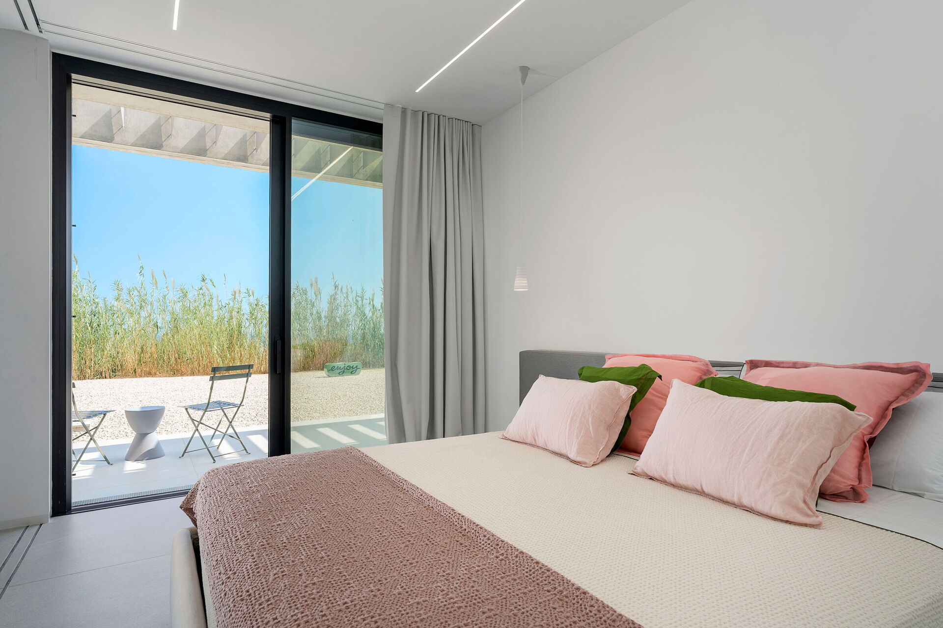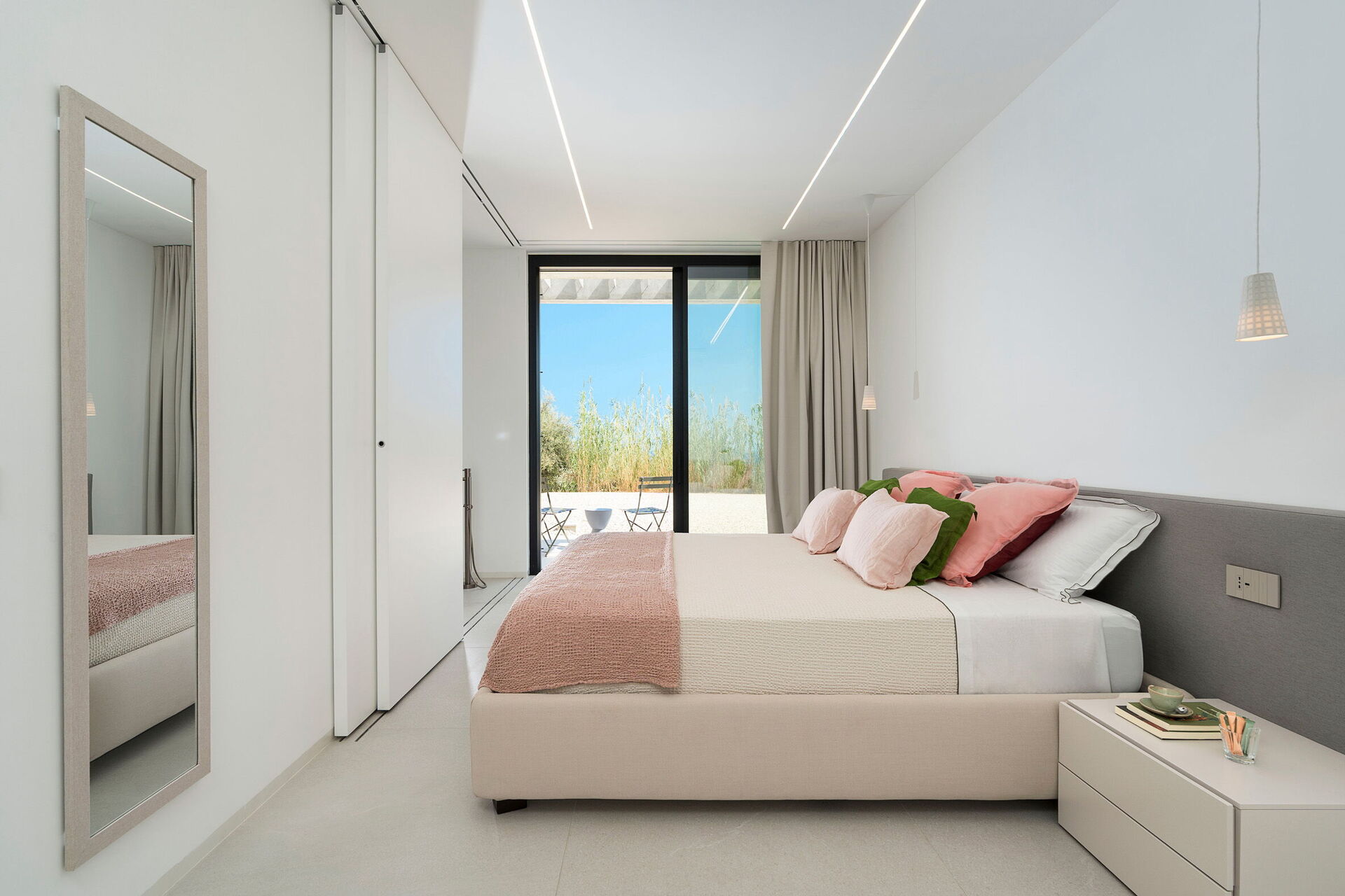 Untergeschoss: Zwei Schlafzimmer mit Doppelbett (180 x 200 cm) mit begehbaren Kleiderschränken und Badezimmern mit Badewanne und Dusche sowie ein Zweibettzimmer (120 x 200 cm) mit begehbaren Kleiderschränken und Badezimmer mit Dusche. Die Schlafzimmer sind sehr hell und alle haben Zugang ins Freie (auch die im Untergeschoss). Klimaanlage ist im gesamten Haus vorhanden.