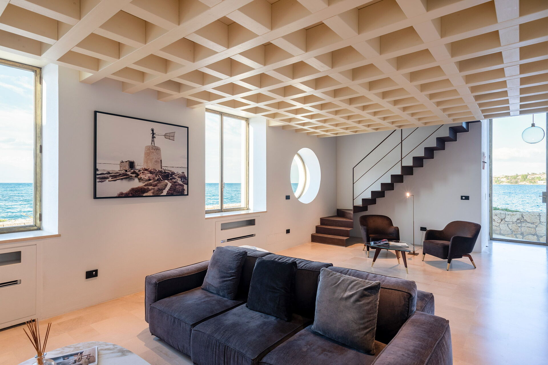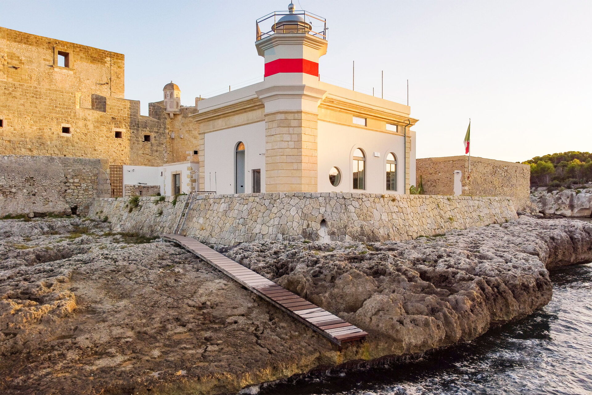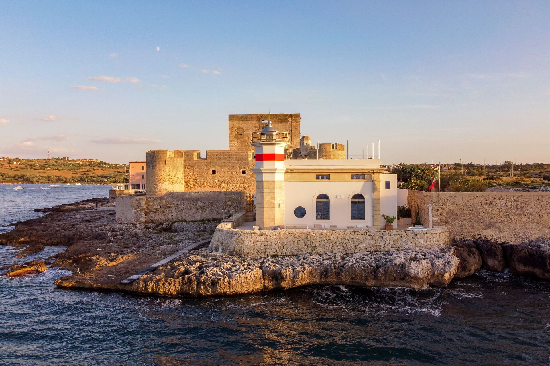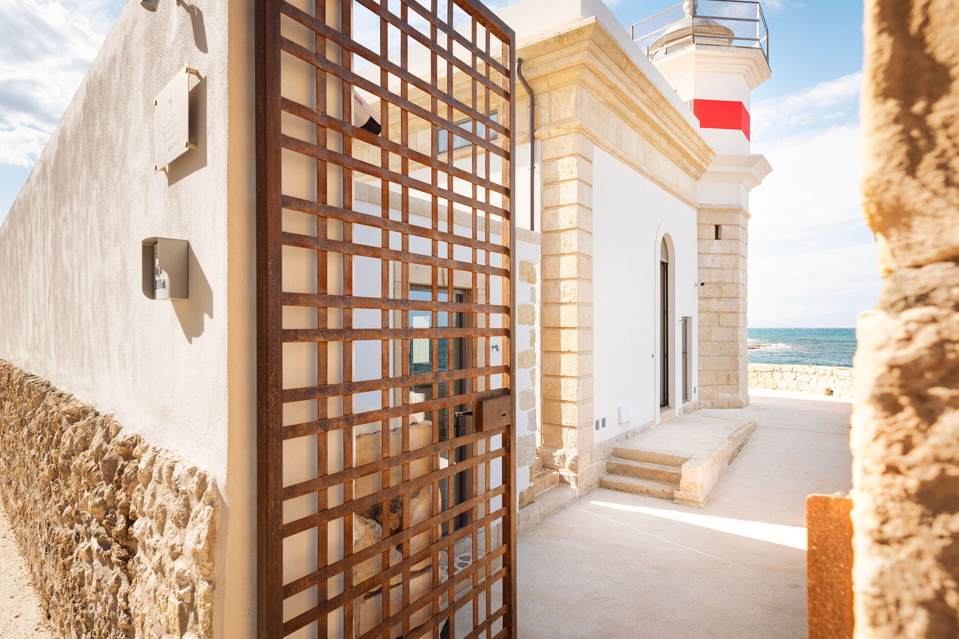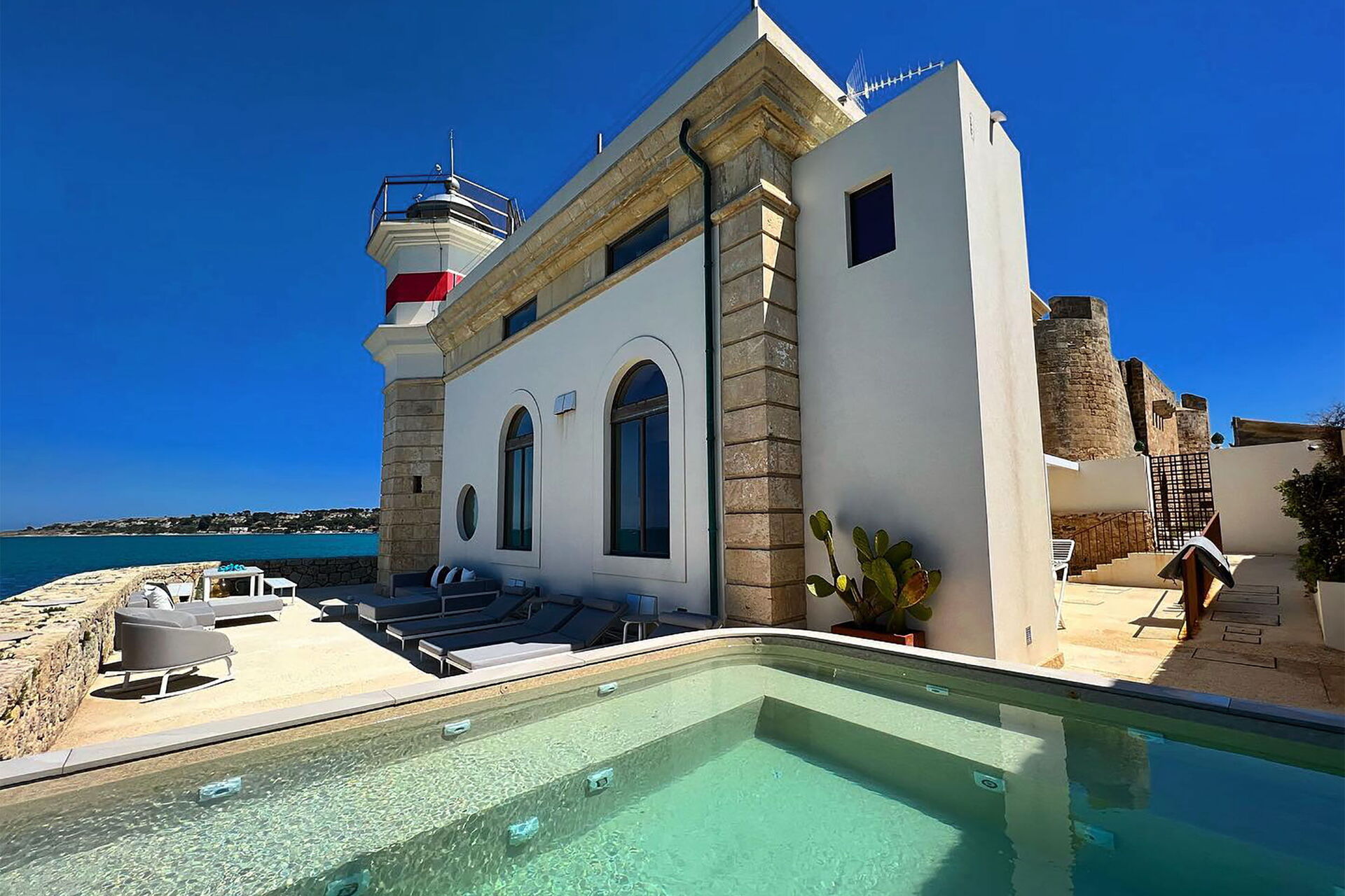 Villa il Faro ist ein Anwesen auf einer Klippe mit Blick auf das Meer in Brucoli an der Ostküste Siziliens: Die Villa verfügt über eine ausgestattete Panoramaterrasse auf dem Dach und ist über eine Außentreppe erreichbar, genau wie es einst der Leuchtturmwärter gemacht hat. Die Leuchtröhre funktioniert noch, und das alles macht das Anwesen noch faszinierender.