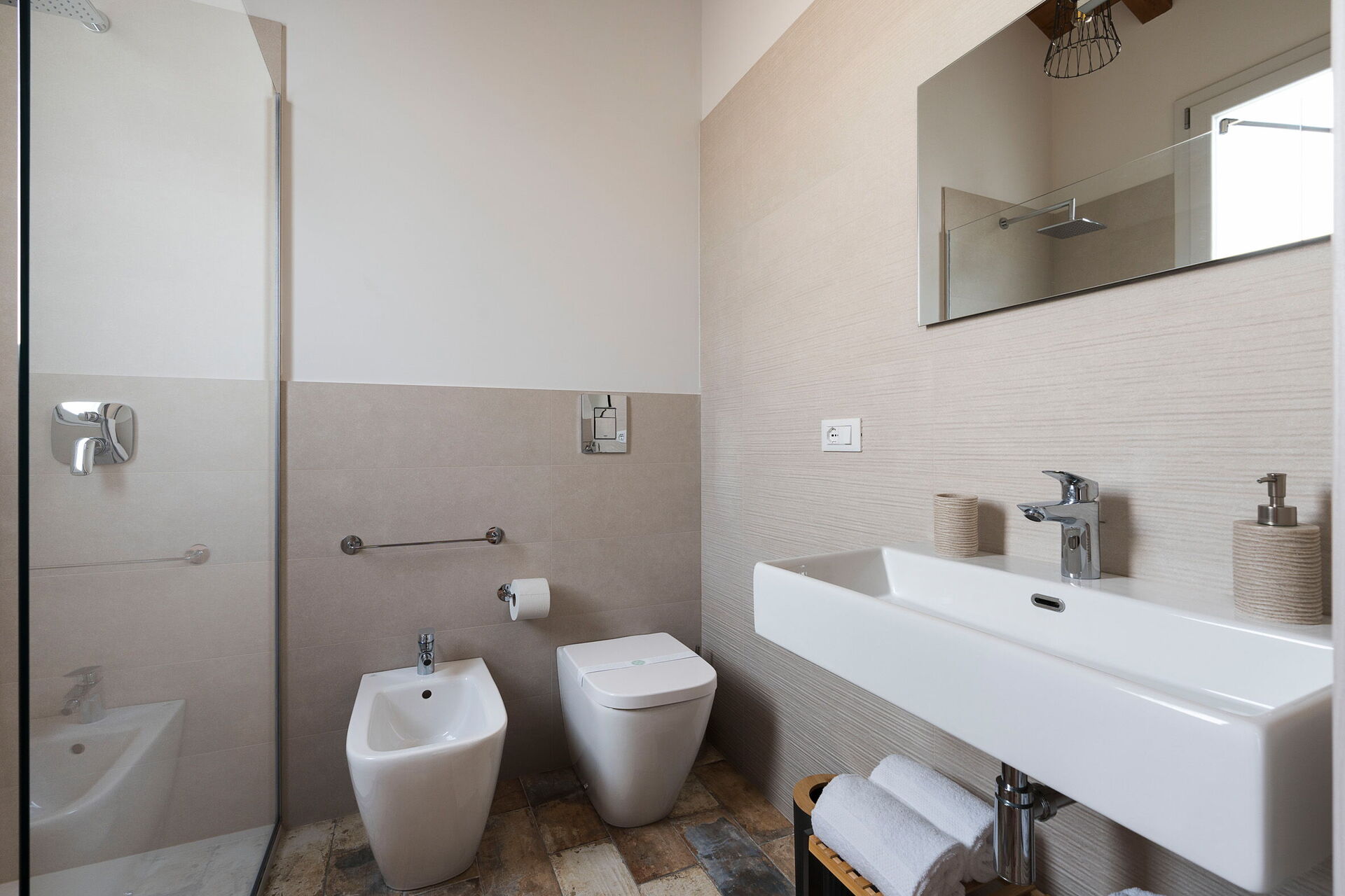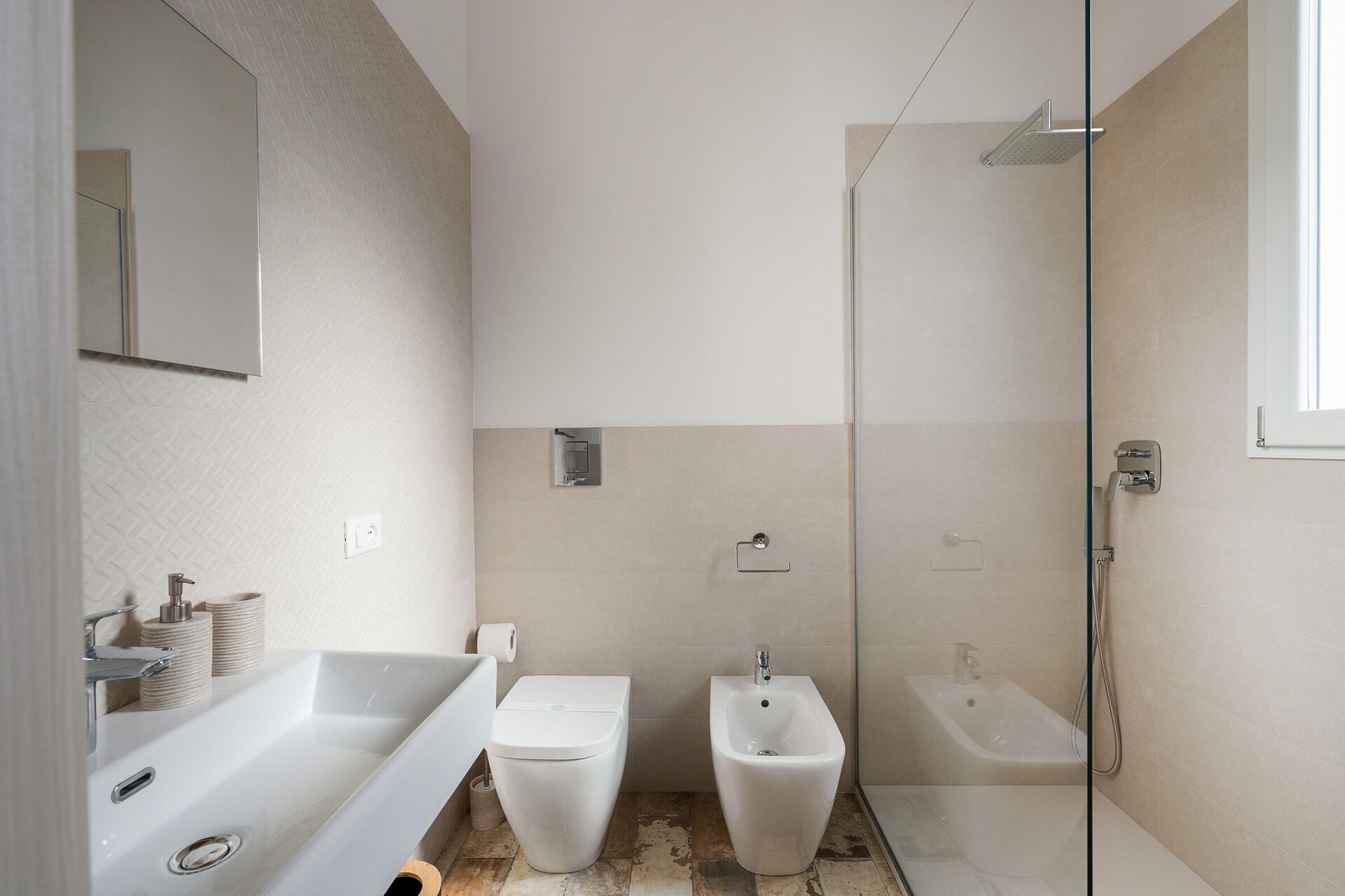 Erdgeschoss: Wohnzimmer (Klimaanlage, TV) mit Essbereich und Küche (Herd, Backofen, Kühlschrank, Gefrierschrank, Geschirrspüler, Mikrowelle, Toaster, Espressomaschine, amerikanische Kaffeemaschine), 1 WC, 3 Doppelzimmer (Bettgröße: 160 x 200 cm; Klimaanlage), jeweils mit privatem Bad mit Dusche.