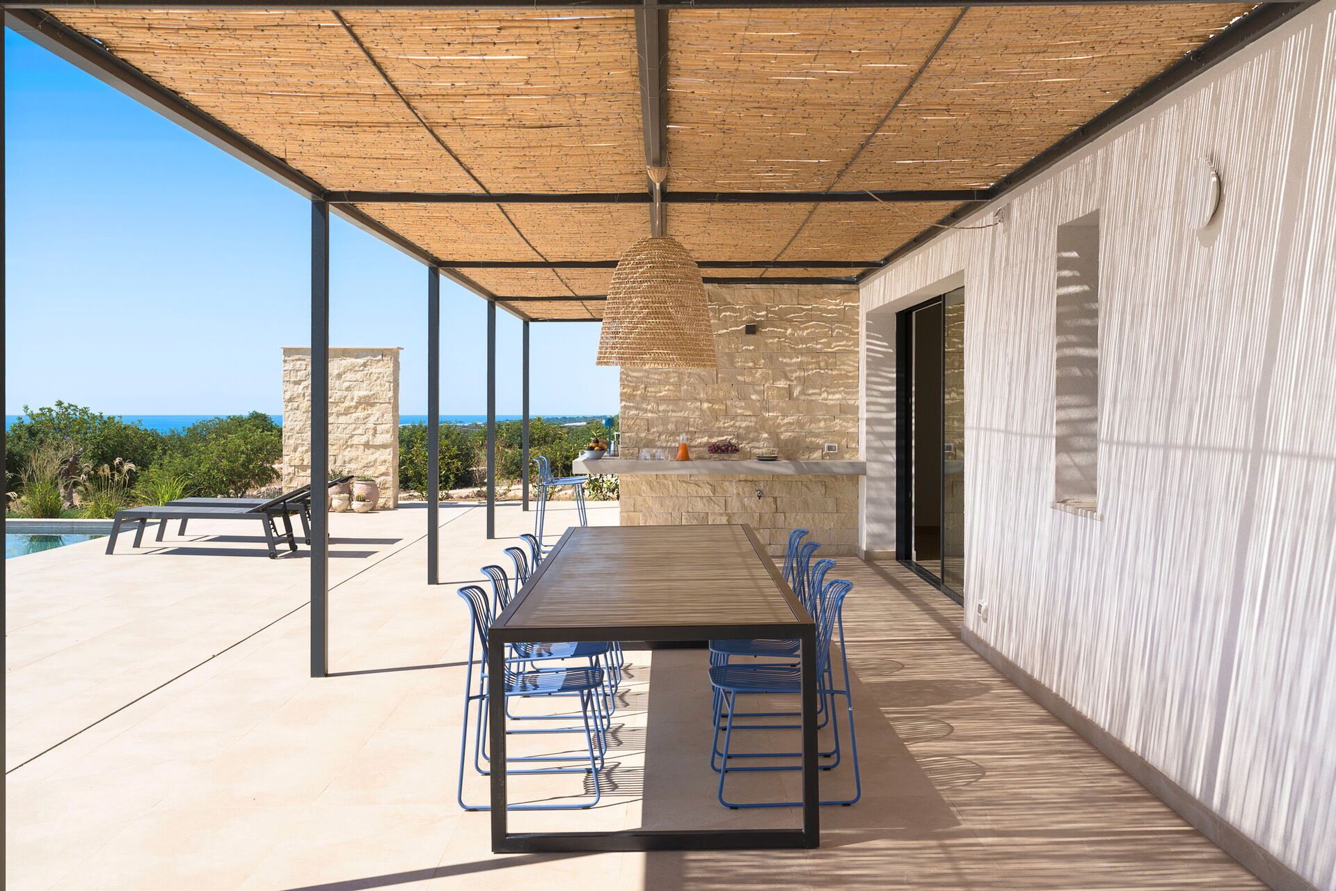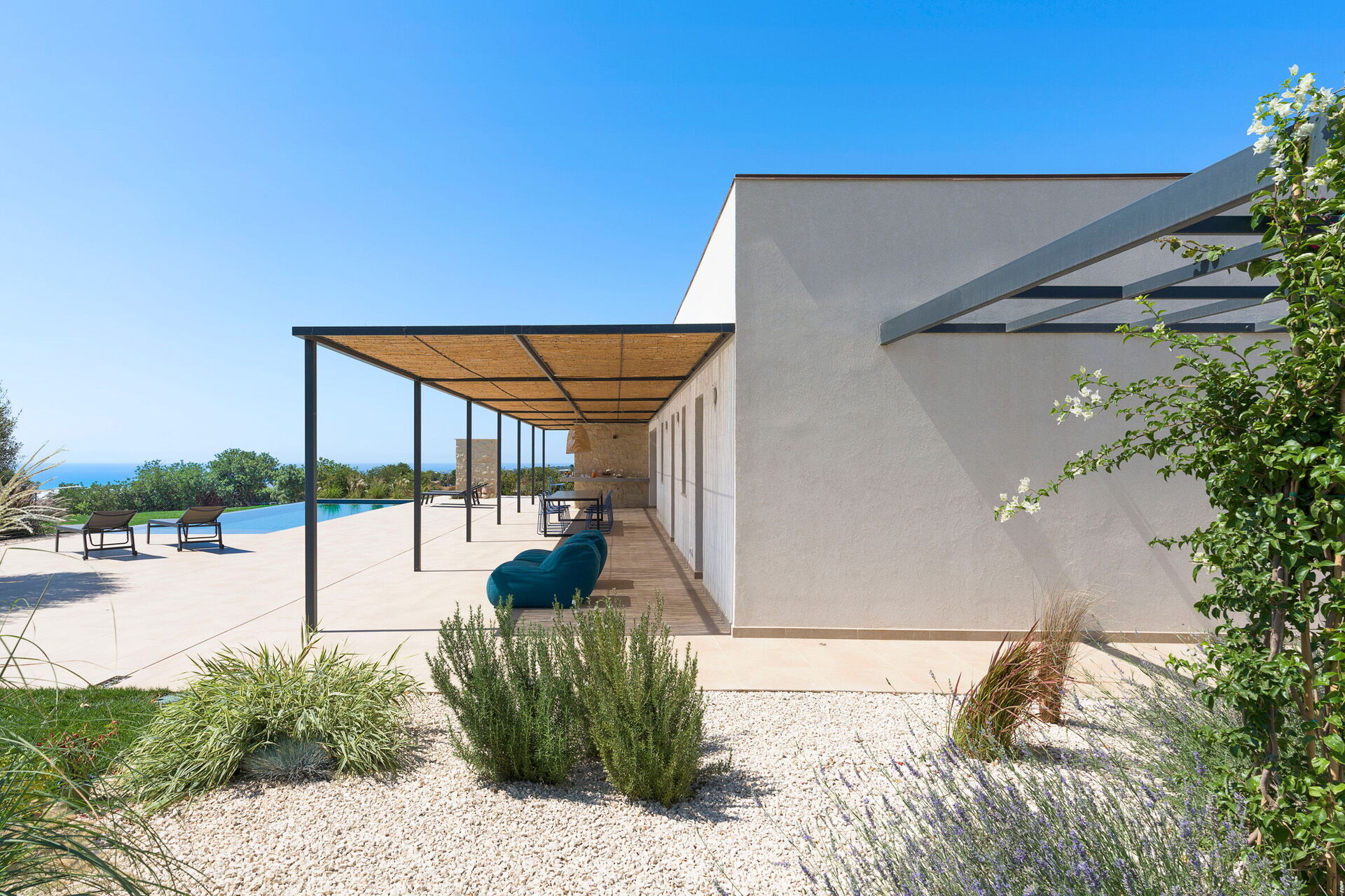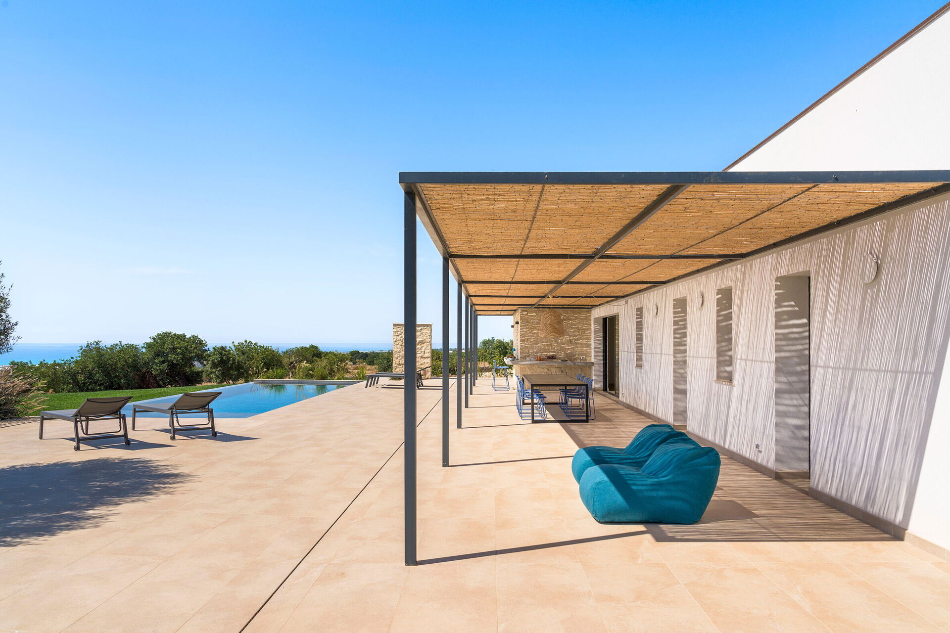 Diese exklusive Ferienvilla in der Nähe von Scicli (spektakuläre Barockstadt, UNESCO-Weltkulturerbe) genießt eine ruhige und malerische Lage mit atemberaubendem Blick auf die herrliche umliegende Landschaft, die Landschaft und das Meer, das sowohl vom Schwimmbad, als auch von der großen Terrasse aus bewundert werden kann Terrassen.