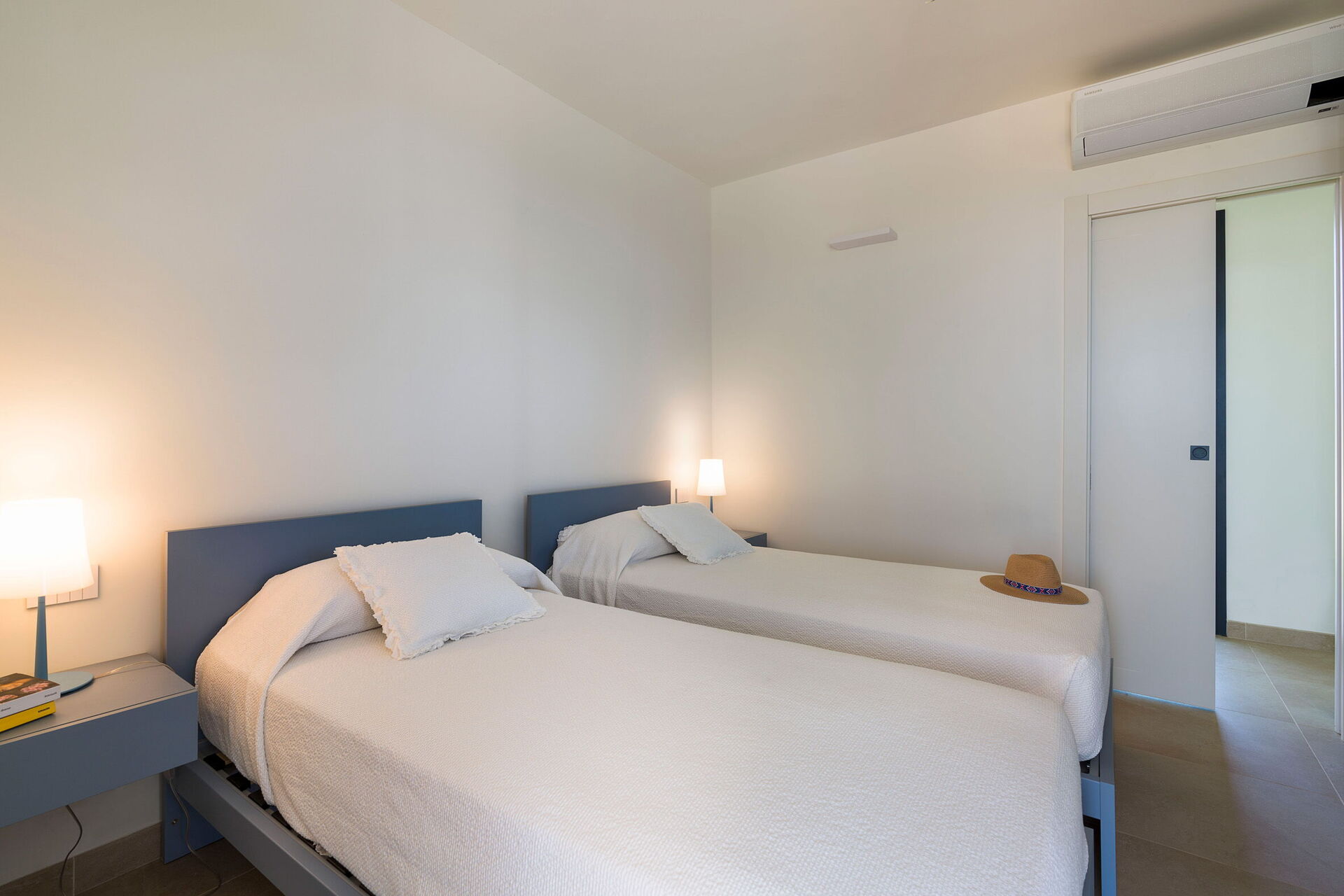 Erdgeschoss: Panorama-Wohnzimmer (TV) mit Esszimmer, Küche (Herd, Backofen, Gefrierschrank, Kühlschrank, Geschirrspüler, Kaffeemaschine, Toaster), Zweibettzimmer (Klimaanlage), Badezimmer mit Dusche, 2 Doppelzimmer (Klimaanlage) jeweils mit privatem Bad mit Dusche.