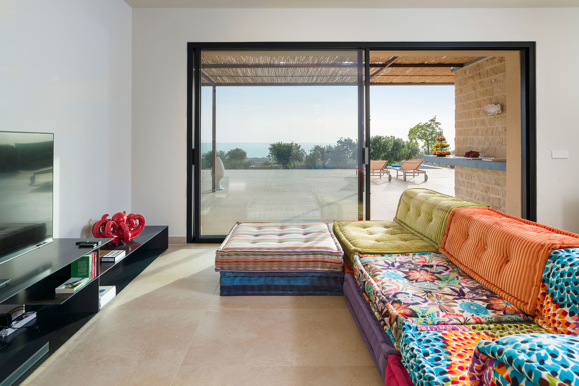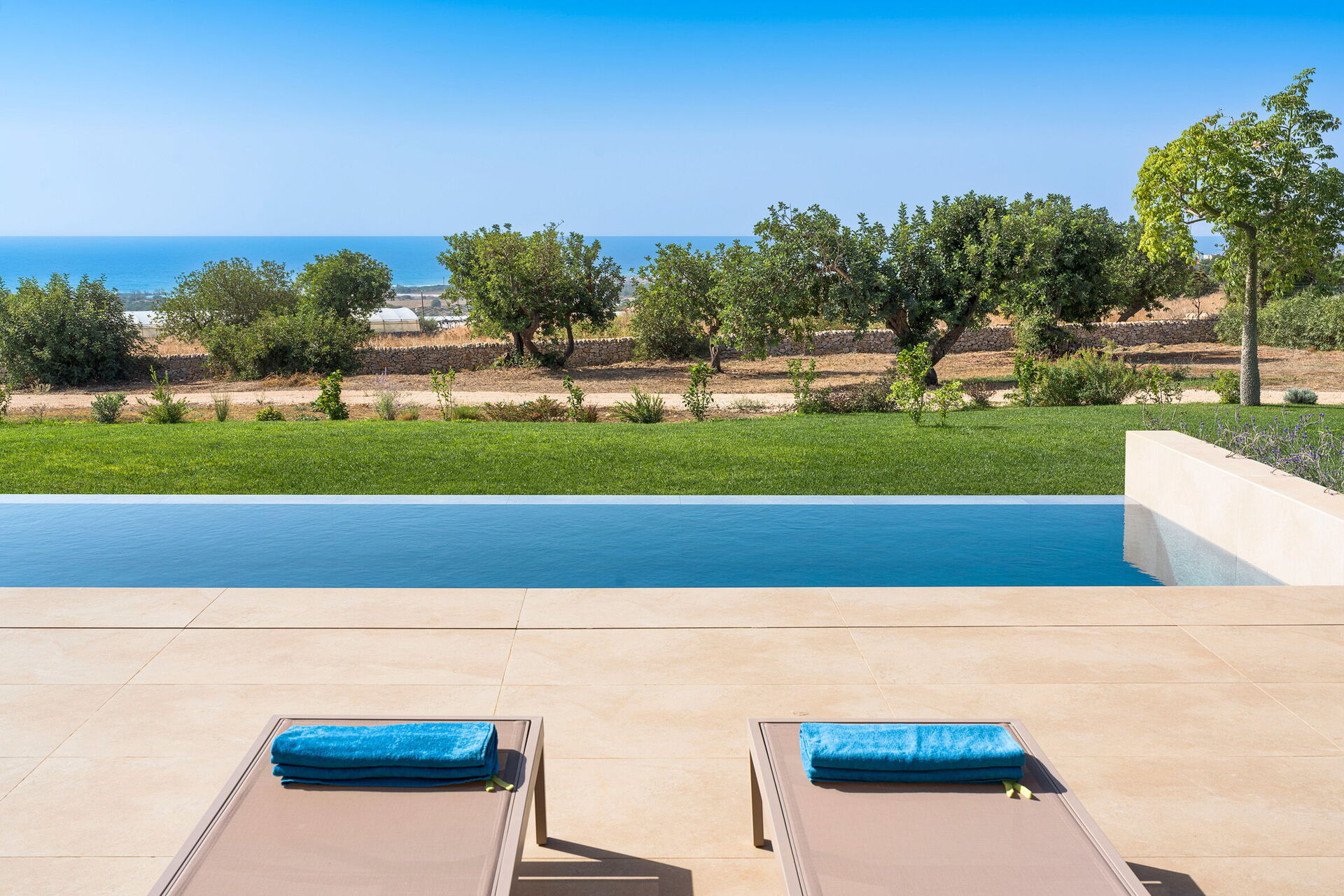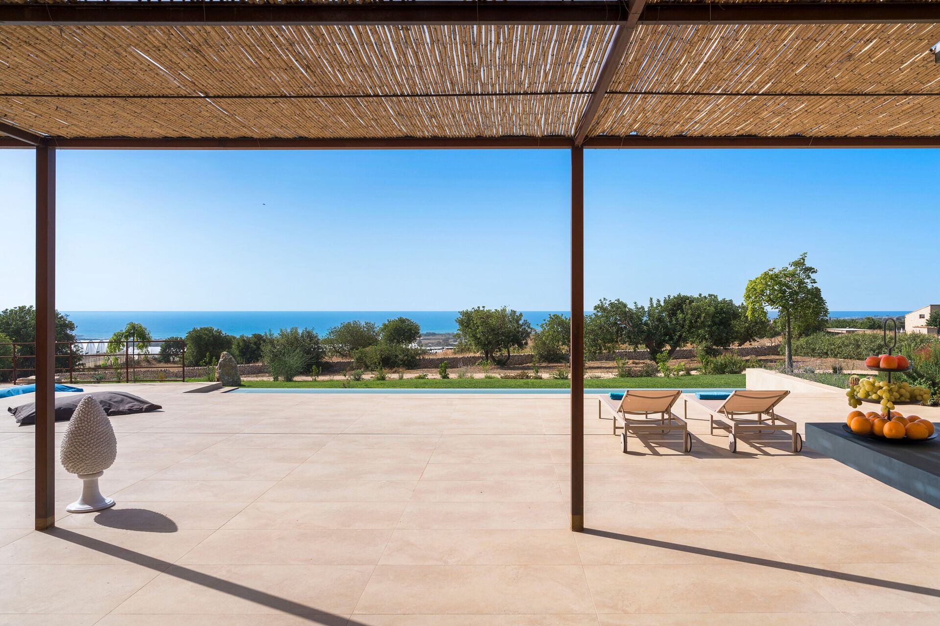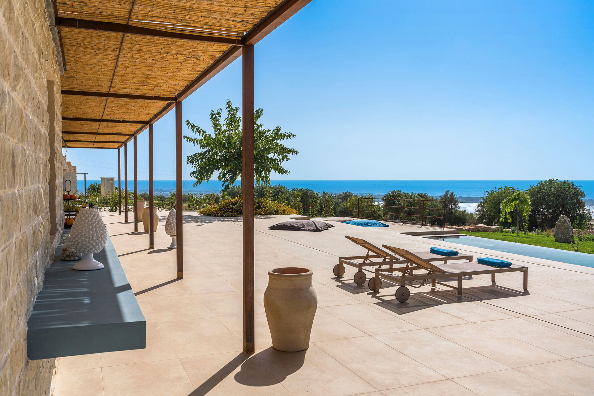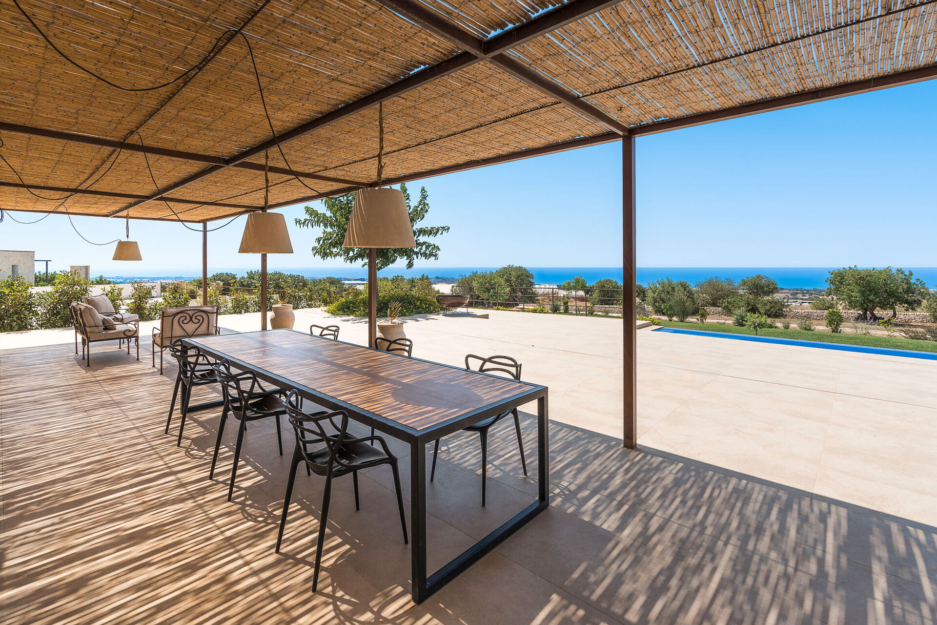 Diese exklusive Ferienvilla in der Nähe von Scicli (spektakuläre Barockstadt, UNESCO-Weltkulturerbe) genießt eine ruhige und malerische Lage mit atemberaubendem Blick auf die herrliche umliegende Landschaft, die Landschaft und das Meer, das sowohl vom Schwimmbad, als auch von der großen Terrasse aus bewundert werden kann Terrassen.