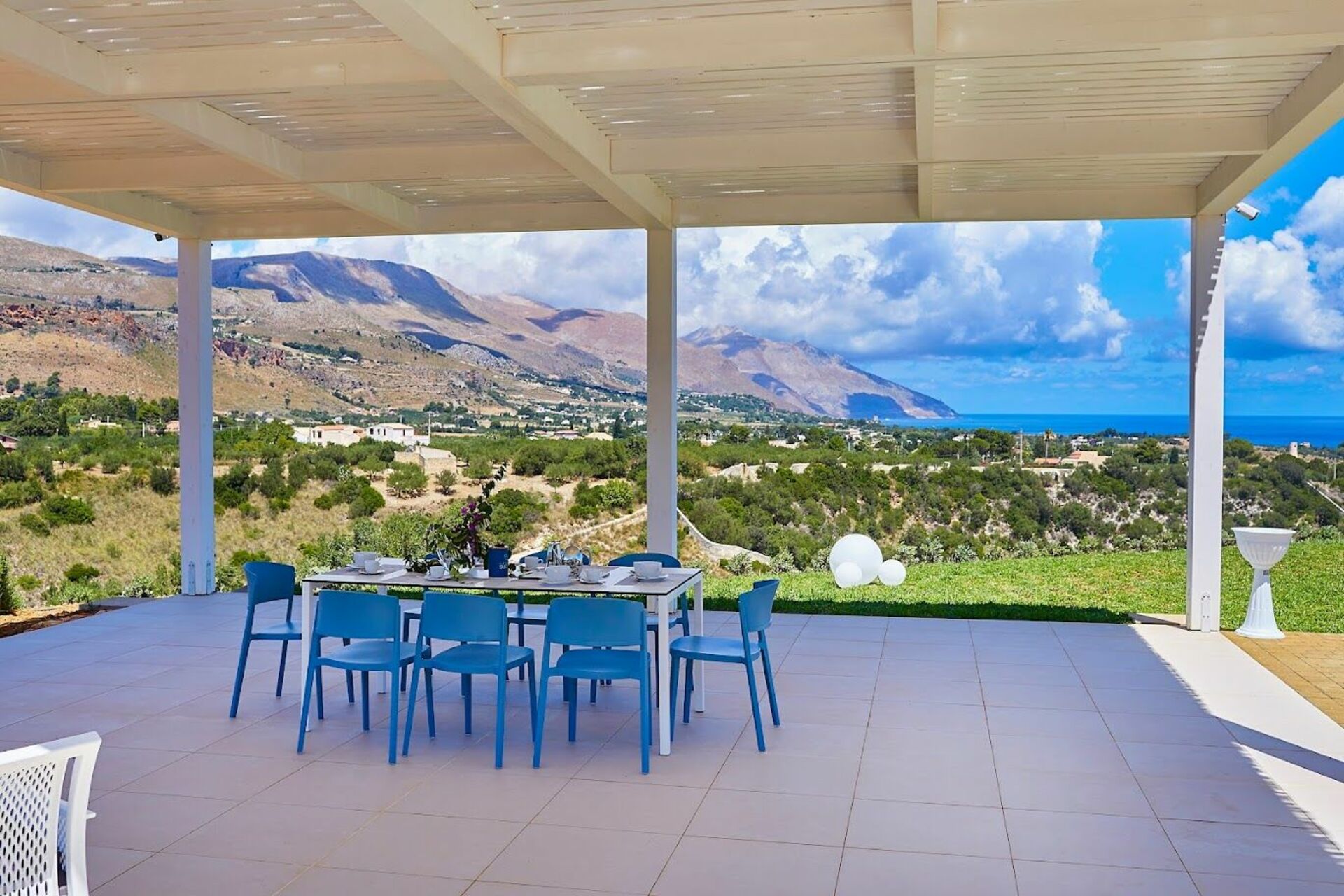 Villa Etesiae ist von einer wunderschöne Landschaft umgeben von wo der Meerblick Sie verzaubern wird: Eine große Terrasse beherbergt einen wunderschönen Swimmingpool (mit Hydromassage-Ecke) mit Blick auf das Meer und die sizilianische Landschaft.