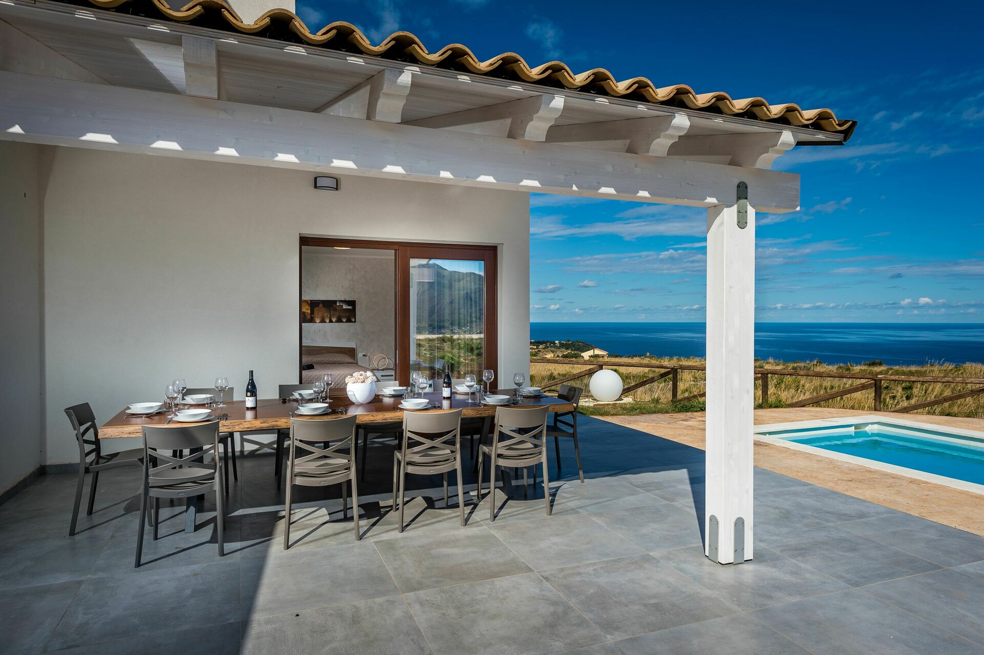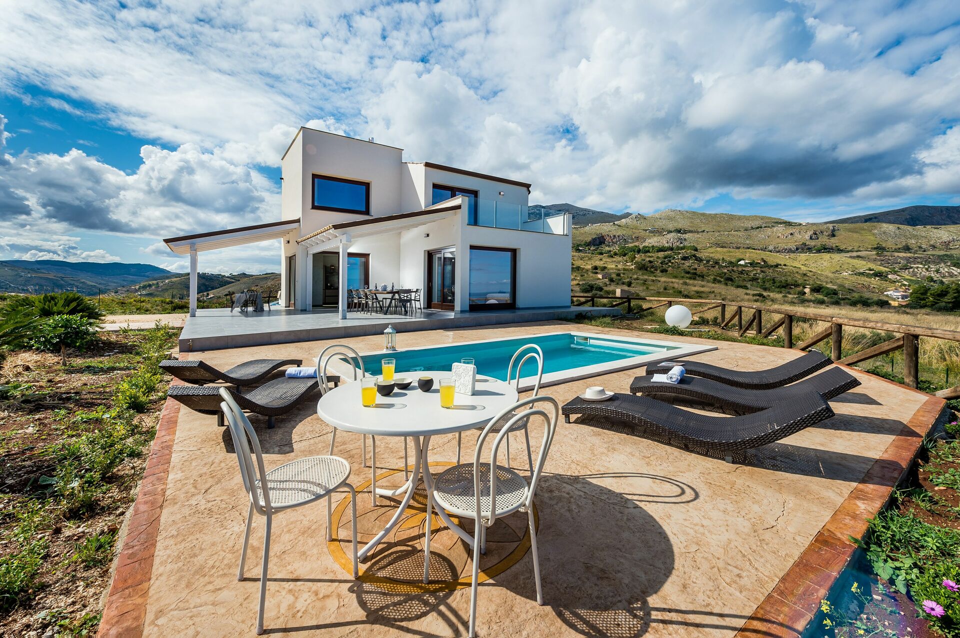 Moderne Villa zur Miete mit privatem Pool und 4 Schlafzimmern in Sizilien, nur 6 km vom wunderschönen Dorf Scopello entfernt, das auf der ganzen Welt für seine alte "Tonnara" (eine traditionelle Art, Thunfisch zu fangen) bekannt ist.