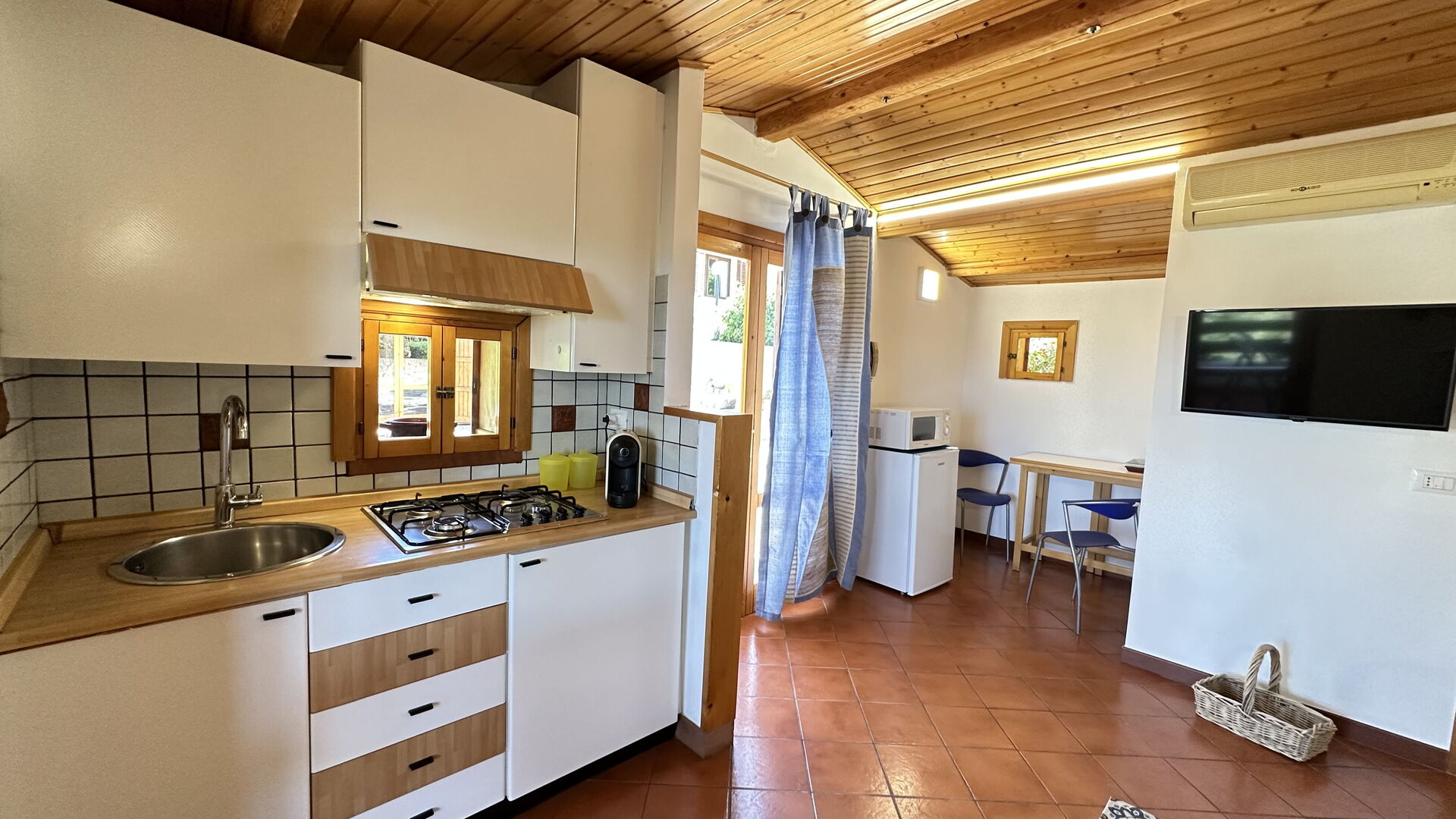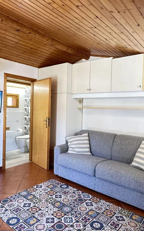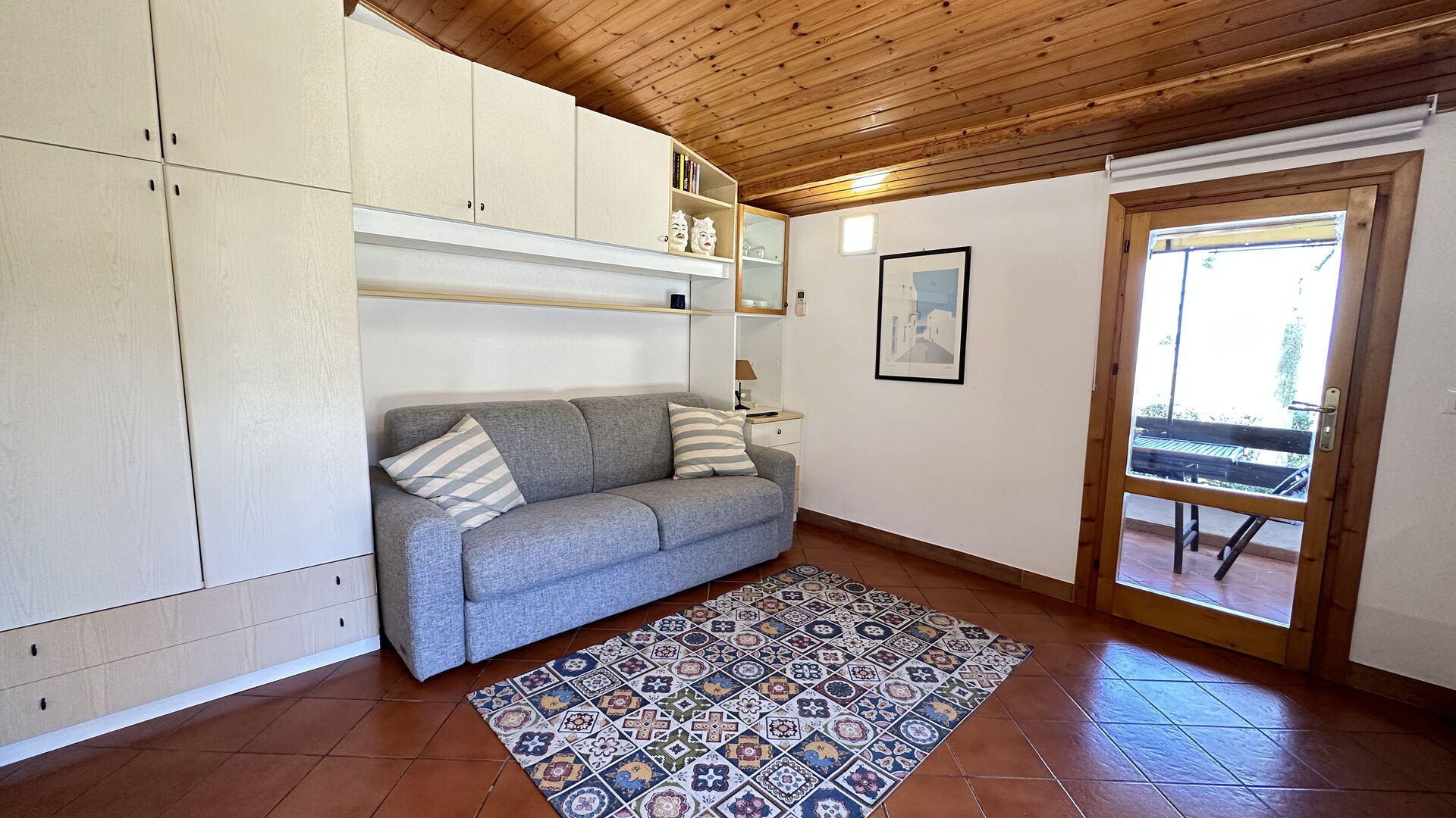 Erdgeschoss (Einzimmerwohnung): Wohnzimmer mit Doppelbettcouch und Kochecke (Gefrierschrank), Bad mit Dusche.