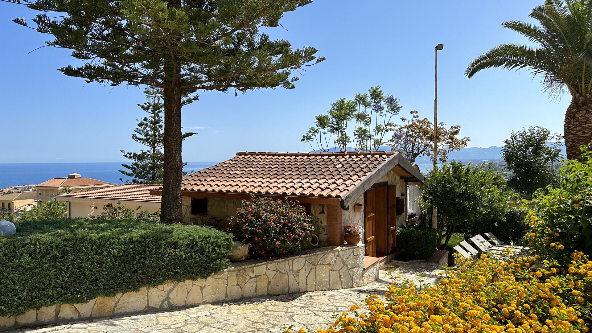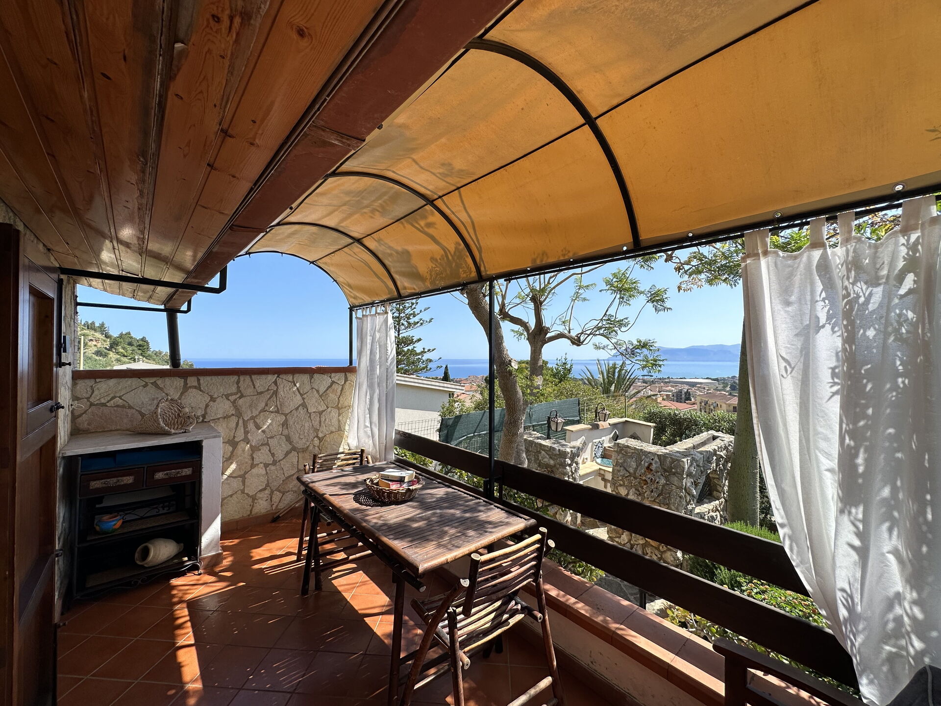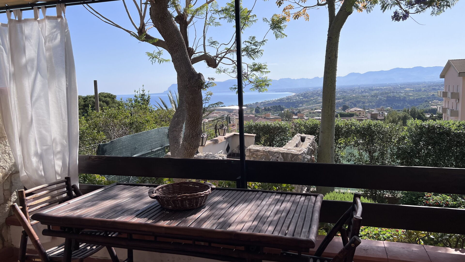 Lichtdurchflutete Veranda mit Panoramablick auf das Meer.