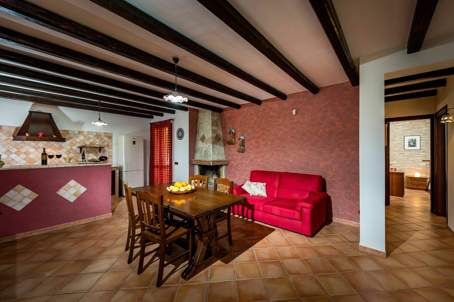 Zugang vom offenen Wohnzimmer mit Essbereich, Sofa und Kamin, Einbauküche mit Frühstücksplatte und ausgestattet (5 Flammen, Backofen, Kühl-/Gefrierschrank etc.)