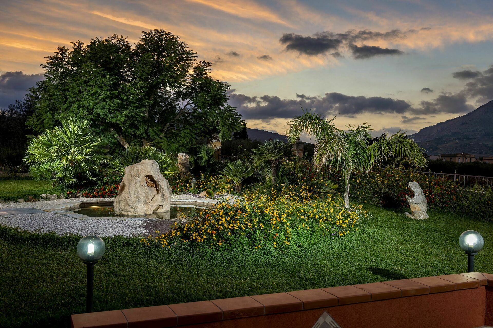 Das Anwesen ist umgeben von einem ca. 1000 m2 großen grünen Garten, teilweise mit englischem Rasen und Zierpflanzen bewachsen .