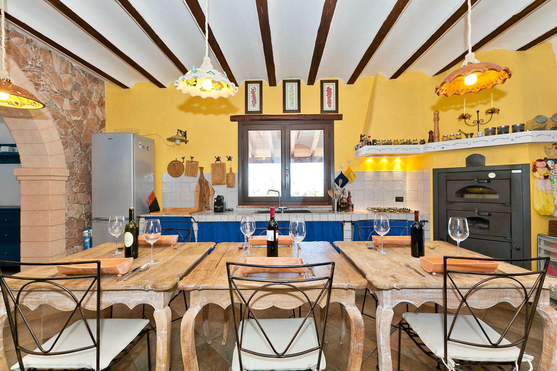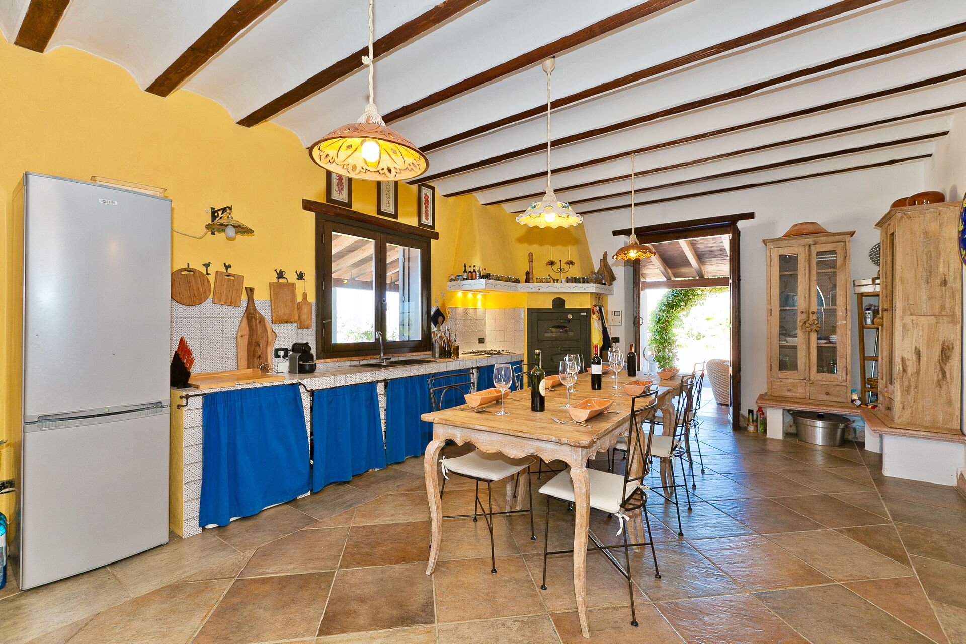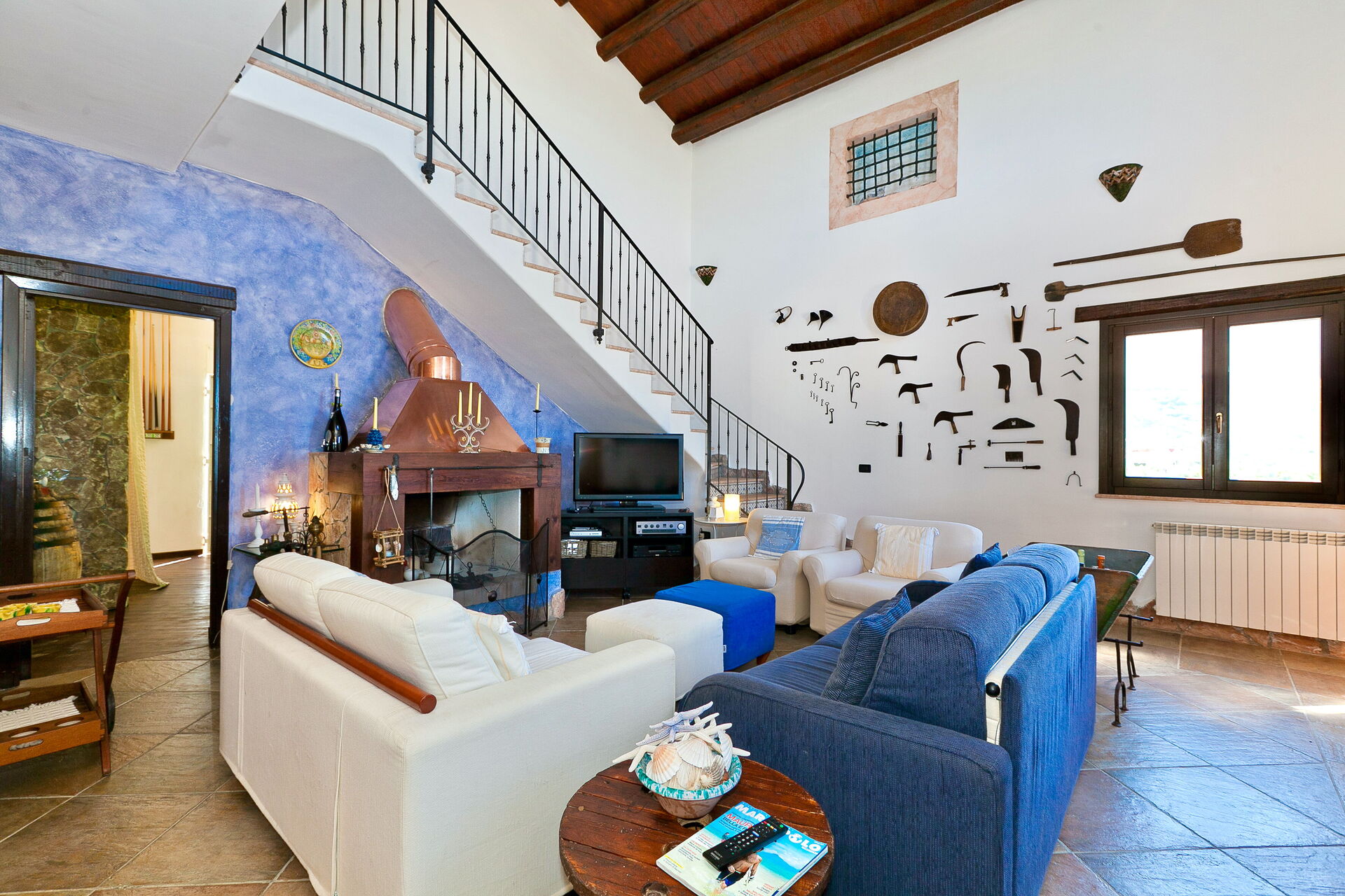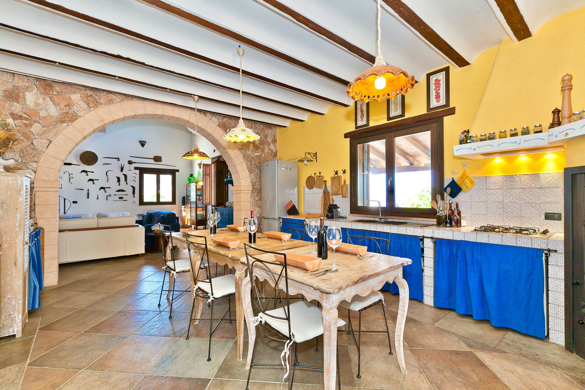 Die Innenausstattung ist in typisch traditioneller Art gehalten mit Materialien wie Holz, Terrakotta und Majolika-Fliessen. Diese Materialien machen die Räume des Hauses warm, einladend und elegant.