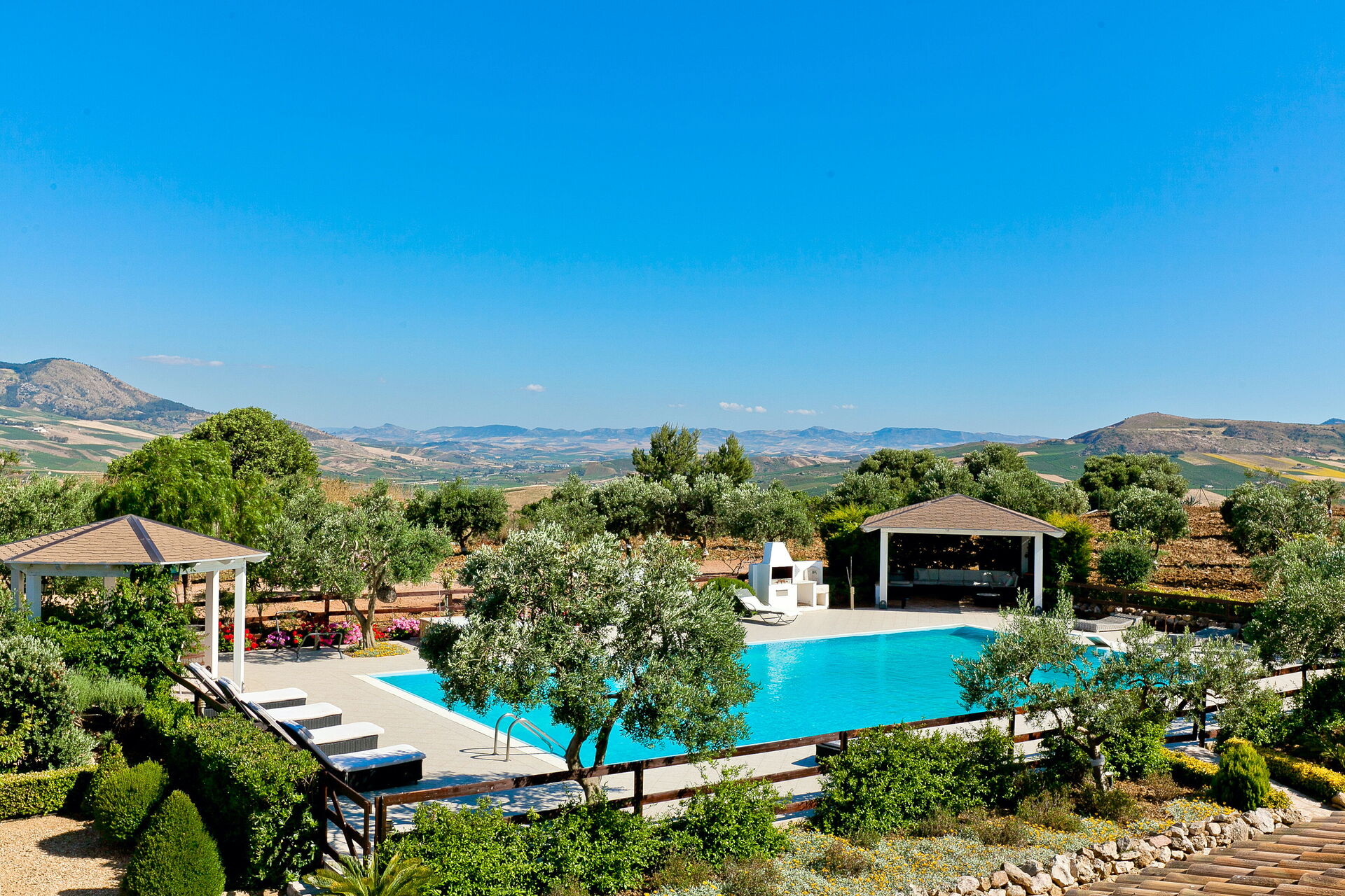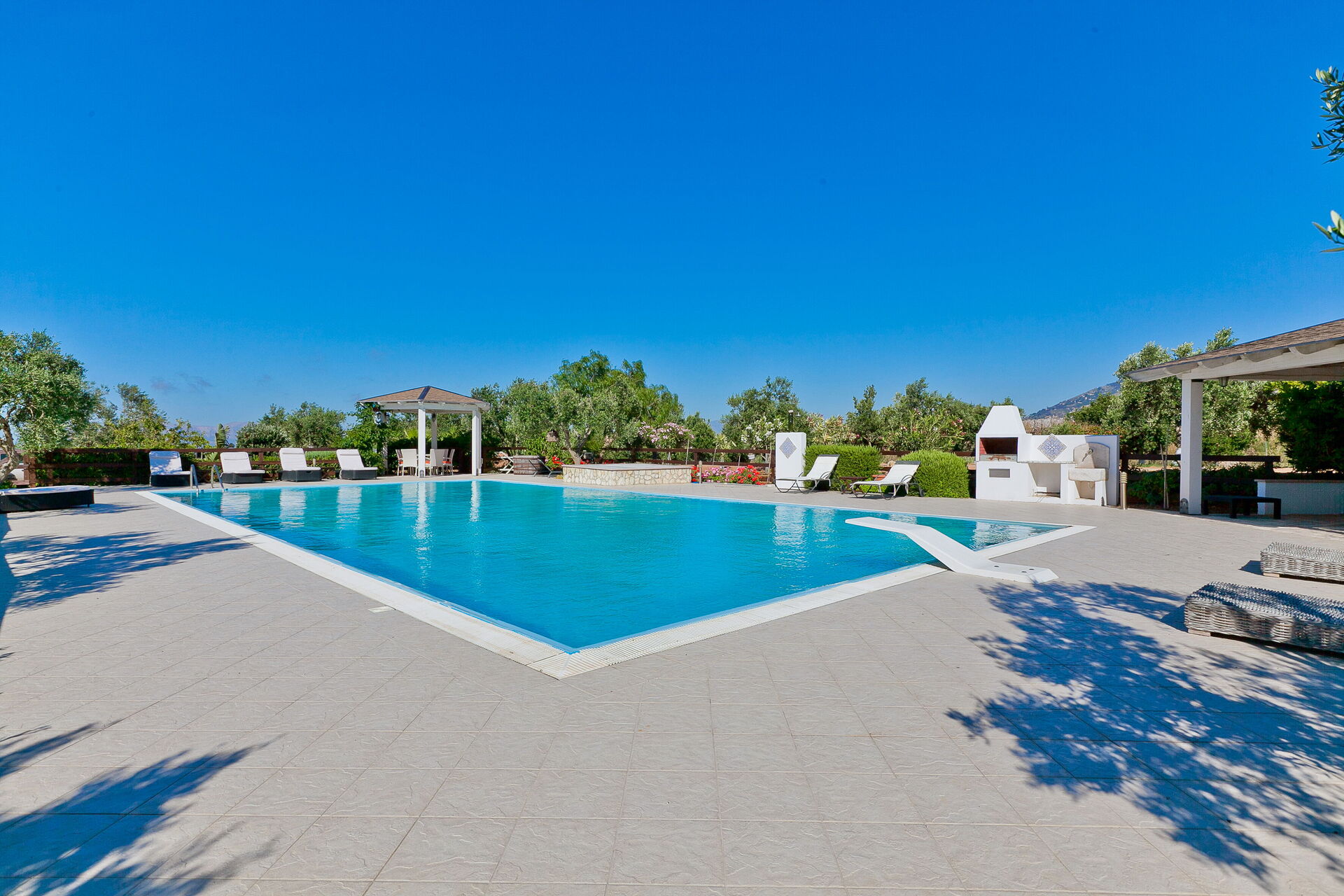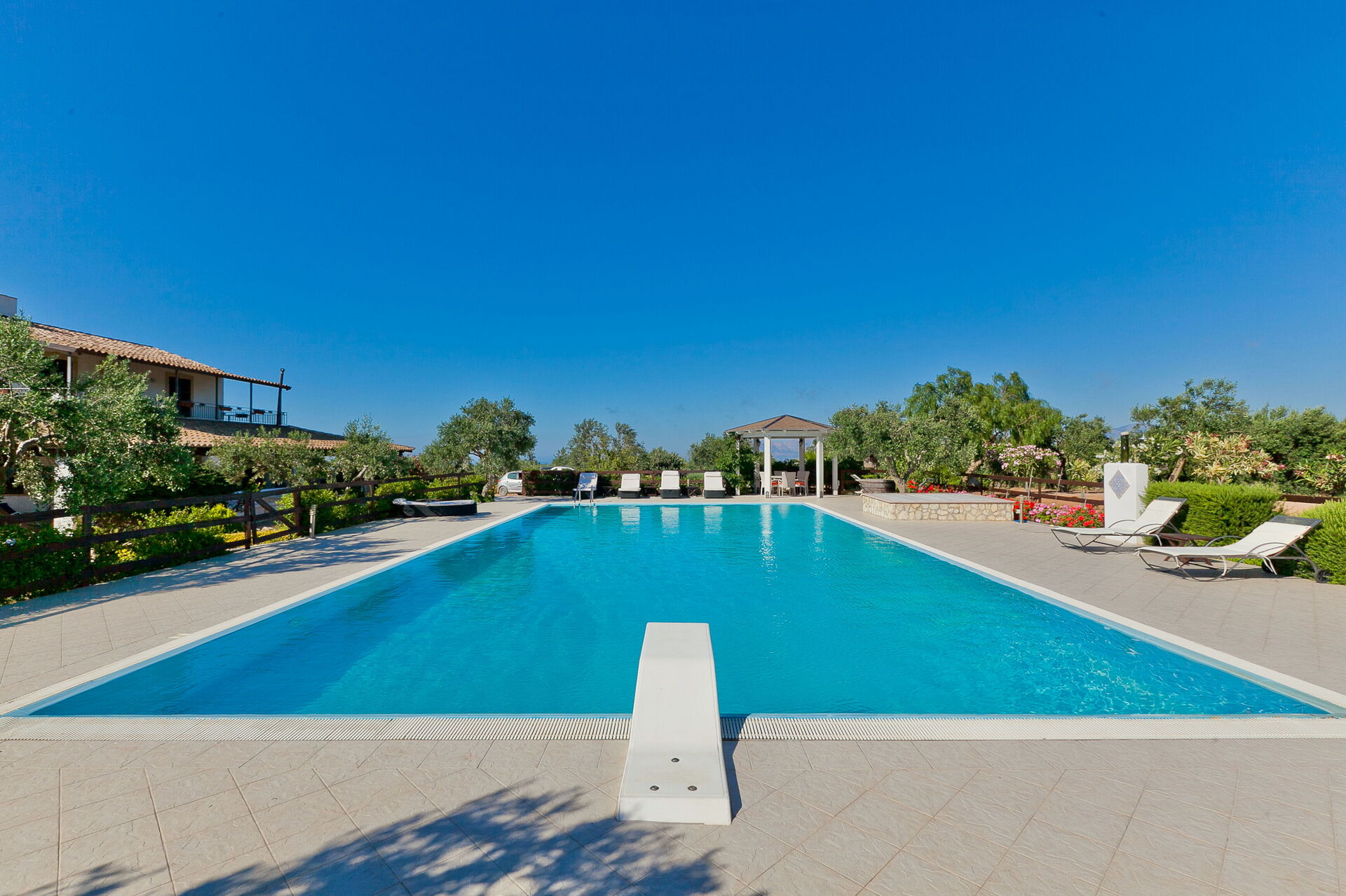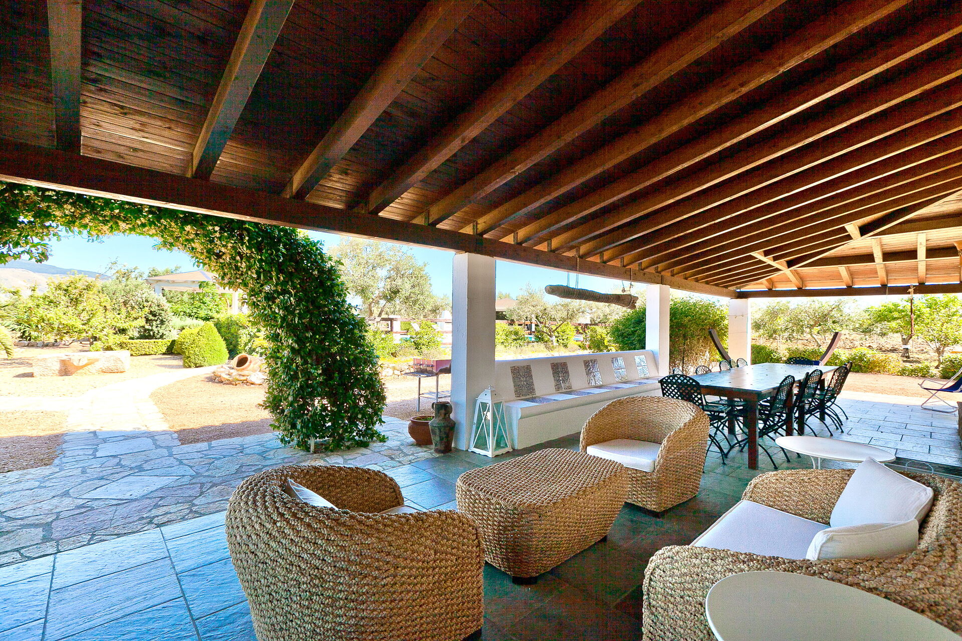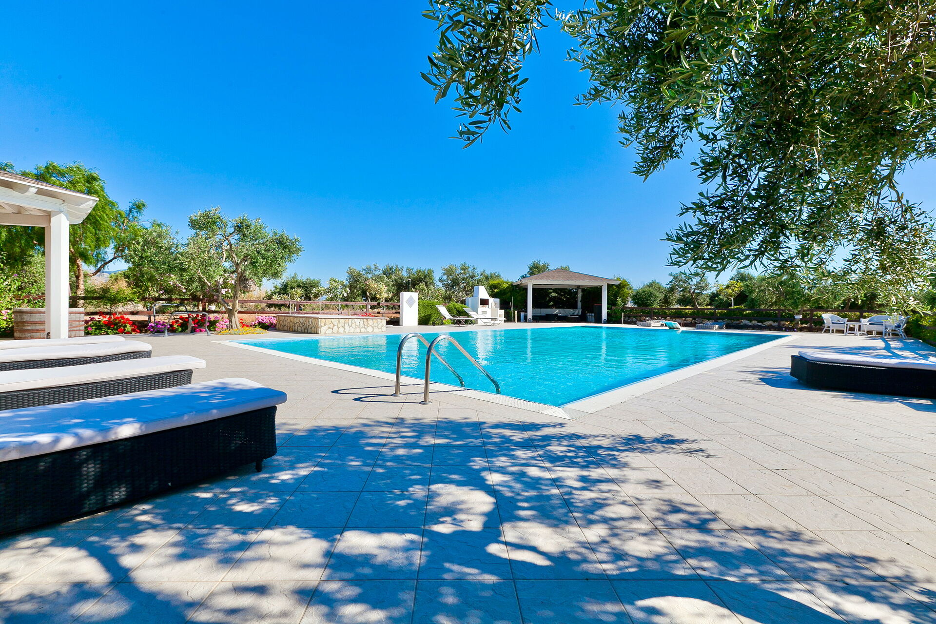 Das Erdgeschoss der Villa ist von überdachten Terrassen umgebenauf denen man sich wunderbar erholen kann. Das schöne Schwimmbad (20 x 10 m) befindet sich vor dem Haus und ist mit Pavillon und Sesseln und Sofas, sowie Liegestühlen ausgestattet. Hier kann man wunderbare Moment in absoluter Privatsphäre geniessen.